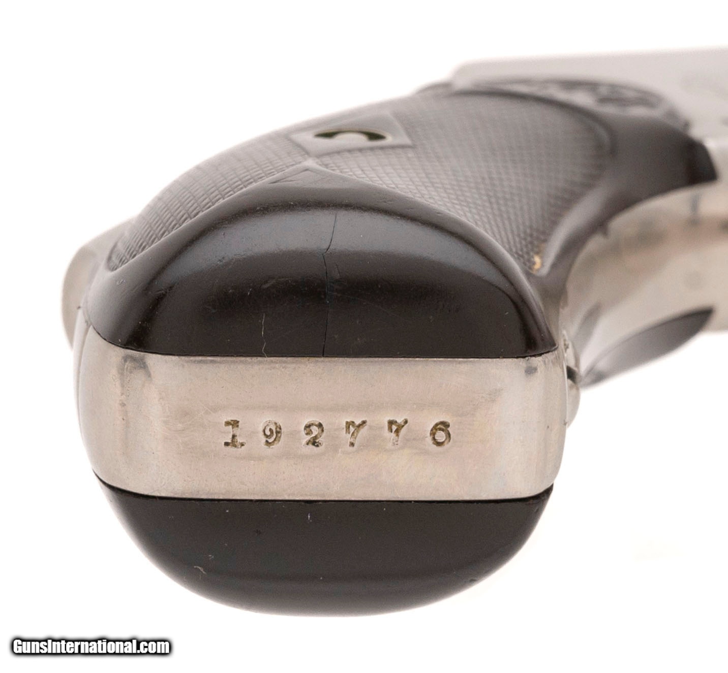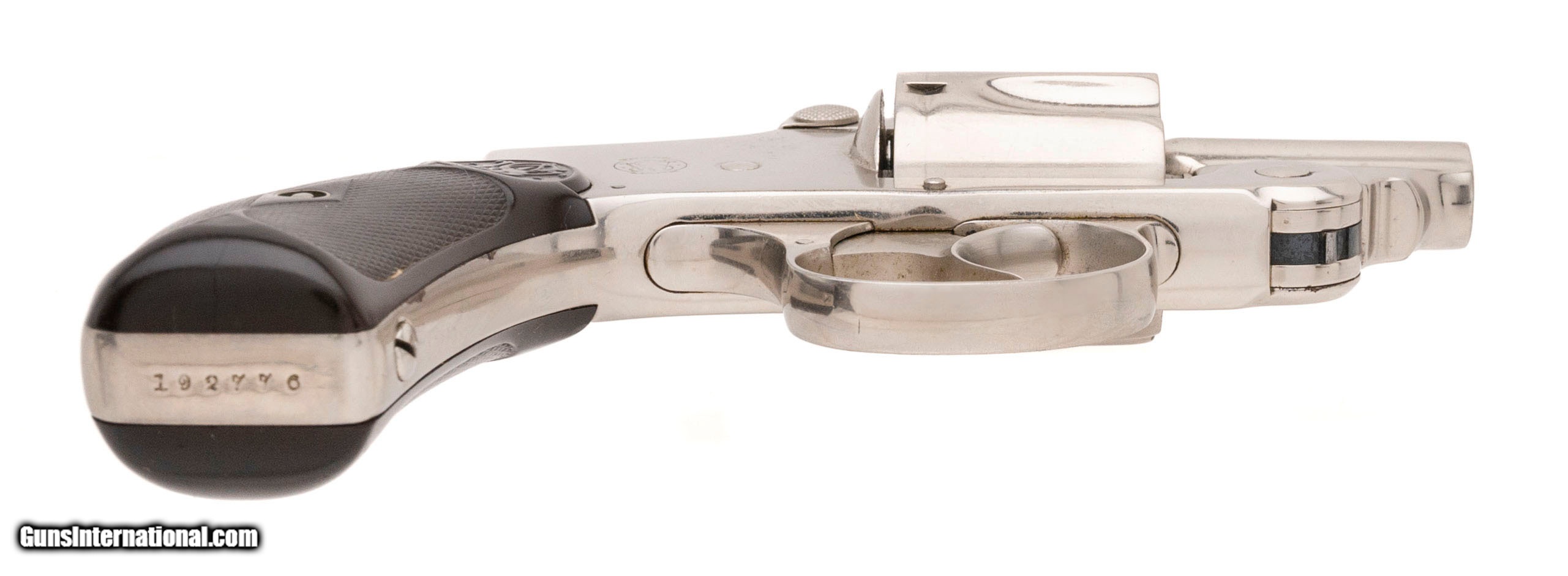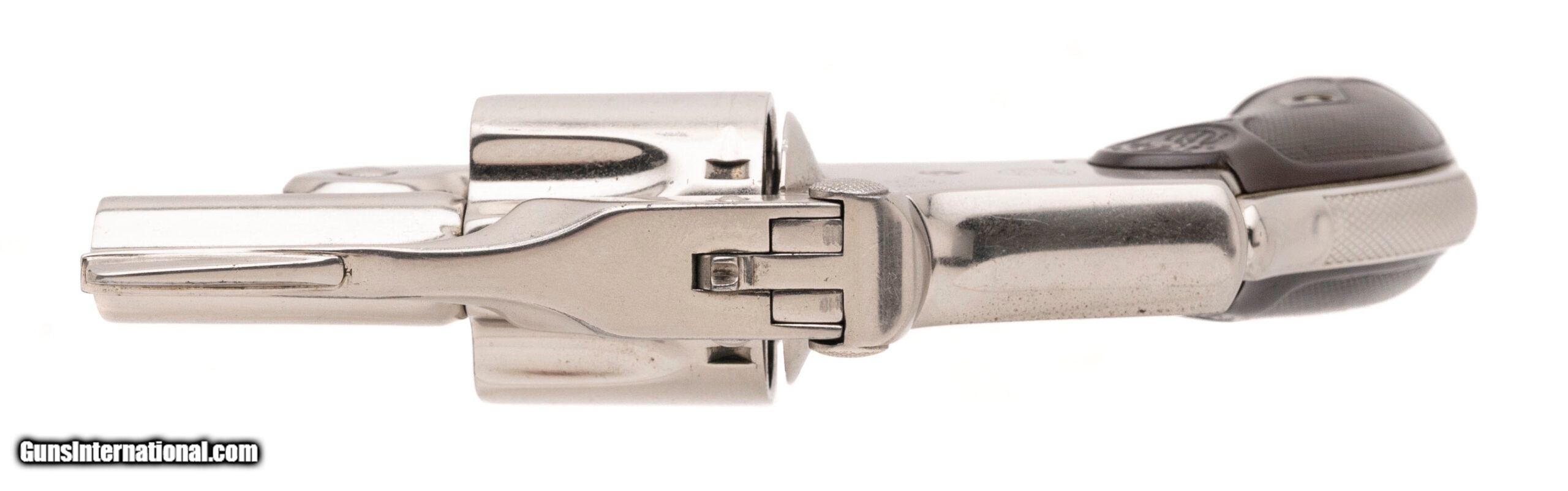 Description: "Serial No. 192776, circa 1900-1907, .38 s&w, 1 1/2" round barrel. Bore is excellent with sharp rifling remining. 96% refinish nickel finish remains, left side of the barrel is stamped “38 S&W CTG". Left grip shows a crack going through the monogram, right side has light wear visible. Action indexes correctly with a tight lock up. Front sight is not original. SOLD Curio/Relic: Yes |