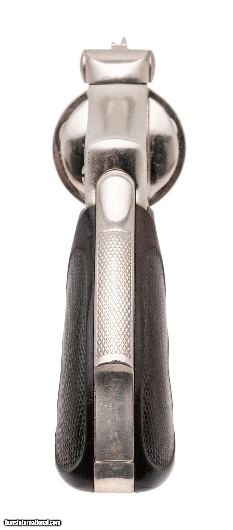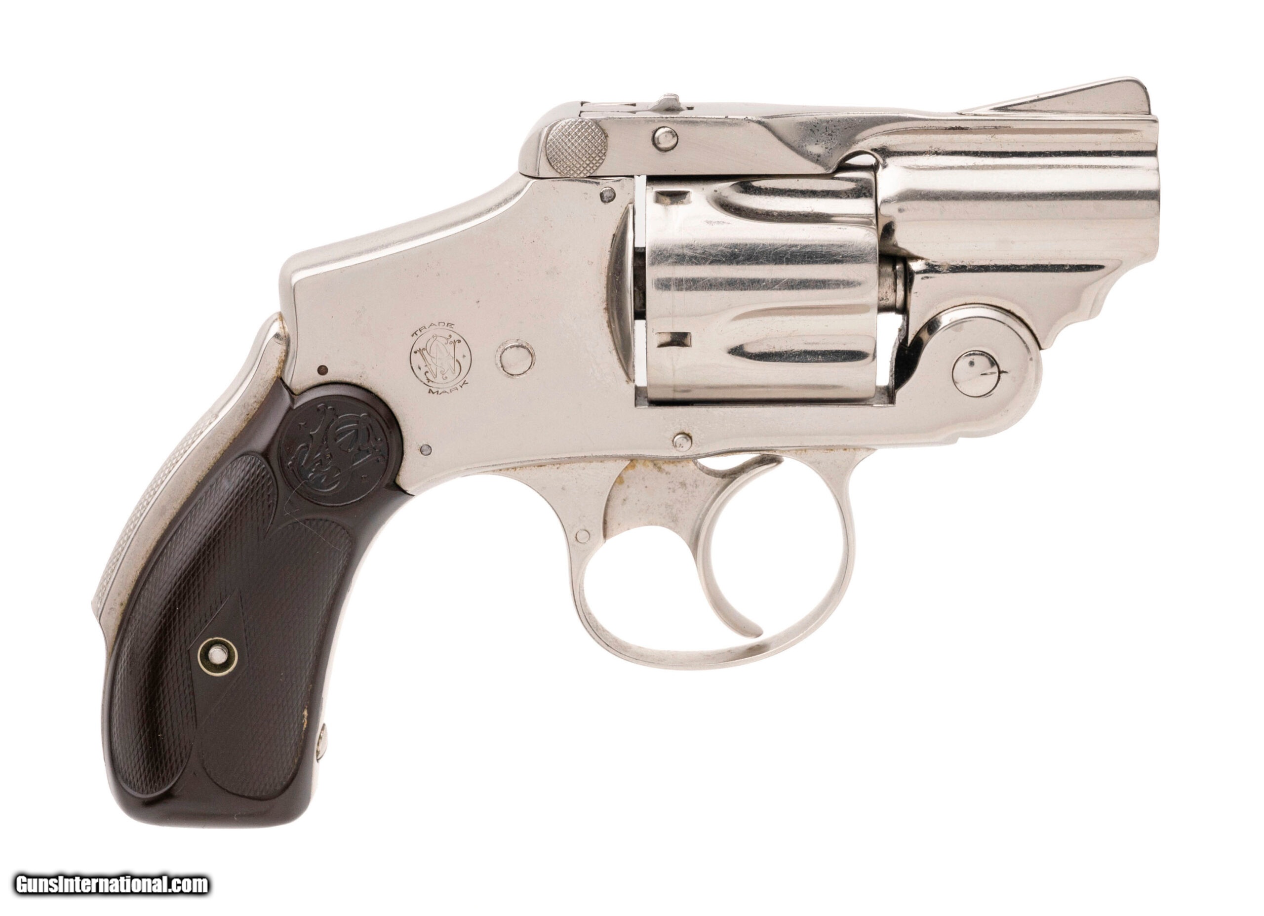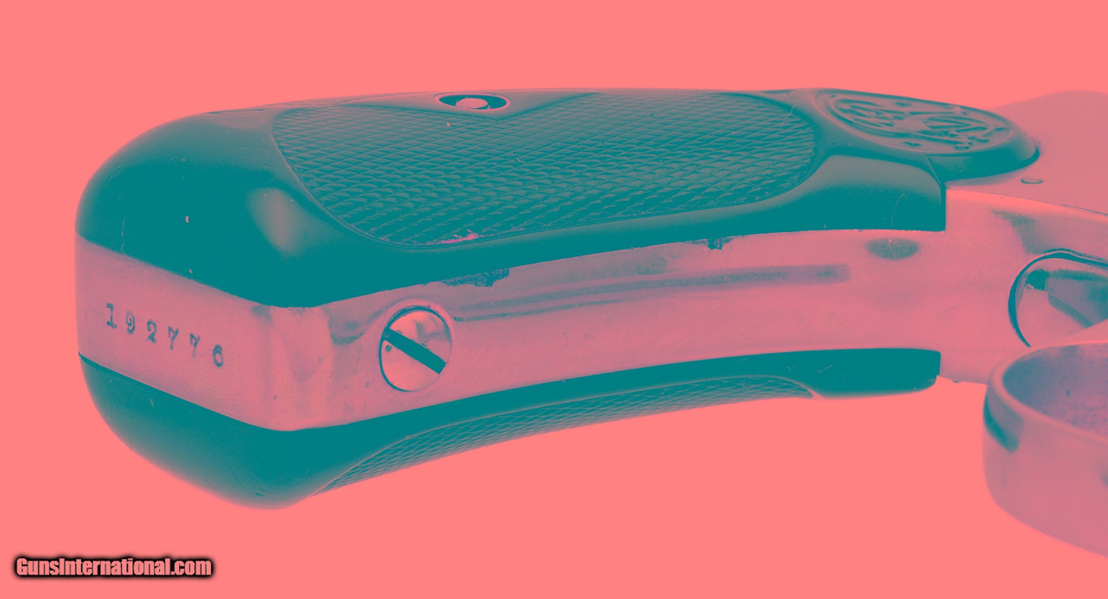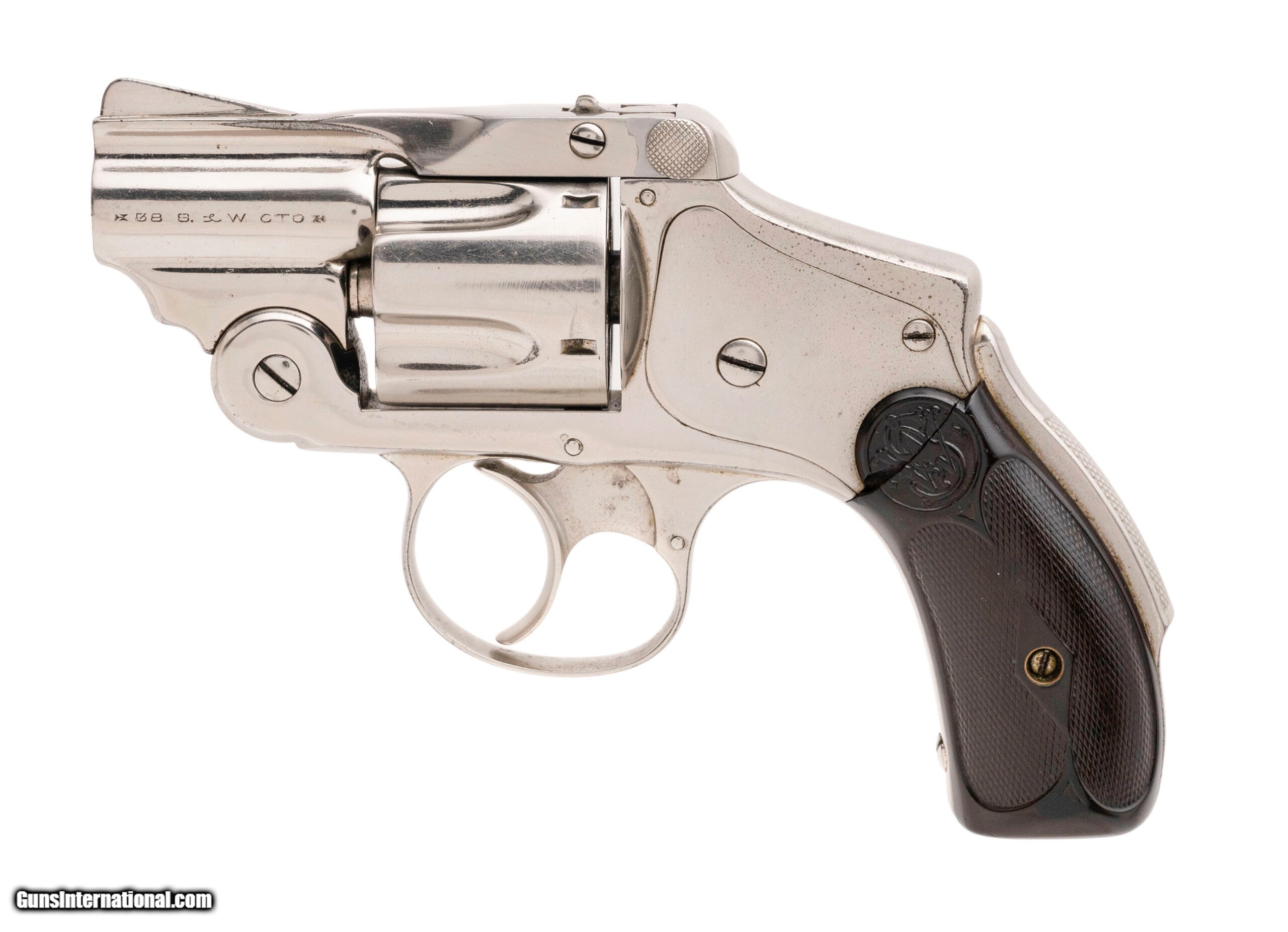 Description: "Serial No. 192776, circa 1900-1907, .38 s&w, 1 1/2" round barrel. Bore is excellent with sharp rifling remining. 96% refinish nickel finish remains, left side of the barrel is stamped “38 S&W CTG". Left grip shows a crack going through the monogram, right side has light wear visible. Action indexes correctly with a tight lock up. Front sight is not original. SOLD Curio/Relic: Yes |