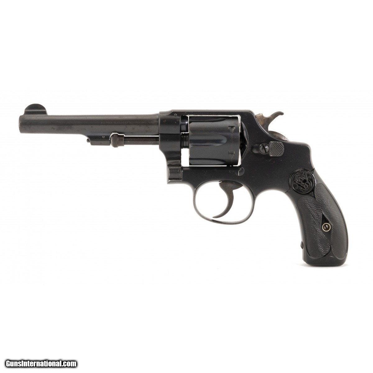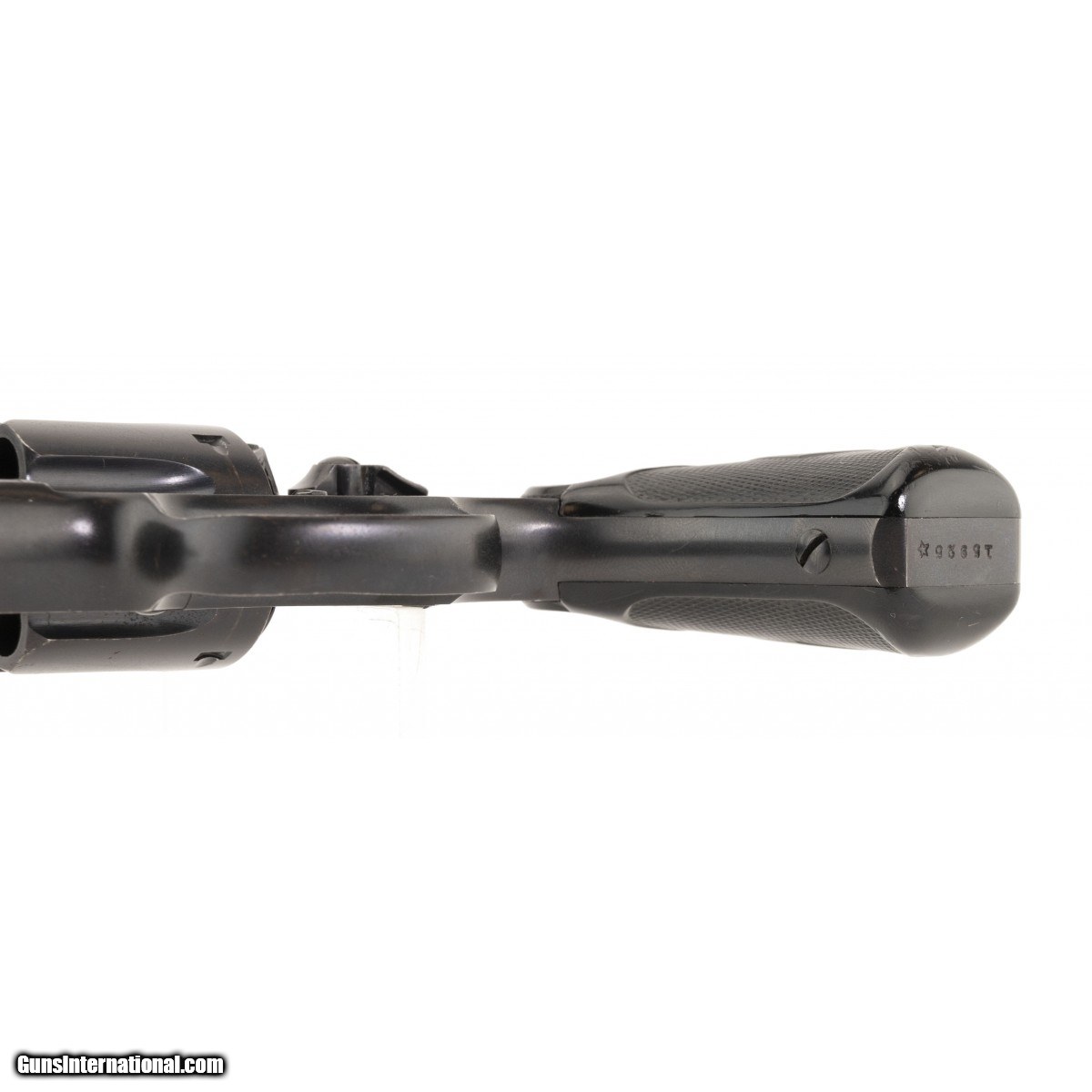 Description: " Pre-war Hand Ejector with 4.25"" barrel and blue finish. Has been refinished by the factory and has a ""star"" mark next to the serial number. Has about 97% blue with scattered light speckling on the barrel. The bore is good with a few areas of pitting. The grips are very good with no chips or cracks. SOLD Curio/Relic: Yes |