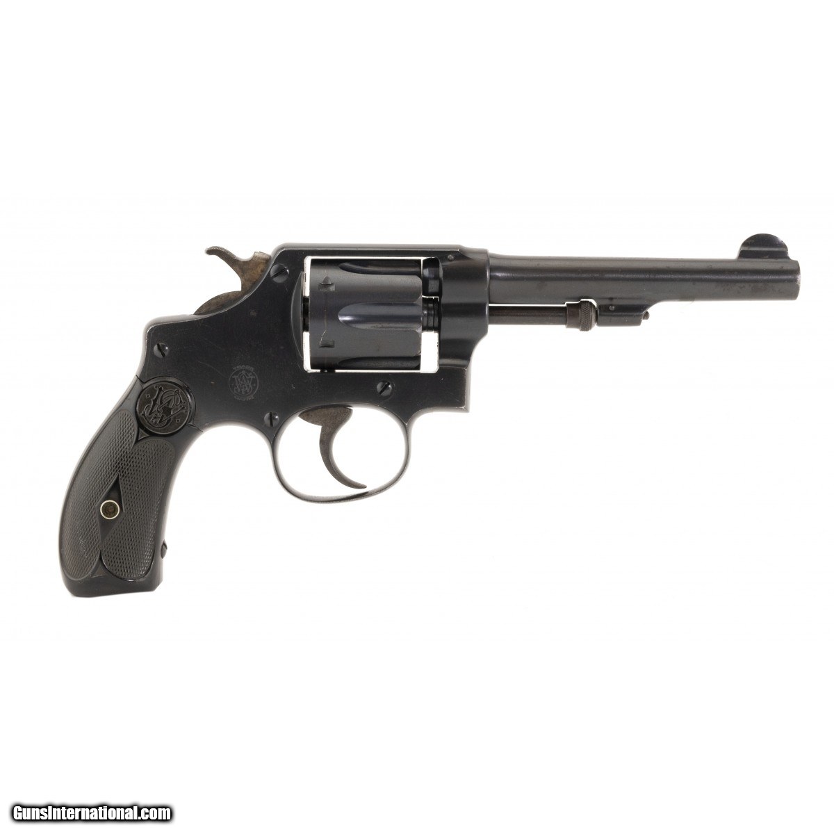 Pre-war Hand Ejector with 4.25"" barrel and blue finish. Has been refinished by the factory and has a ""star"" mark next to the serial number. Has about 97% blue with scattered light speckling on the barrel. The bore is good with a few areas of pitting. The grips are very good with no chips or cracks.