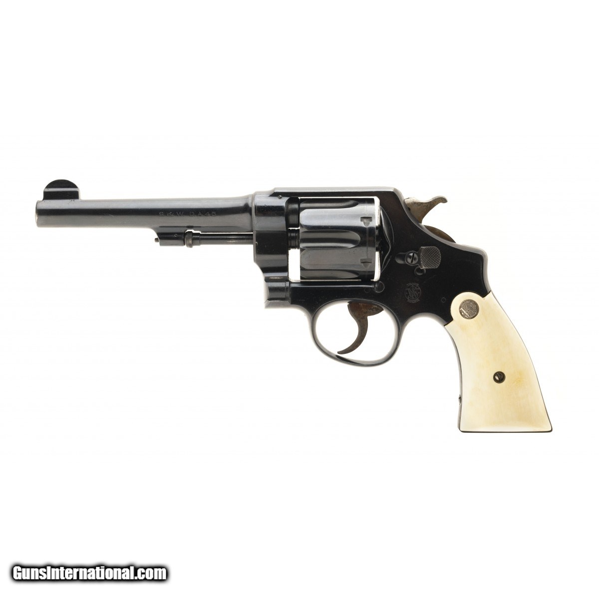 Pre-War revolver manufactured approximately 1938-1940. Metal has been refinished and looks great. Action works perfectly. Grips are ivory with Smith & Wesson medallions. Lanyard hole has been filled. Barrel is 5.5"". Bore has strong rifling with minor frosting. A good looking Pre-War Hand Ejector in a poplar caliber.