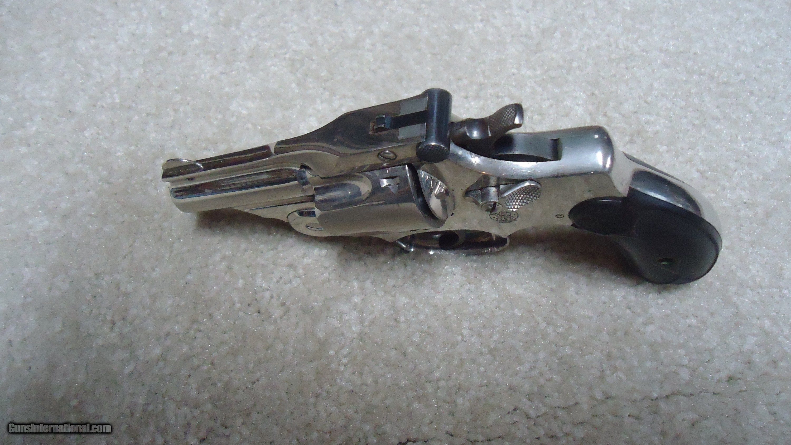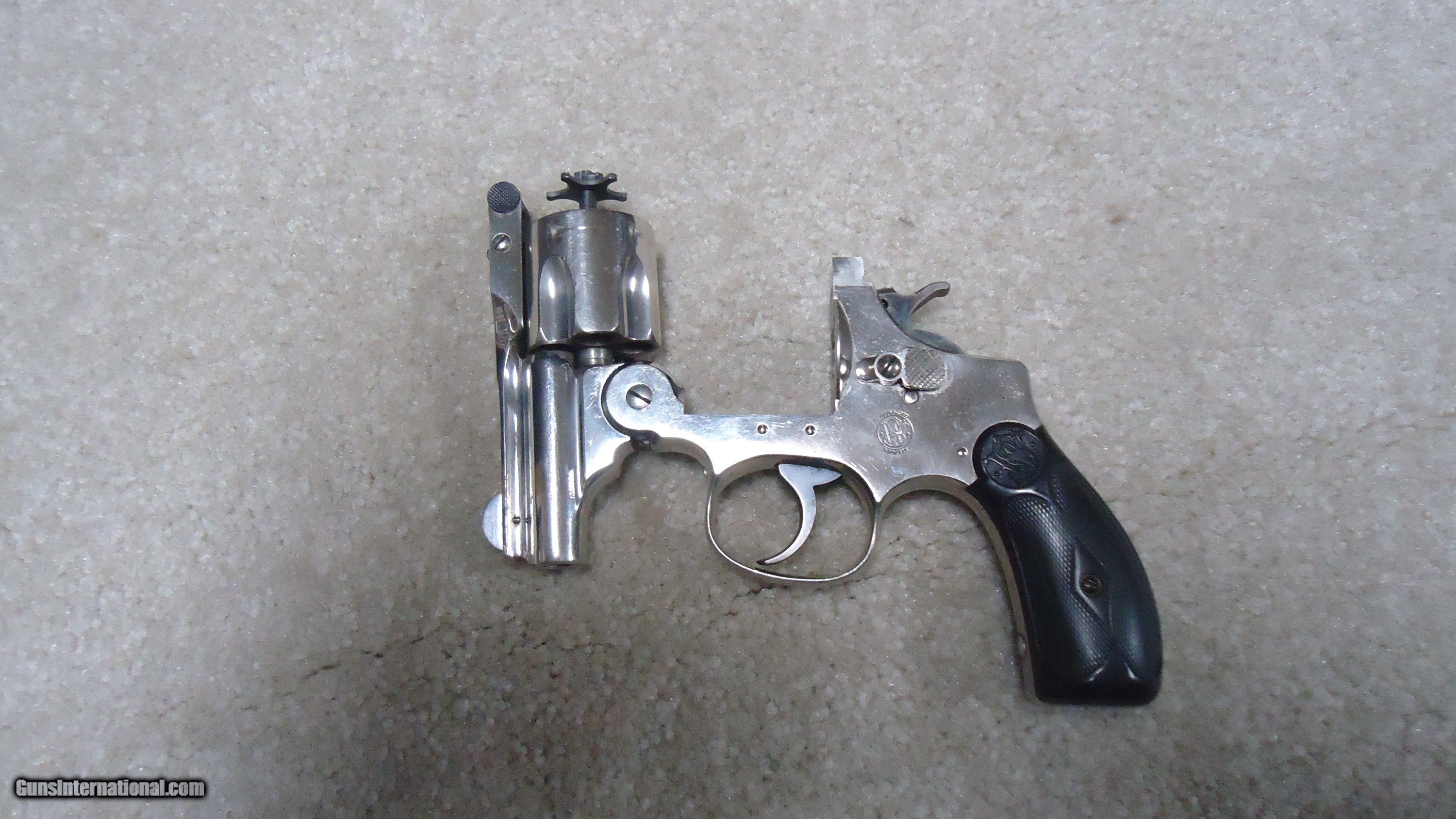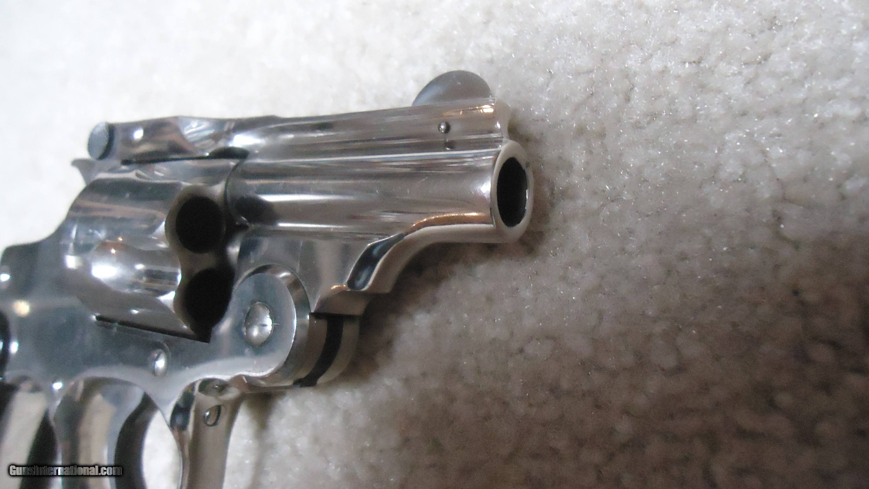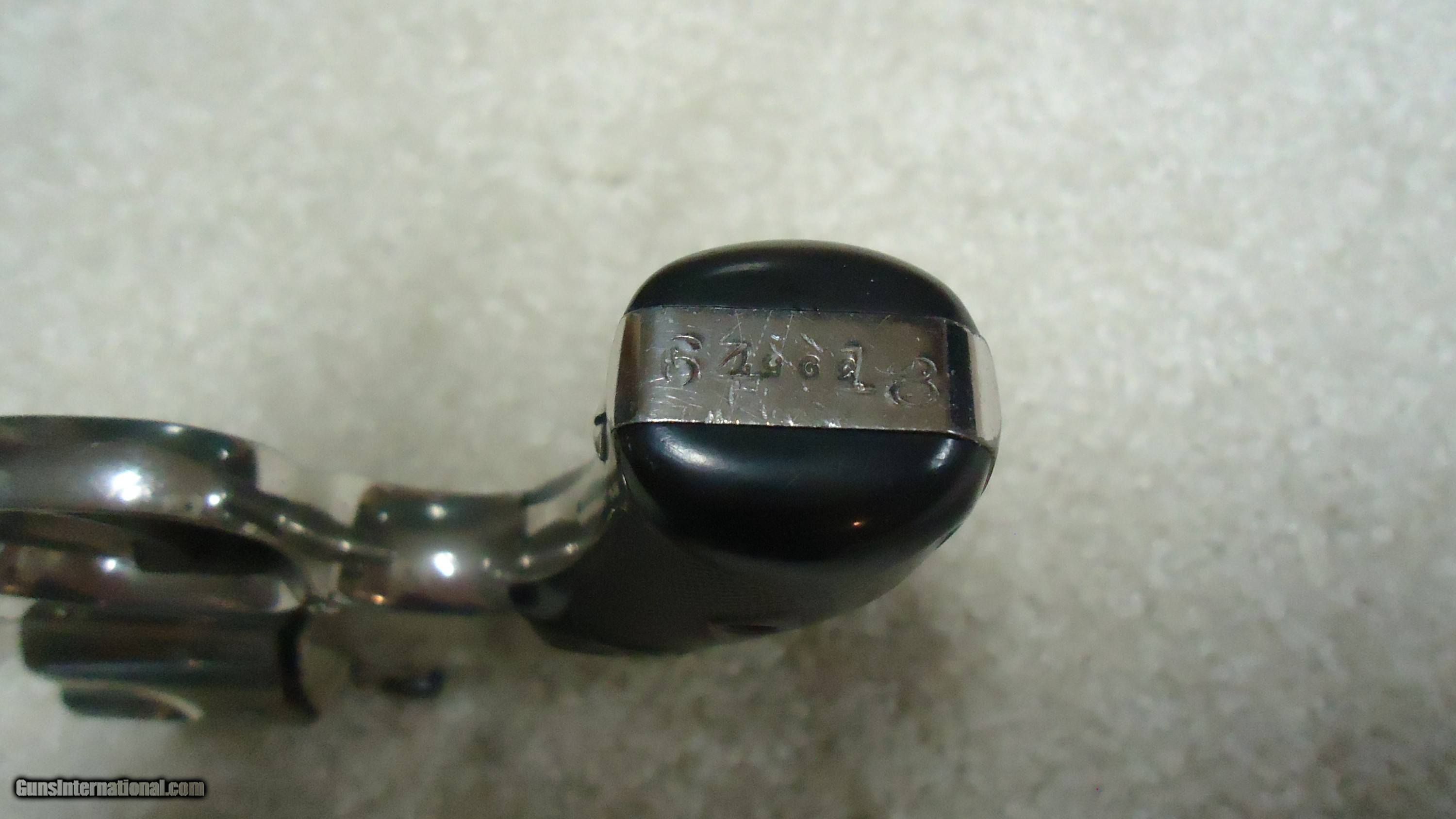 Description: A ONE-OF-A-KIND S&W! THIS IS REALLY UNUSUAL AND INTERESTING! .38 DOUBLE ACTION PERFECTED MODEL WITH 2" BARREL, #3XXX, MADE C. 1909-1910. This nickel plated example with all matching numbers has to be unique. The Perfected Model was the only S&W top break with the addition of a side thumb release. It was made from 1909 - 1920 in barrel lengths of 3 1/2" to 6." This very early example is in near mint, perfect condition with full bright nickel, exc. sharp markings and fine case colors on the hammer and trigger with blued barrel latch/sight. There is the numbers "8" and "9" stamped on either side of the serial number on the butt along with a tiny five-pointed star at the base of the front strap- the star indicates the revolver was returned to S&W for refinishing or re-working/repair. Under the grips, stamped on the side of the grip strap is "10.46" indicating that this revolver was returned to S&W in October of 1946. It doesn't appear to be re-nickeled as the edges are sharp as are the markings. I assume it was returned to have the barrel either replaced or cut to 2". The barrel has the correct slightly recessed from the muzzle rib and pinned front sight. This is obviously all S&W factory work. All frame screws appear unturned and the pin holding the front sight to the rib is un-marred. My guess, especially as there is the "8" and "9" numbers on the butt, is that this was a special police/detective rework. There is some light wear to the rubber grips that fit perfectly, but aside from this and the tiniest of edge wear, there is almost no real wear to this revolver. This one came out of here in Montana. A truly fascinating S&W! SOLD Curio/Relic: Yes Handgun Caliber: .38 S&W (.38 Colt New Police, .38 Super Police) Manufacturer: SMITH & WESSON Model: PERFECTED .38 DA Serial Number: 3XXX Barrel Length: 2 Condition: EXCELLENT Bore Condition: EXCELLENT |