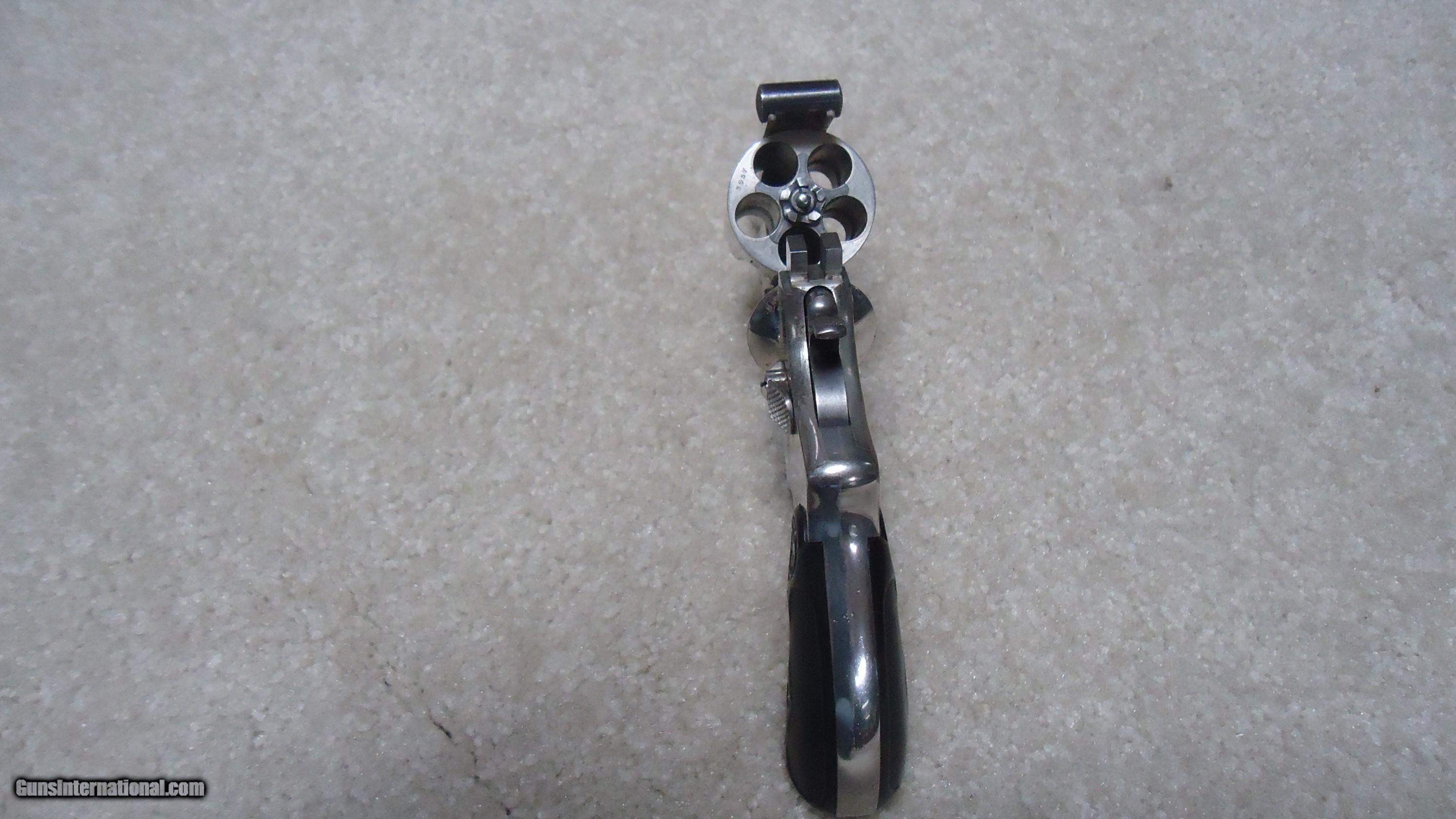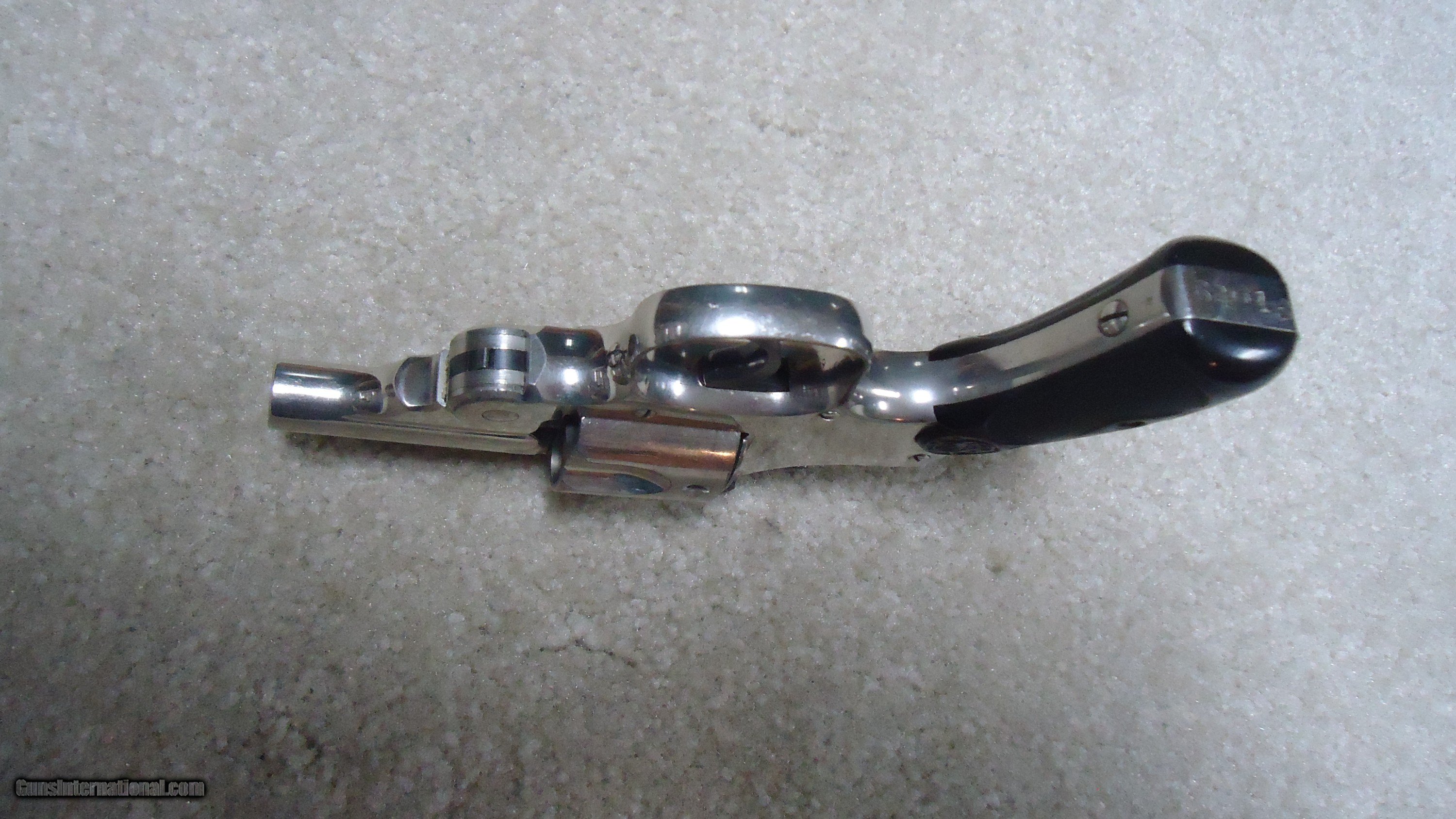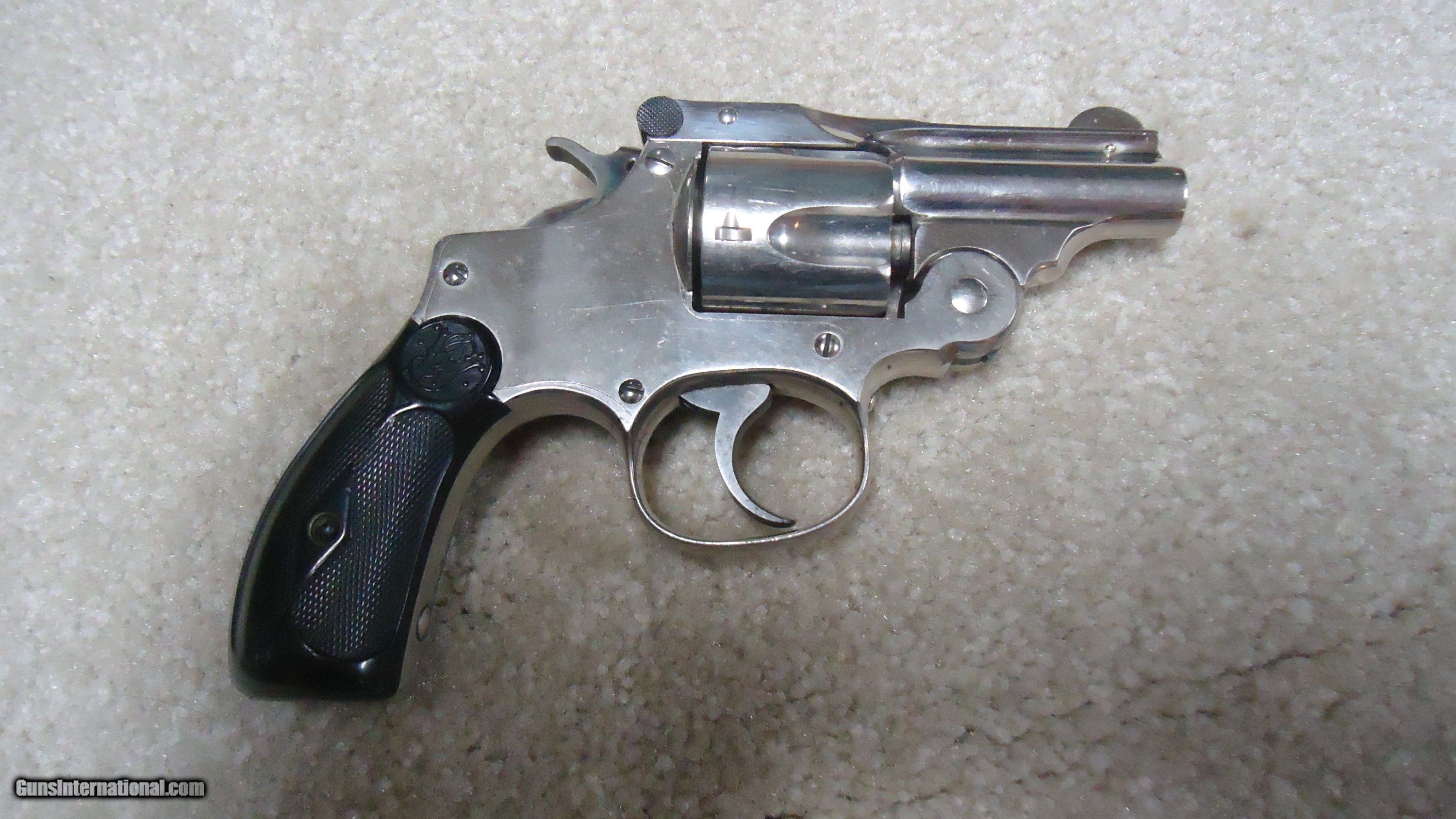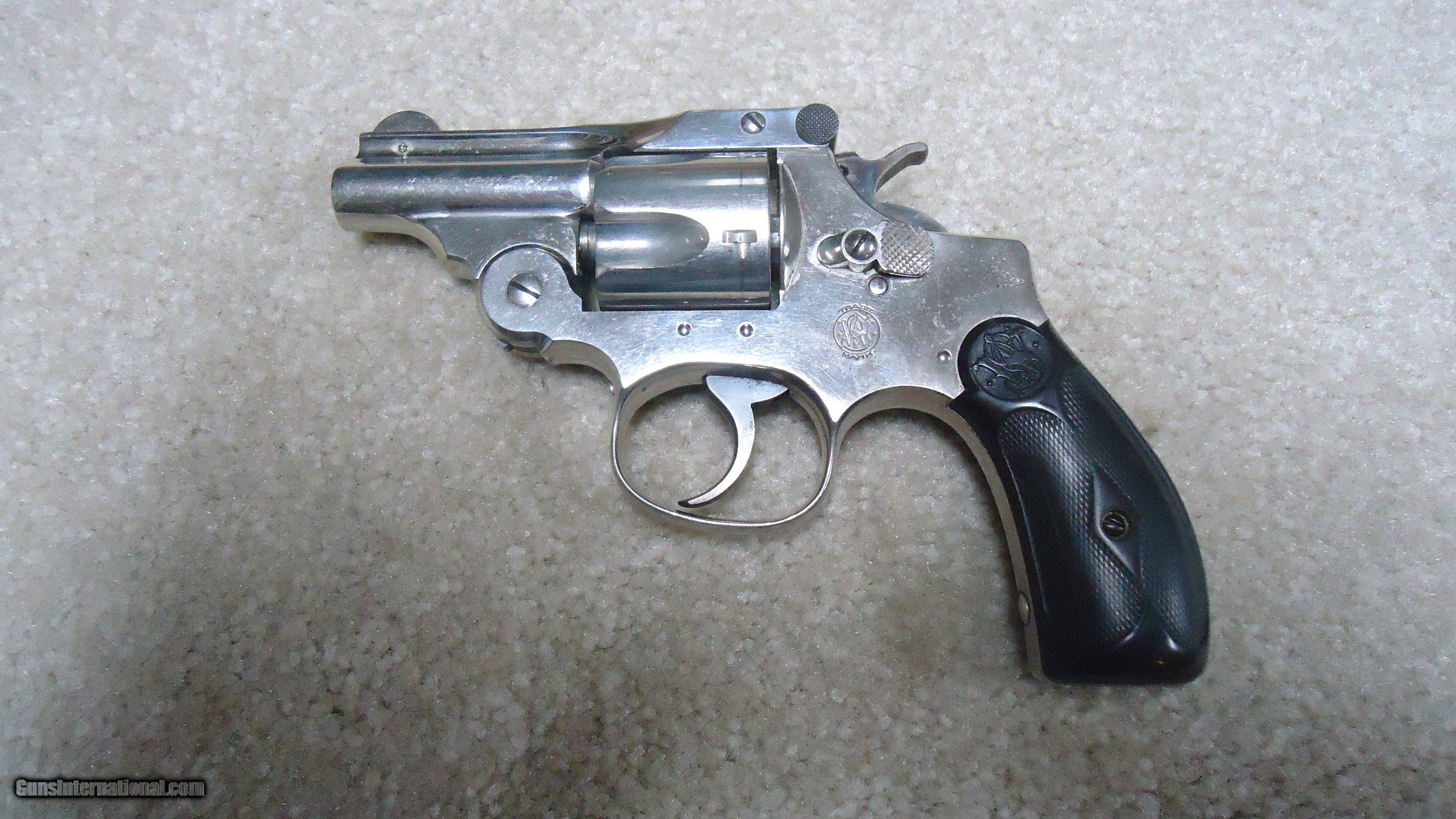 Description: A ONE-OF-A-KIND S&W! THIS IS REALLY UNUSUAL AND INTERESTING! .38 DOUBLE ACTION PERFECTED MODEL WITH 2" BARREL, #3XXX, MADE C. 1909-1910. This nickel plated example with all matching numbers has to be unique. The Perfected Model was the only S&W top break with the addition of a side thumb release. It was made from 1909 - 1920 in barrel lengths of 3 1/2" to 6." This very early example is in near mint, perfect condition with full bright nickel, exc. sharp markings and fine case colors on the hammer and trigger with blued barrel latch/sight. There is the numbers "8" and "9" stamped on either side of the serial number on the butt along with a tiny five-pointed star at the base of the front strap- the star indicates the revolver was returned to S&W for refinishing or re-working/repair. Under the grips, stamped on the side of the grip strap is "10.46" indicating that this revolver was returned to S&W in October of 1946. It doesn't appear to be re-nickeled as the edges are sharp as are the markings. I assume it was returned to have the barrel either replaced or cut to 2". The barrel has the correct slightly recessed from the muzzle rib and pinned front sight. This is obviously all S&W factory work. All frame screws appear unturned and the pin holding the front sight to the rib is un-marred. My guess, especially as there is the "8" and "9" numbers on the butt, is that this was a special police/detective rework. There is some light wear to the rubber grips that fit perfectly, but aside from this and the tiniest of edge wear, there is almost no real wear to this revolver. This one came out of here in Montana. A truly fascinating S&W! SOLD Curio/Relic: Yes Handgun Caliber: .38 S&W (.38 Colt New Police, .38 Super Police) Manufacturer: SMITH & WESSON Model: PERFECTED .38 DA Serial Number: 3XXX Barrel Length: 2 Condition: EXCELLENT Bore Condition: EXCELLENT |