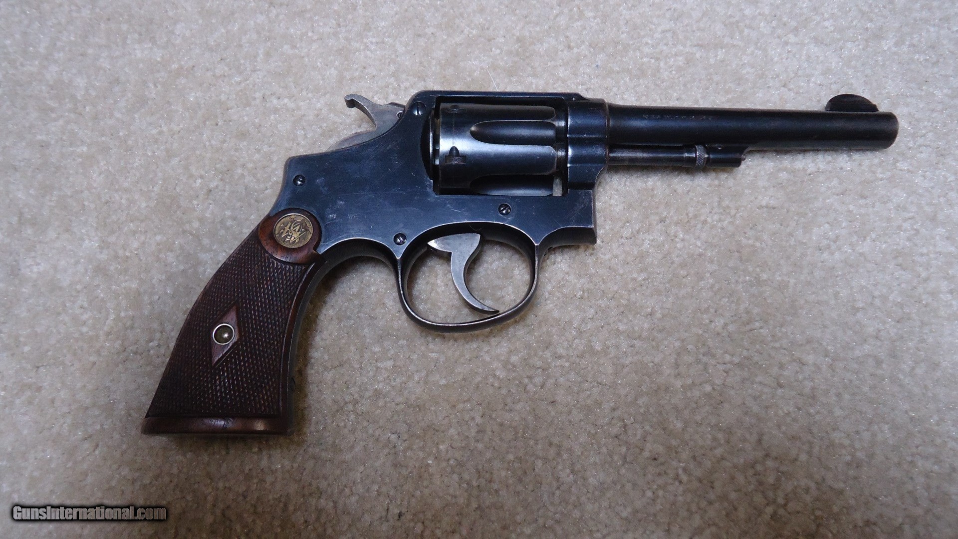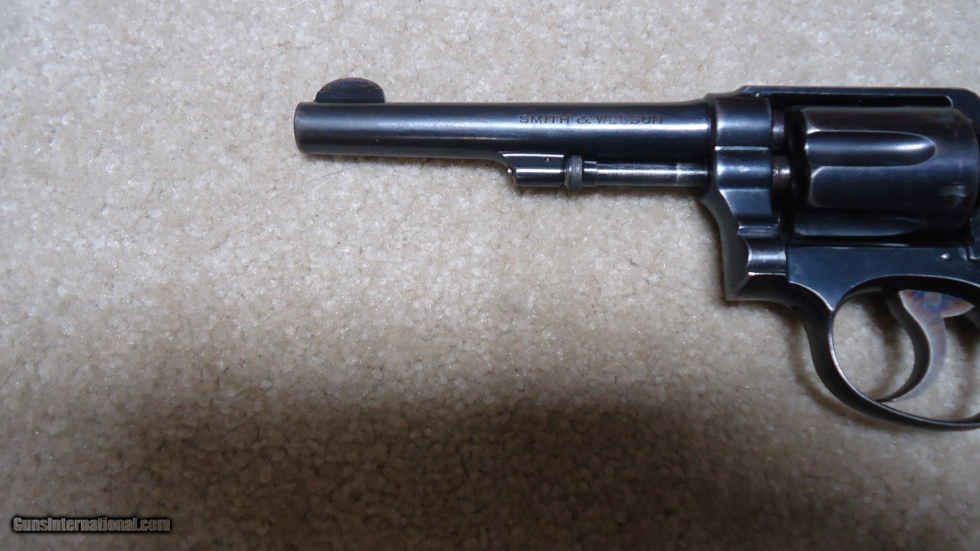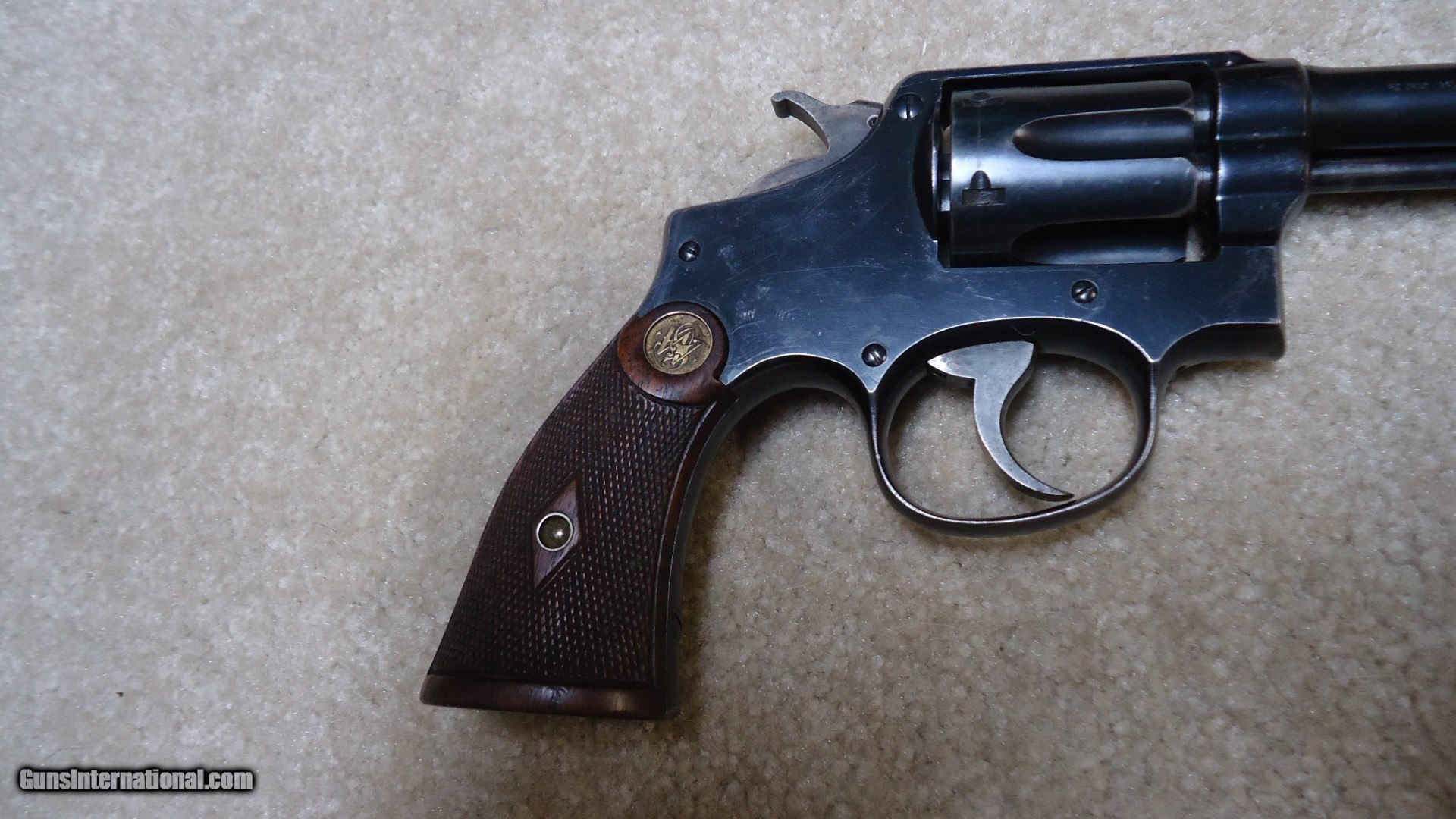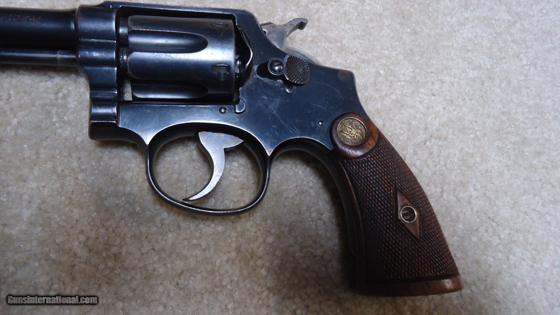 Description: EARLY .32-20 1905 HAND EJECTOR, 4TH CHANGE, #78XXX. This model was made from 1915 to 1940 and in serial numbers fromm65701-144684. This one was probably made around 1917 or so. All matching numbers. Fine blue overall with some very light handling and holster wear only. Even the back strap retains nearly all the original blue. Barrel sides show minimal thinning and only the lightest of edge wear showing. Front sight has not been filed, action is crisp and tight (nothing like these pre-war hand fitted actions!), exc. bore. Exc. original diamond checkered grips with deep S&W medallions are numbered to the gun. Nice case colors on the trigger and hammer. Very fine example getting hard to find in this caliber. SOLD Curio/Relic: Yes Manufacturer: SMITH & WESSON Model: .32-20 HAND EJECTOR 4TH CHANGE Serial Number: 78XXX Caliber Info: 32-20 Condition: EXC. Barrels: 5 |