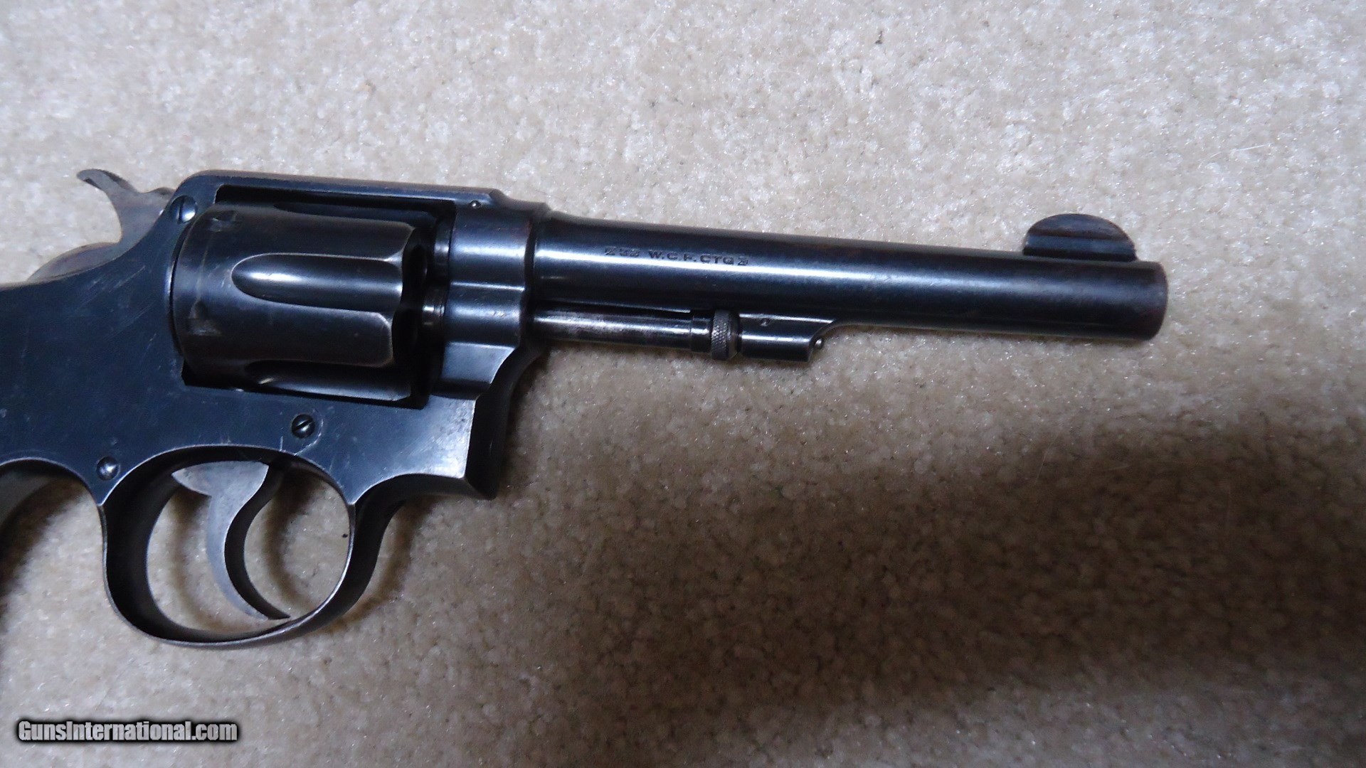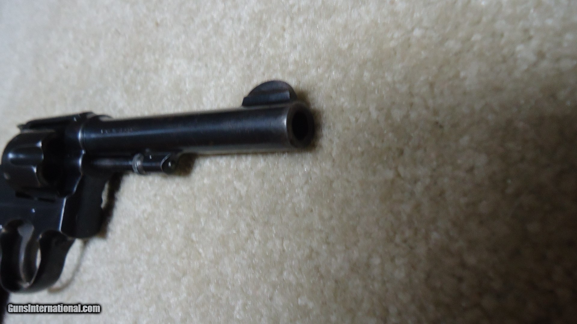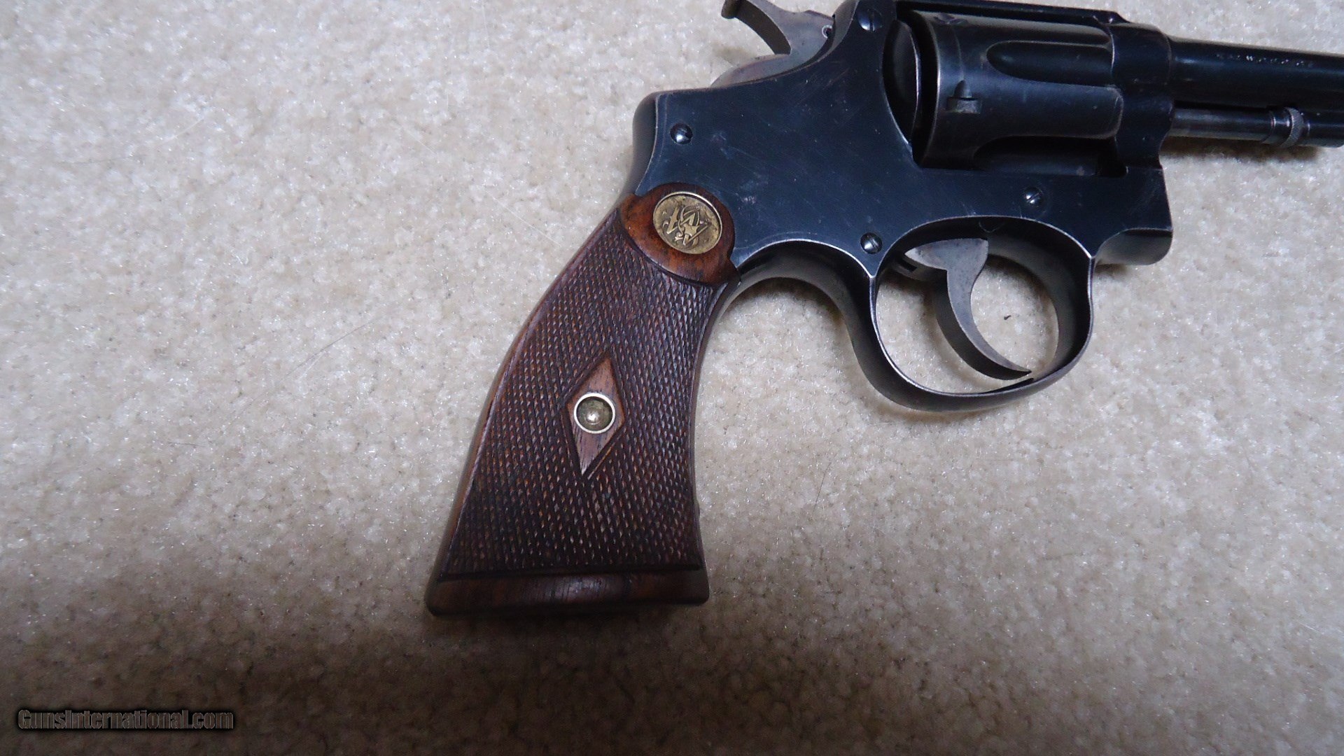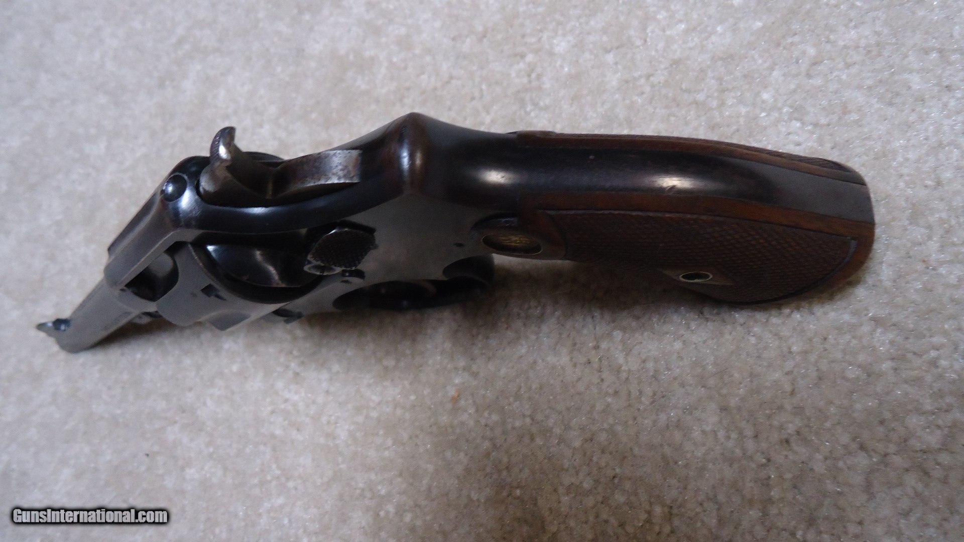 Description: EARLY .32-20 1905 HAND EJECTOR, 4TH CHANGE, #78XXX. This model was made from 1915 to 1940 and in serial numbers fromm65701-144684. This one was probably made around 1917 or so. All matching numbers. Fine blue overall with some very light handling and holster wear only. Even the back strap retains nearly all the original blue. Barrel sides show minimal thinning and only the lightest of edge wear showing. Front sight has not been filed, action is crisp and tight (nothing like these pre-war hand fitted actions!), exc. bore. Exc. original diamond checkered grips with deep S&W medallions are numbered to the gun. Nice case colors on the trigger and hammer. Very fine example getting hard to find in this caliber. SOLD Curio/Relic: Yes Manufacturer: SMITH & WESSON Model: .32-20 HAND EJECTOR 4TH CHANGE Serial Number: 78XXX Caliber Info: 32-20 Condition: EXC. Barrels: 5 |