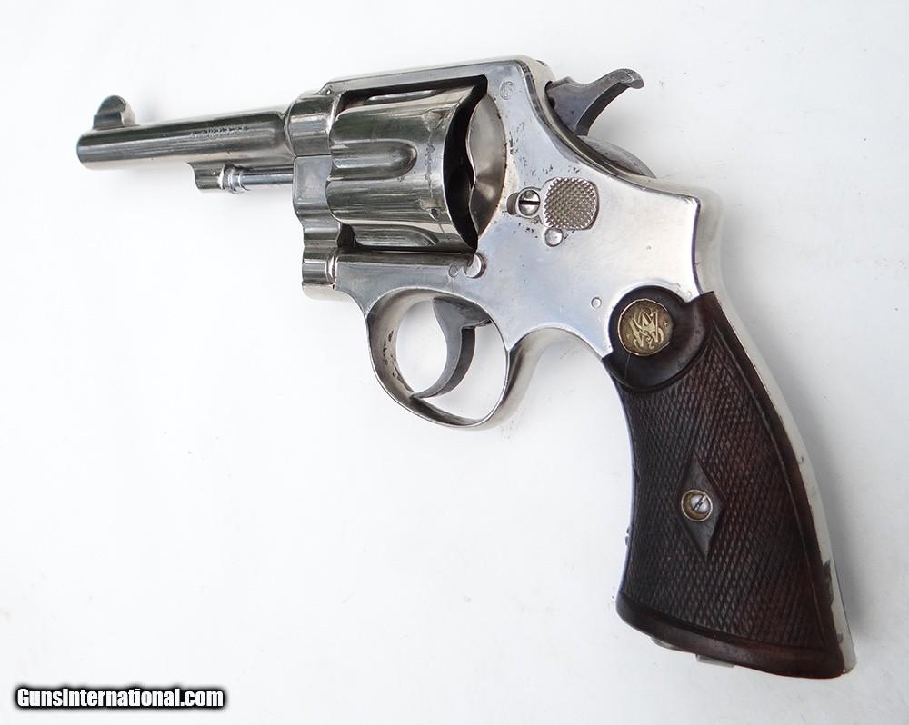Description: An excellent condition and very interesting commercial Smith & Wesson Model 1917 revolver. This S&W is a US Model 1917 revolver in .45acp caliber with 5 1/2" barrel, and is a relatively early example of the model. This revolver was either repurposed during production or returned to the factory by its owner for commercial alteration including a nickel plated finish and the mounting of commercial checkered walnut grips of the period. This Smith & Wesson bears a S&W commercial serial number on the butt instead of the usual US Army marks. On careful examination the US Government property mark on the bottom of the barrel was removed when the revolver was commercialized. Matching serial numbers are found where expected - on the butt, bottom of barrel, rear of cylinder, and back edge of the crane. A capital 'S' is also found on the bottom of the barrel near the serial and on the rear of the cylinder. All US markings have been removed save the, 'GHS' inspectors mark on the left side of the frame above the recoil shield which is quite clear. All S&W markings and serial numbers on the revolver are clear and sharp. All frame contours and edges are sharp. All details, such as butt serial number, and quality of nickel plating indicate this revolver has been Smith & Wesson factory modified. Please view all detail and overall pictures of this S&W. It is interesting to note this S&W revolver does not bear the usual 'star' and date marking found on revolvers returned to the factory for repair/alteration. I have done internet research on S&W 1917 commercial alterations and find that nobody seems to know when S&W began 'star' marking guns returned to the factory for work. A number of collectors/researchers believe S&W revolvers with variant features and finishes but without the 'star' mark are revolvers which received special attention during initial production rather than being returned to the factory at later dates. CONDITION: This revolver retains 95% nickel plated finish with attractive patina and some light wear on the front of the cylinder, cyl. drag line, and muzzle. The bore is very fine with clean sharp rifling and some very light frosting. Mechanical functions are excellent, the hammer and trigger retain their original casehardened finish. The original S&W commercial checkered walnut grips with deep dish medallions are excellent with original finish and some light handling marks. A handsome and most interesting high condition Smith & Wesson revolver that makes one think of the 'Indiana Jones' sagas and is most worthy of further research. NOTE: This revolver is being sold as a collector's item and should not be fired without being fully checked by a professional gunsmith.This revolver must be shipped to an FFL, or C&R license holder. It cannot be shipped to any locations that do not recognize C&R licenses such as NYC, NJ, etc. Buyers are fully responsible for abiding by their local firearms regulations. We will not ship outside the USA. For the benefit of foreign buyers we will ship to fully licensed firearms export agent within the USA. SOLD Curio/Relic: Yes Manufacturer: Smih & Wesson Model: 1917 Serial Number: 38994 Caliber Info: .45 app Condition: excellent Metal Condition: excellent Finish: nickel Sights: standard Manufacture Date: 1917-1920 |