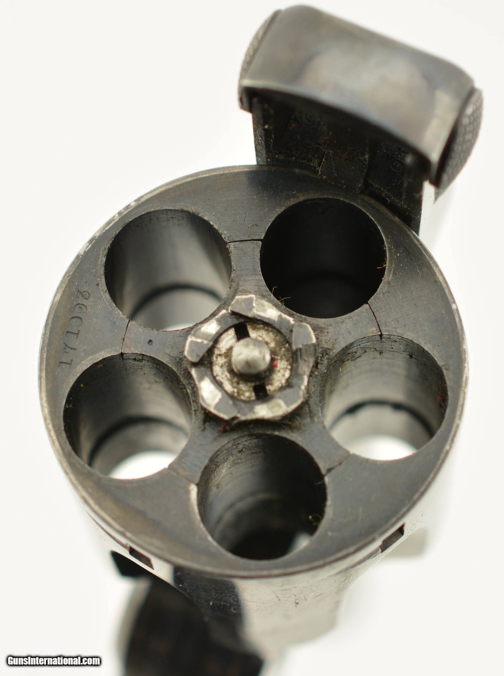 Description: Serial #171093, .38 S&W, 4" barrel with an excellent, bright bore. This is a handsome revolver that has matching numbers on the frame, barrel, and latch; while the metal retains 95-97% of the original bright blue finish that has silvered at the muzzle, and on some spots around the rear of the cylinder. The trigger retains nearly all of the original color case-hardening as well. The hard rubber grips are numbered to the gun on the interior, and are in excellent shape with very few handling marks and almost no flattening of the points. The lock-up is tight, with no lateral play in the barrel, and the action functions flawlessly. This is a little-used "Lemon Squeezer" and would make a great, high condition example for a collection. FFL or C&R SOLD Curio/Relic: Yes Manufacturer: S&W Model: Safety Hammerless Serial Number: 171093 Caliber Info: .38 S&W Gauge Info: .38 S&W |