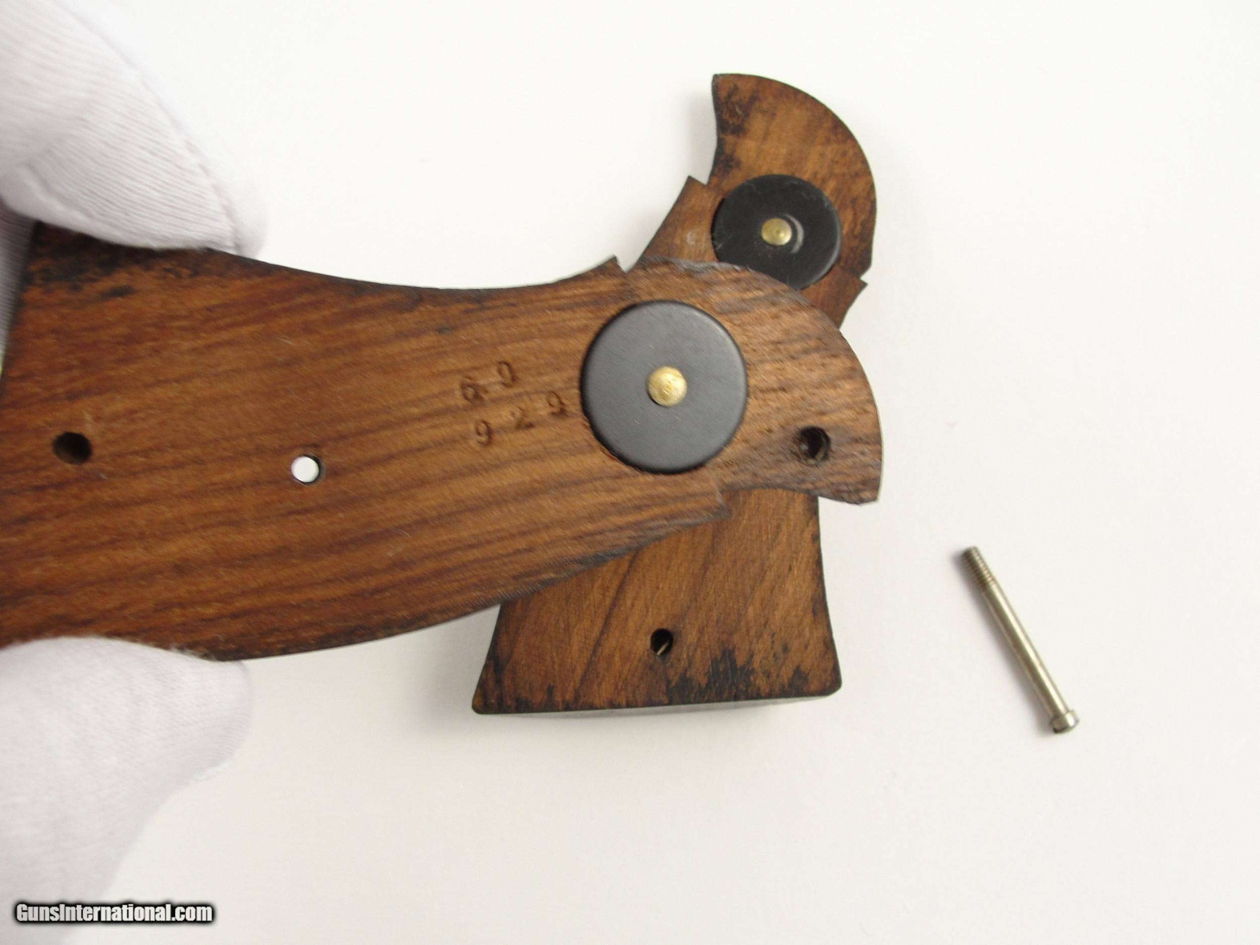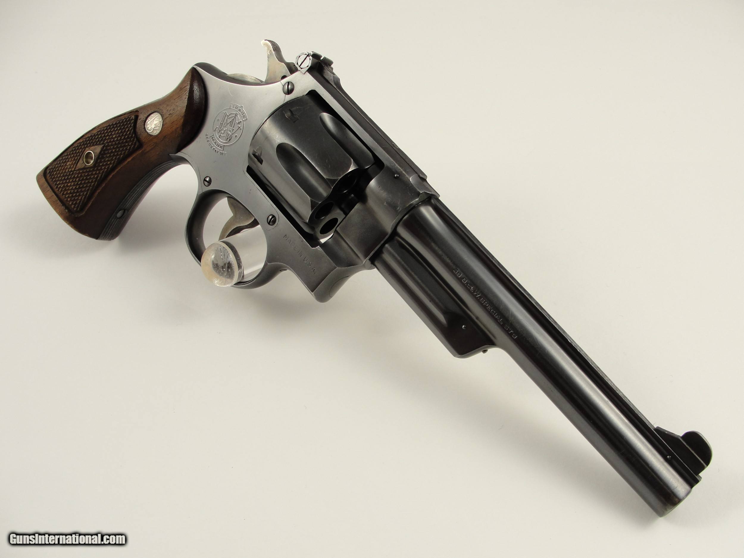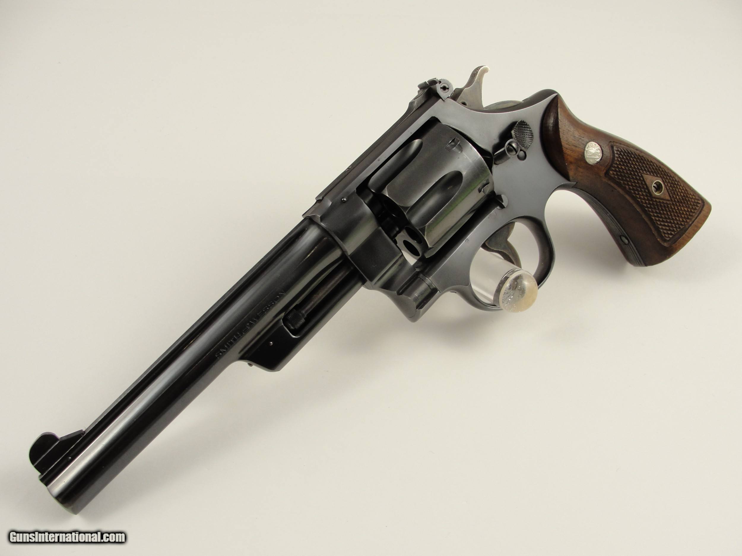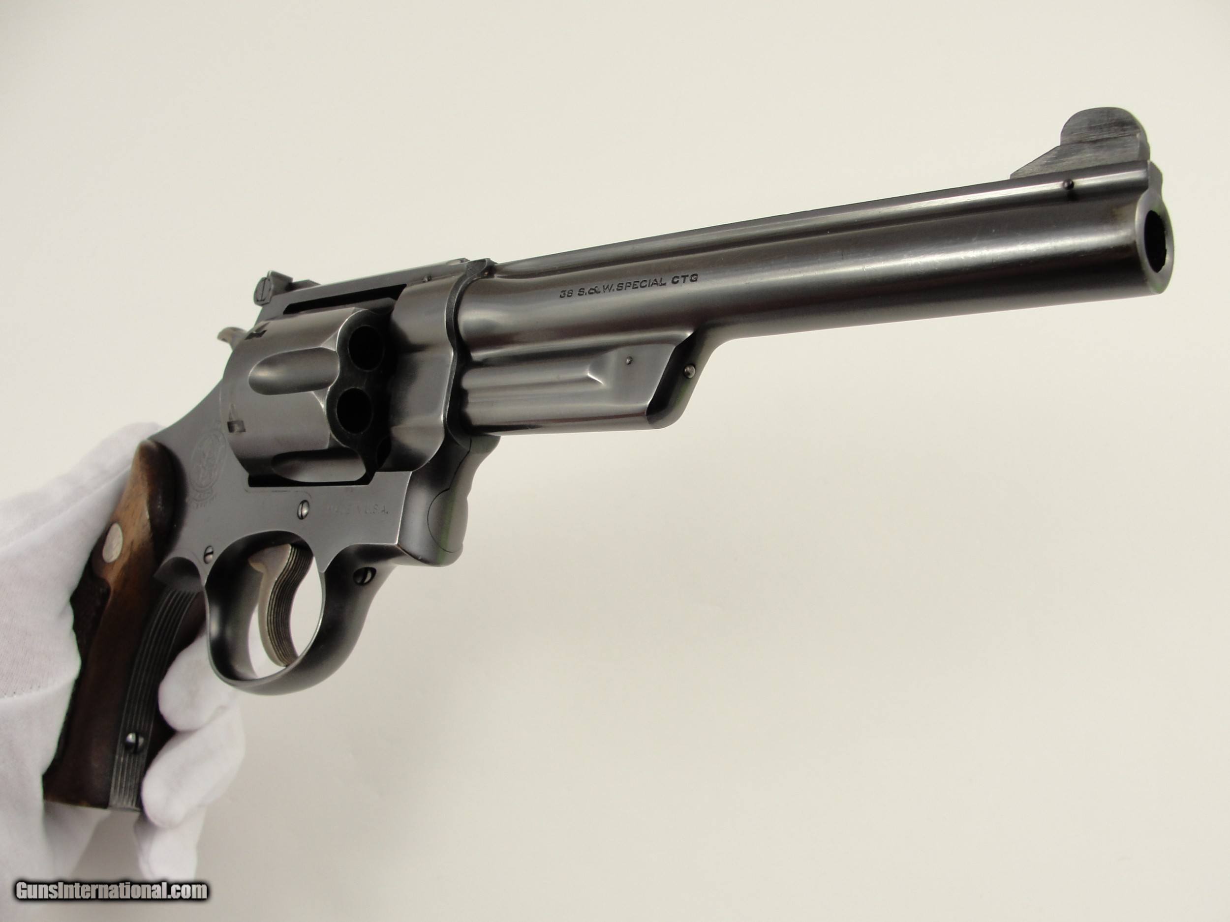 Description: RARE 1947 S&W .38-44 Outdoorsman Postwar-Transitional LERK 6.5'' with Original matching grips. 1 of Only 2326 Made. Serial numbermatching extractor rod housing, cylinder rear face, grip frame and N-Frame Magna American Walnut grips/stocks. Smith & Wesson made postwar improvements to the Outdoorsman model, 6 ½” pinned barrel with shrouded extractor, Patridge front sight and Micrometer click fully adjustable rear sight. Manufactured in 1947 as Smith & Wesson reintroduced the .38/44 Outdoorsman Postwar-Transitional with an “S” serial number prefix beginning at approximately S62496 and manufactured this variation from 1946 to 1949. The Smith & Wesson Original bluing has very light handling/shooting marks showing little signs of use. By Smith & Wesson design the Factory blue finish has a flat appearance. The frame and barrel roll stamps are in near perfect condition, the S&W monogram on the side plate is still very strong. This Smith & Wesson has the single line “Made in U.S.A.” frame stamp. This Outdoorsman has the Early Pre-War “Large Ejector Rod Knob”: the “LERK” among collectors. The .38/44 Outdoorsman was originally built for a High-Powered .38 Special cartridge, also known as the “.38 Super Police”. Both sides of the 6 round fluted cylinder and forcing cone area are Exceptionally clean, the mechanics are Excellent and it locks up tight. The bore is bright and rifling is sharp. Please view the photos here for the purpose of evaluating the condition for yourself. This item qualifies as a C&R. Unlike all the s, at this point, I do not collect any taxes. Shipping & insurance by FedEx is $45 to lower 48 states. *As this is a C&R, I am opening it up to buyers from California who utilize an 01FFL who is receptive to receiving it. All such bids will acknowledge to assume any additional transfer/shipping costs on my end. Buyer is responsible for knowing their own local and state laws and whether or not you are prohibited from taking possession of, or owning this firearm. By participating, you are attesting to being of at least 21 years of age. ***The purchaser assumes all risks and should have a qualified Gunsmith evaluate the firearm before attempting to shoot it. *** Please arrange for payment to be sent within 3 days of committing to purchase. Payment must be by bank certified (cashiers) check or Postal Money Order. Shipping & insurance by FedEx is $45 to lower 48 states. Shipping to AK or HI will have additional costs for which buyer is responsible. I will need a copy of an FFL dealer license or C&R with copy of Drivers License to ship the gun. There is a 3 day, no-shoot, no disassembly inspection period and the buyer is responsible for cost of shipping both ways if returned. If your FFL dealer will not accept shipment from an individual, I will need an additional $55 to ship through my local FFL SOLD Curio/Relic: Yes Manufacturer: Smith & Wesson Model: Outdoorsman Transitional |