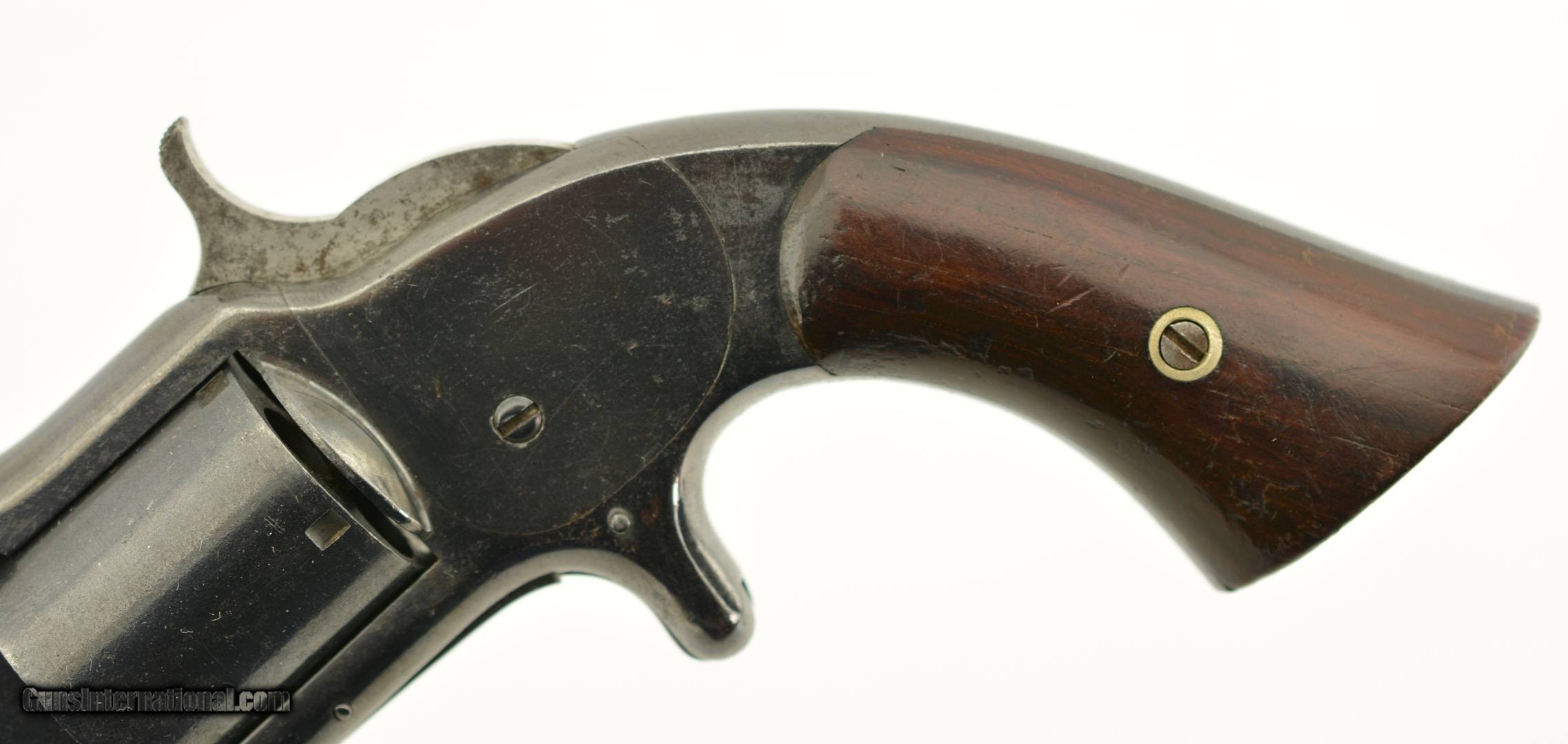 Description: Serial #19863, .32 Rim Fire, 4 inch ribbed octagonal barrel with a fair dark bore with pitting good rifling. This is the Model No. 1 ½ fist issue revolver manufactured by Smith & Wesson, a late one with 1859 and 1865 patent dates. It is also one of the very rare, estimated 200 built out of a total production of 26,300, that have a four inch barrel. Visually attractive, this example retains most of a later added blue on the metal surfaces leaving very legible name and patent date markings on the rib while showing traces of some of the underlying roughness. The original rose wood grips, correctly numbered to the gun on the right panel, are in very good condition with some finish loss and surface scratches and a crack on the right that extends over half way up. The frame, barrel and cylinder all have have matching assembly numbers. The barrel lock-up is good with some lateral play. It does cock into one position but does not advance the cylinder. A very good looking and rare 4 inch version of the S&W 1 ½ that may help fill a hole in your collection. Antique SOLD Antique: Yes |