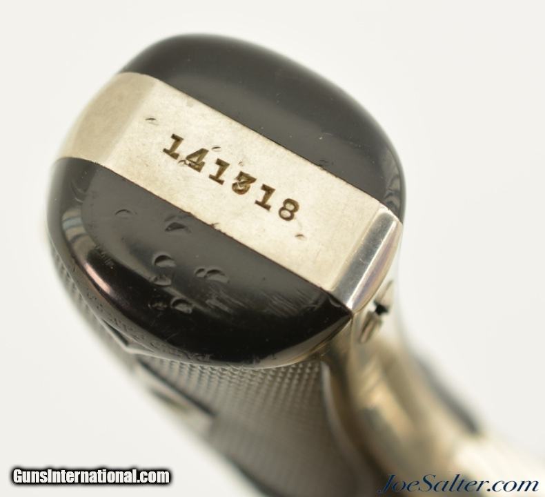 Description: Serial #141318, .32 S&W, 3" barrel with an excellent, bright bore. This is a handsome revolver that has matching numbers on the frame, barrel, cylinder, latch, and extractor. The revolver retains 98-99% of the original nickel finish, with some mild frosting along the sides of the barrel, and small impact marks on the right side of the muzzle and nose of the barrel rib. The trigger guard and latch retain a commensurate amount of the original blue finish, while the trigger has about 85-90% of the original color case-hardening remaining, and silvering along the bearing surfaces. The checkered hard rubber grips are numbered to the gun on the interior, and are in fine shape with only mild wear and some minor flattening of the points. The lock-up is very tight and the action functions as it should. This is a very nice .32 "Lemon Squeezer" and would make a great addition to any collection. FFL or C&R SOLD Curio/Relic: Yes |