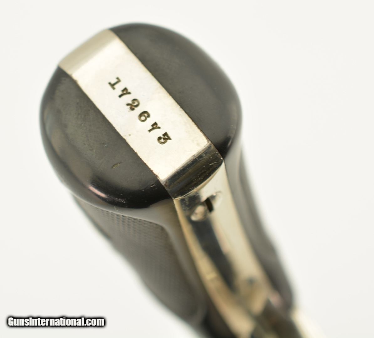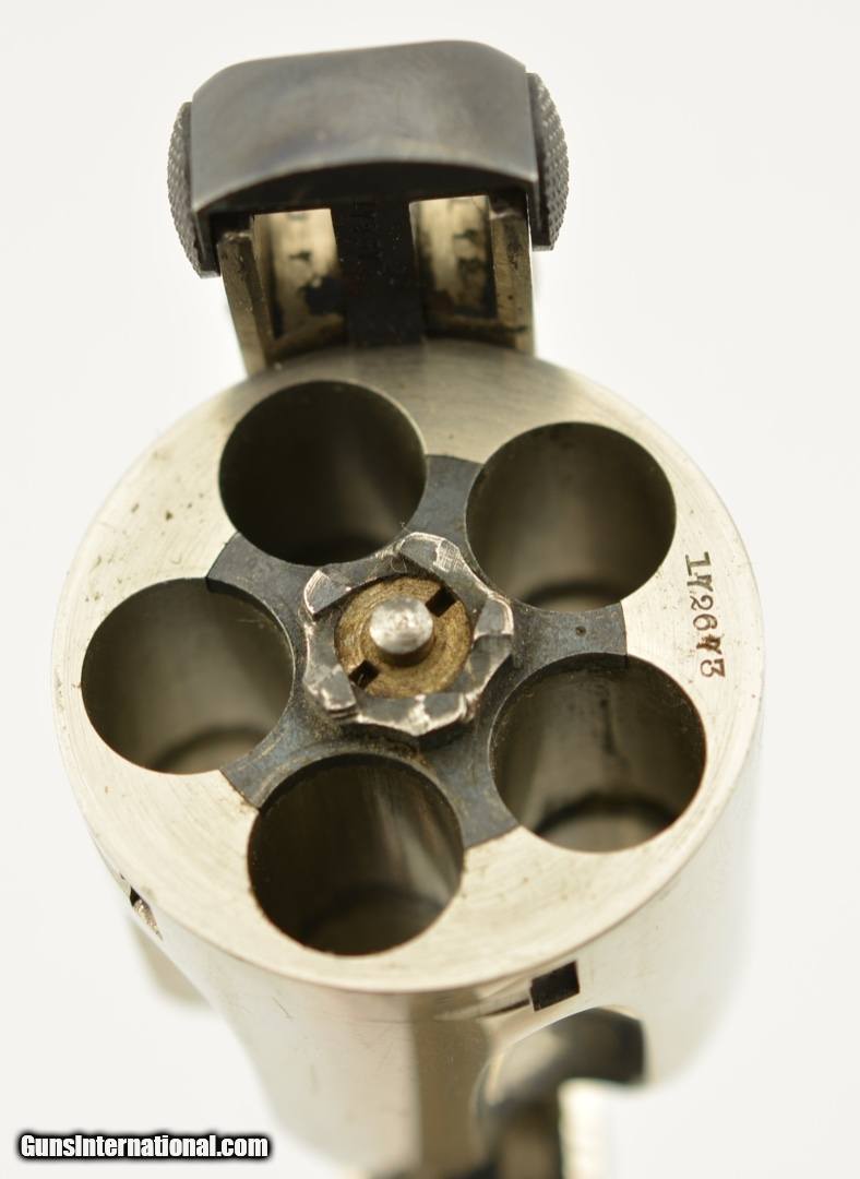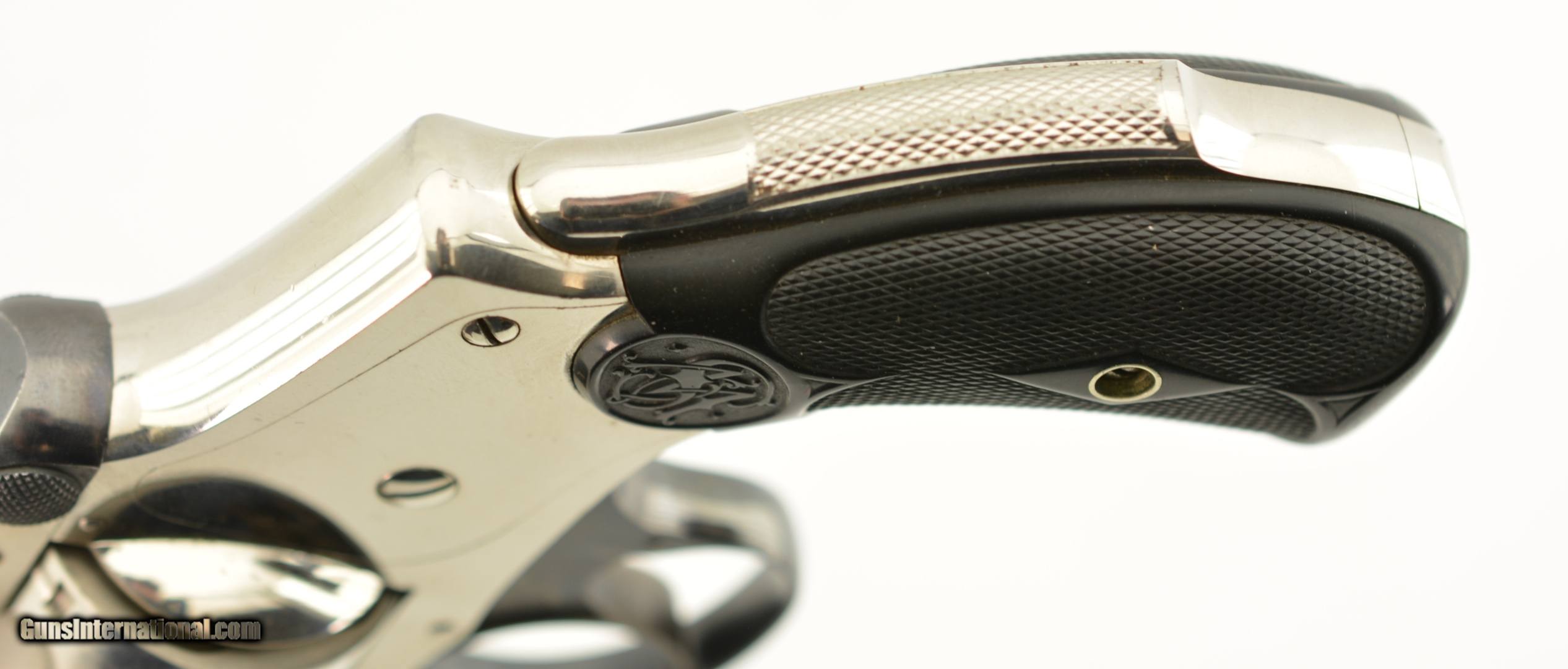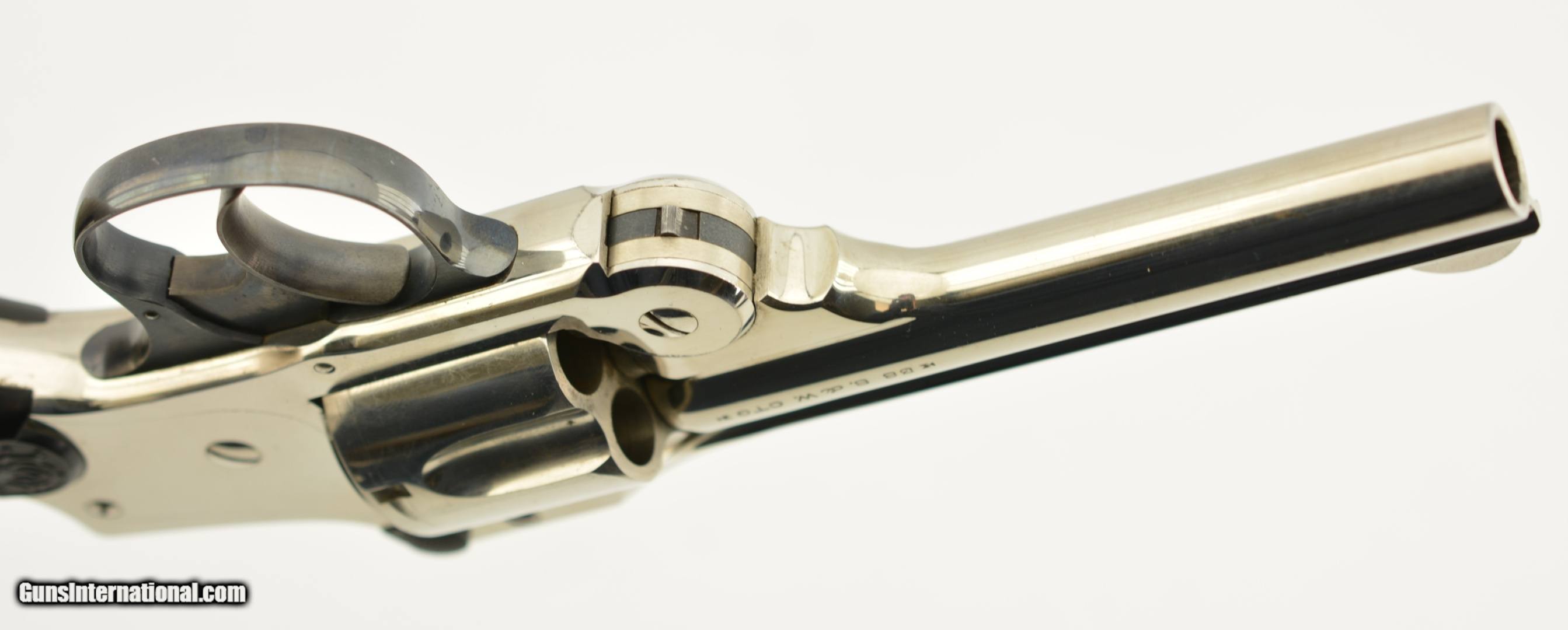 Description: Serial #172673, .38 S&W, 4" barrel with an excellent, bright bore. This is a ca. 1903-made revolver that has matching numbers on the frame, barrel, cylinder, latch, and extractor. The metal retains 98-99% of the original nickel-plated finish, which has some mild freckling starting to form on tip of the hinge screw, scattered minor surface scratches, and a mild turn-ring on the rear of the cylinder. The trigger guard and latch retain a commensurate amount of the original blue finish, and the trigger has about 75-80% of the original color case-hardening remaining. The hard rubber grips are original and numbered to the gun on the interior. Both panels are in fine shape with few handling marks and very little flattening of the points. The lock-up is tight, and the action functions flawlessly. This is an excellent example of a 4th Model "Lemon Squeezer" overall, and would make a great addition to any collection. FFL or C&R; SOLD |