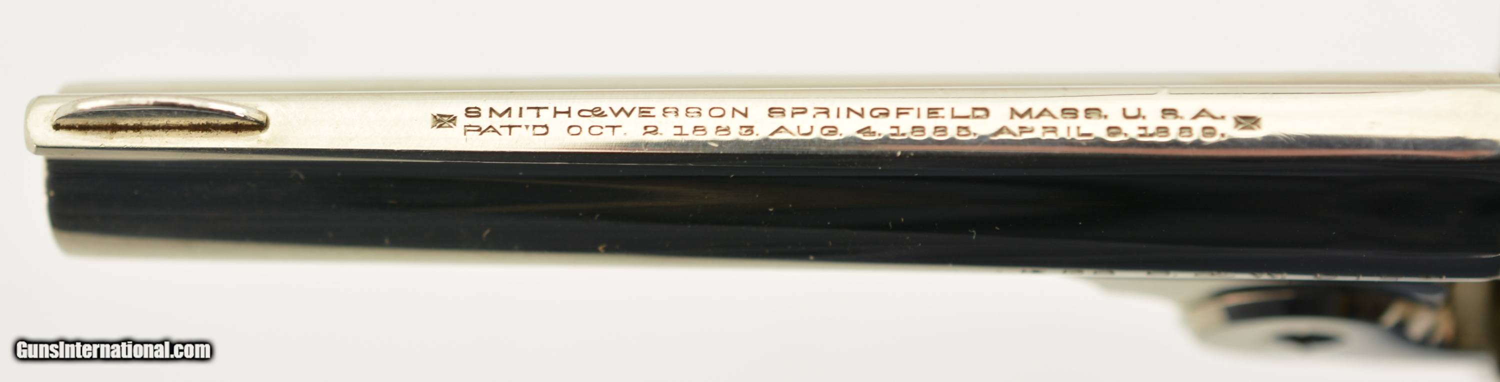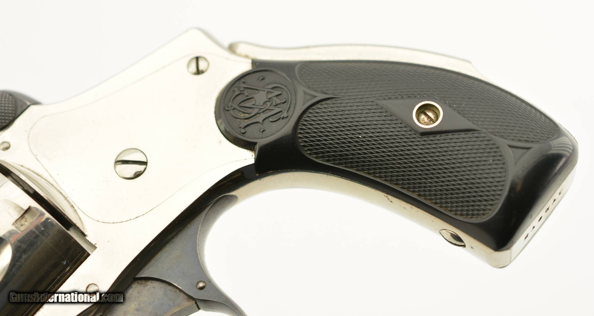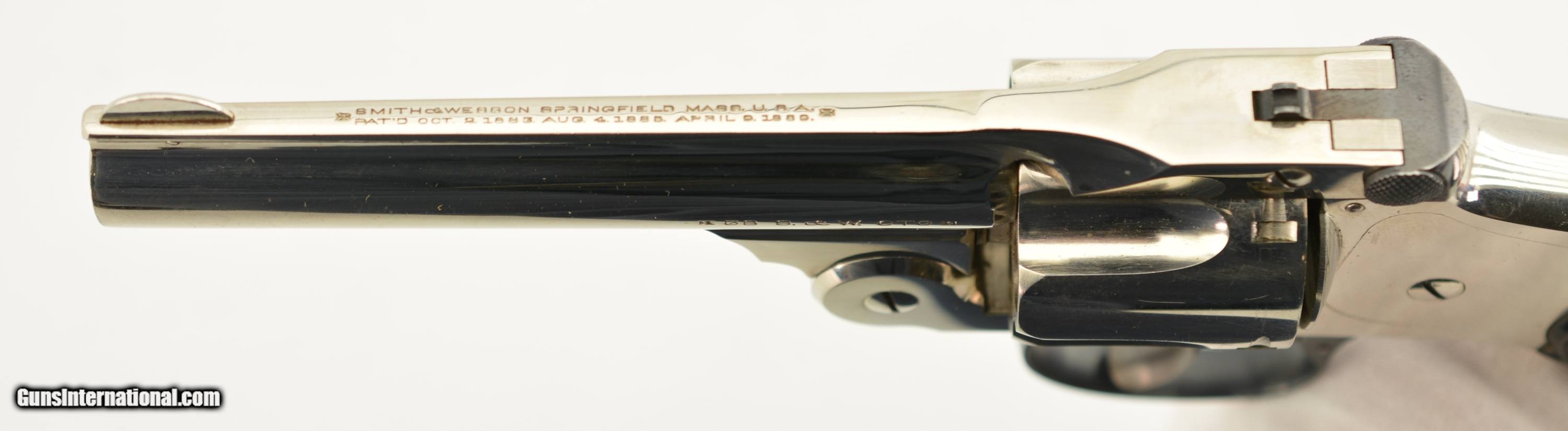 Description: Serial #172673, .38 S&W, 4" barrel with an excellent, bright bore. This is a ca. 1903-made revolver that has matching numbers on the frame, barrel, cylinder, latch, and extractor. The metal retains 98-99% of the original nickel-plated finish, which has some mild freckling starting to form on tip of the hinge screw, scattered minor surface scratches, and a mild turn-ring on the rear of the cylinder. The trigger guard and latch retain a commensurate amount of the original blue finish, and the trigger has about 75-80% of the original color case-hardening remaining. The hard rubber grips are original and numbered to the gun on the interior. Both panels are in fine shape with few handling marks and very little flattening of the points. The lock-up is tight, and the action functions flawlessly. This is an excellent example of a 4th Model "Lemon Squeezer" overall, and would make a great addition to any collection. FFL or C&R; SOLD |