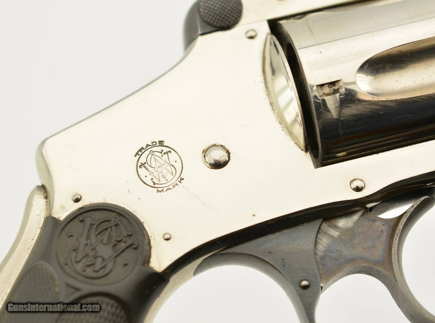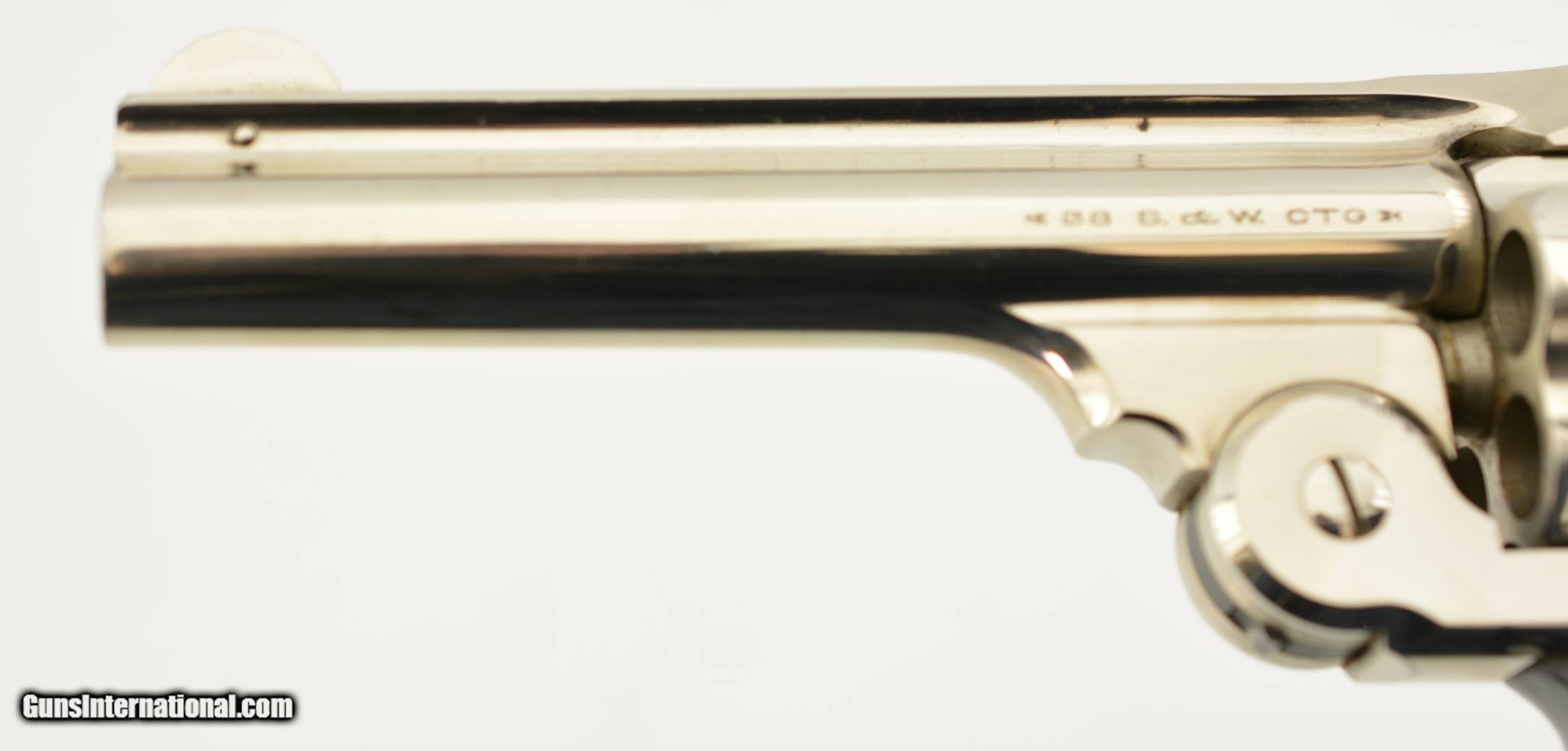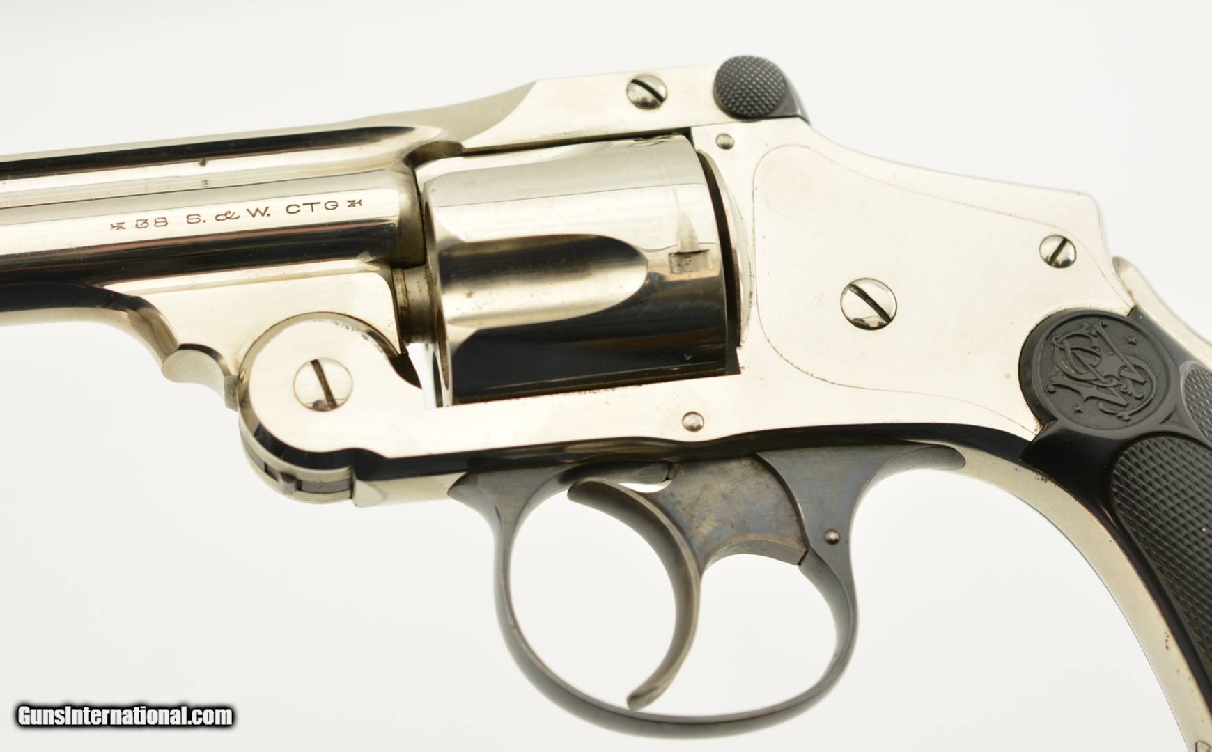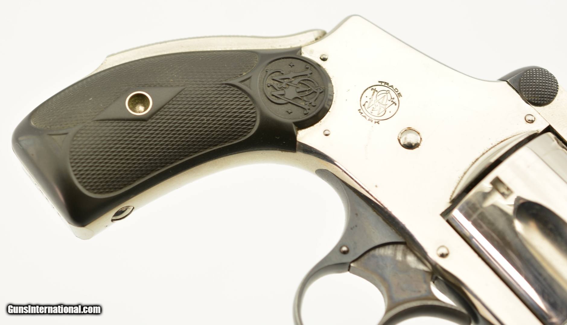Description: Serial #172673, .38 S&W, 4" barrel with an excellent, bright bore. This is a ca. 1903-made revolver that has matching numbers on the frame, barrel, cylinder, latch, and extractor. The metal retains 98-99% of the original nickel-plated finish, which has some mild freckling starting to form on tip of the hinge screw, scattered minor surface scratches, and a mild turn-ring on the rear of the cylinder. The trigger guard and latch retain a commensurate amount of the original blue finish, and the trigger has about 75-80% of the original color case-hardening remaining. The hard rubber grips are original and numbered to the gun on the interior. Both panels are in fine shape with few handling marks and very little flattening of the points. The lock-up is tight, and the action functions flawlessly. This is an excellent example of a 4th Model "Lemon Squeezer" overall, and would make a great addition to any collection. FFL or C&R; SOLD |
