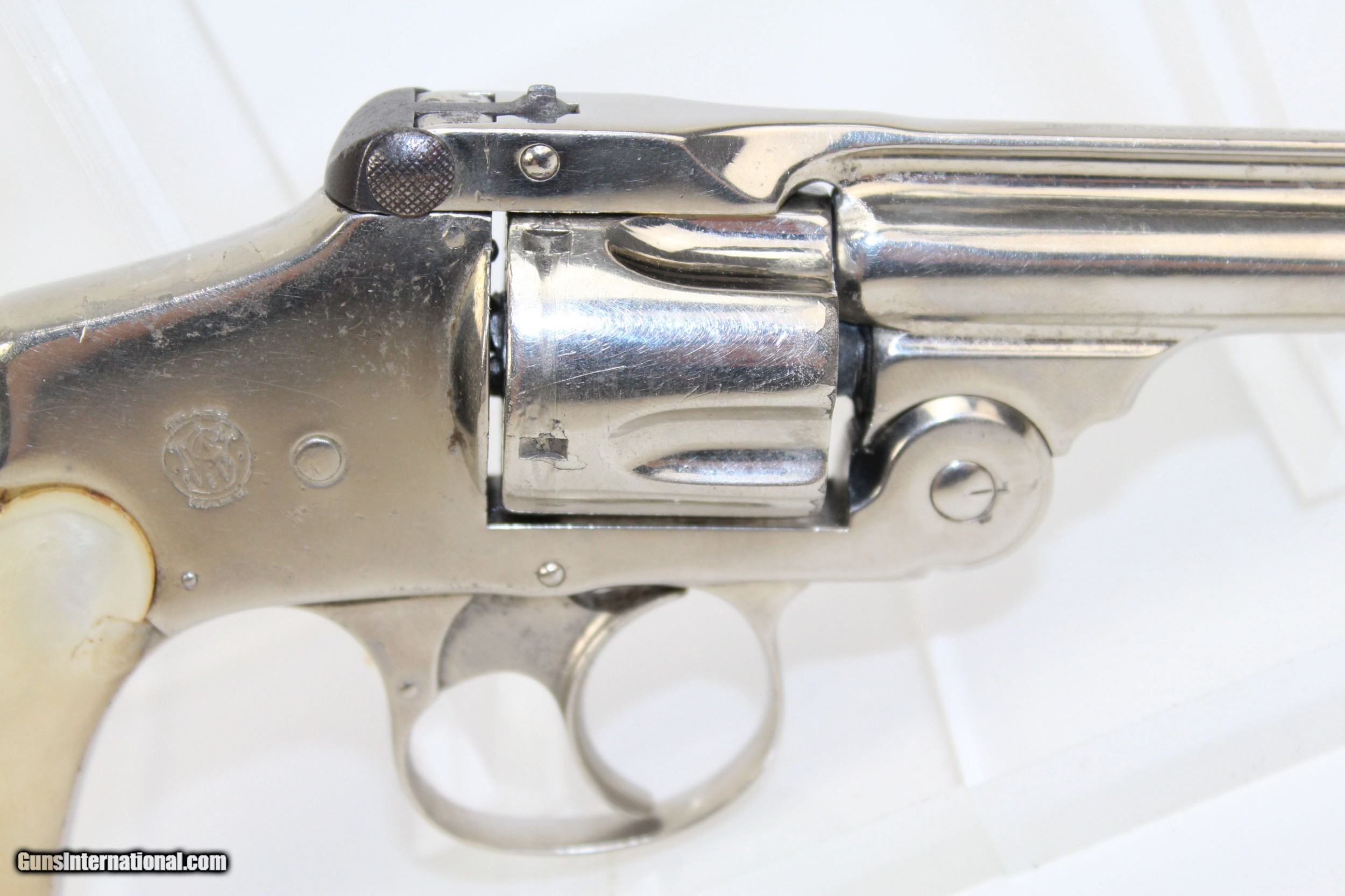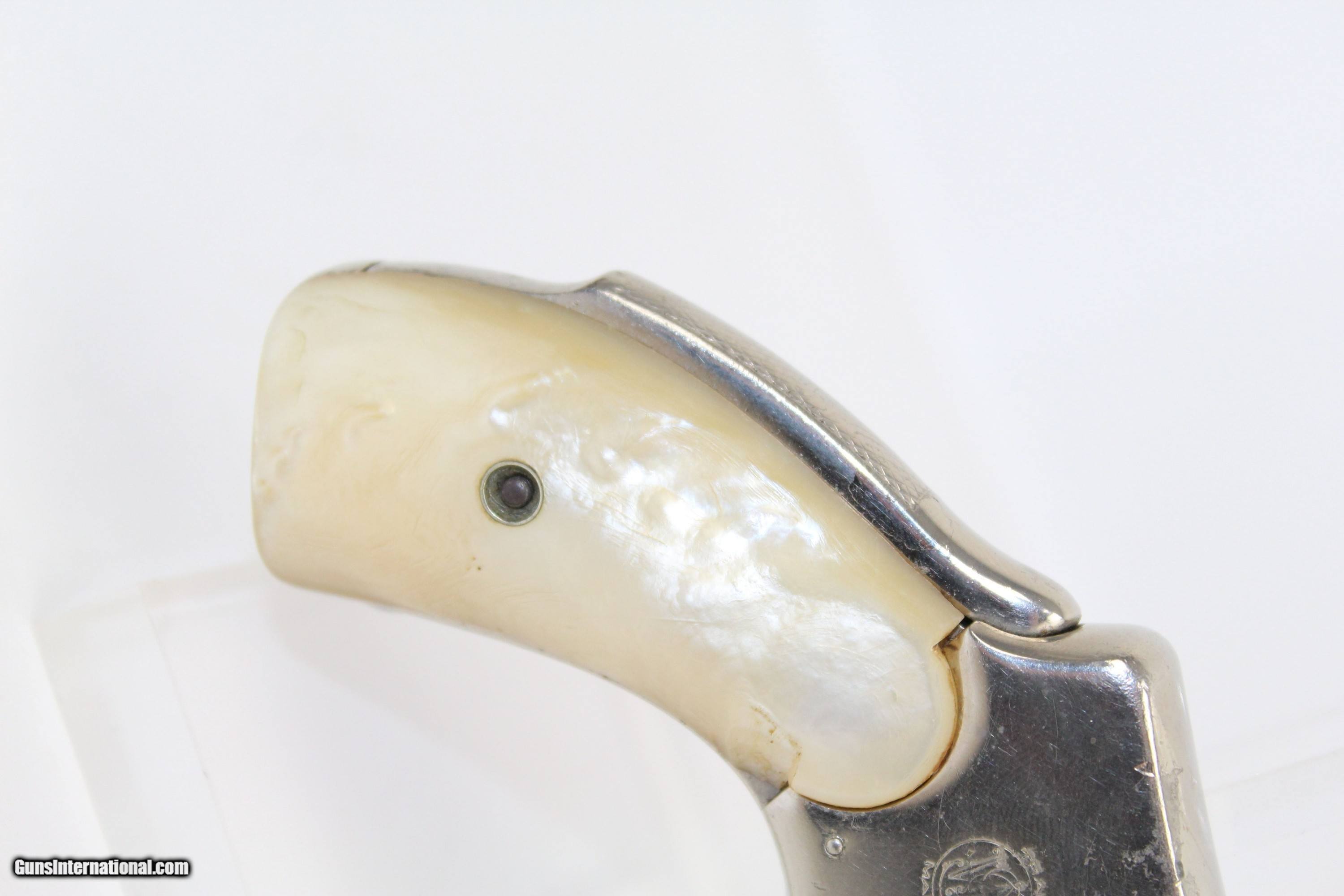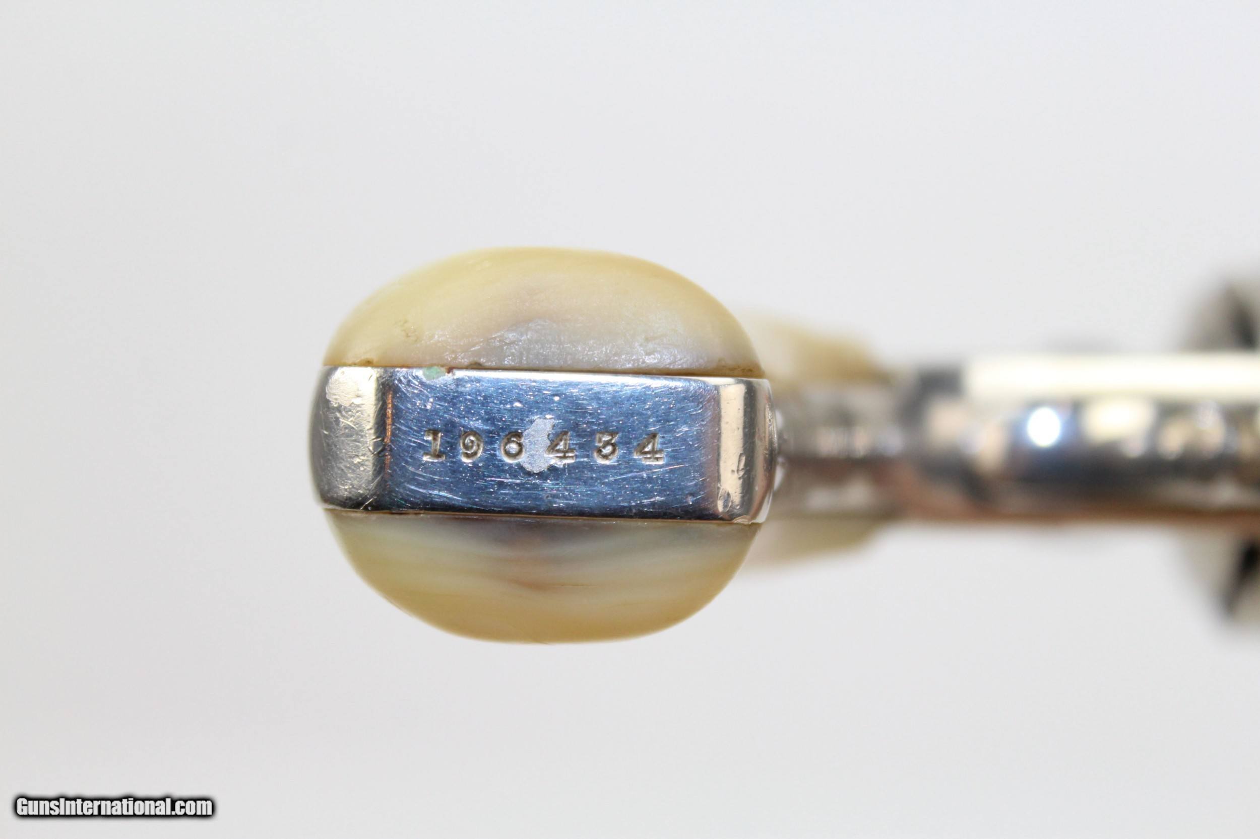 Description: S&W .38 Safety Hammerless 4th Model Revolver Featuring Beautiful Pearl Grips Here we present a Smith & Wesson Safety Hammerless 4th Model Revolver, manufactured circa 1907 in Springfield, Massachusetts. They were also known as the “New Departure” or the “Lemon Squeezer”, the latter due to the safety bar on the backstrap. This little revolver holds 5 shots of .38 S&W. It was designed to meet the defensive needs of citizens and law enforcement in the late 19th Century. This is a top break design with an automatic ejector, hammerless design and grip safety. These features made it great for pocket carry. This S&W Revolver features a great nickel finish with pearl grips. The left side of the barrel is marked “.38 S&W CTG”. The top of the barrel is marked ‘SMITH&WESSON SPRINGFIELD, MASS U.S.A./PAT’D OCT.2.1880, AUG.4.1885, APRIL.9.1889”. The overall condition is very good. The revolver was nickel plated again at some point with 98% remaining. The markings are clear and legible. The serial numbers match. The pearl grips are in very good shape. The bore is in good shape. The action is excellent. A nice example of one of Smith & Wesson’s most recognizable revolvers! This firearm is classified as a Curio & Relic. Barrel is 4 inches. Caliber: .38 S&W Overall condition as seen in photos. Very Fast. Very Safe. FREE SHIPPING. Will need to be sent to your local FFL or C&R licensee. This firearm is classified as a Curio & Relic. Guaranteed AUTHENTIC & Includes CERTIFICATE OF AUTHENTICITY. ancestryguns $475 #7304 SOLD Curio/Relic: Yes |