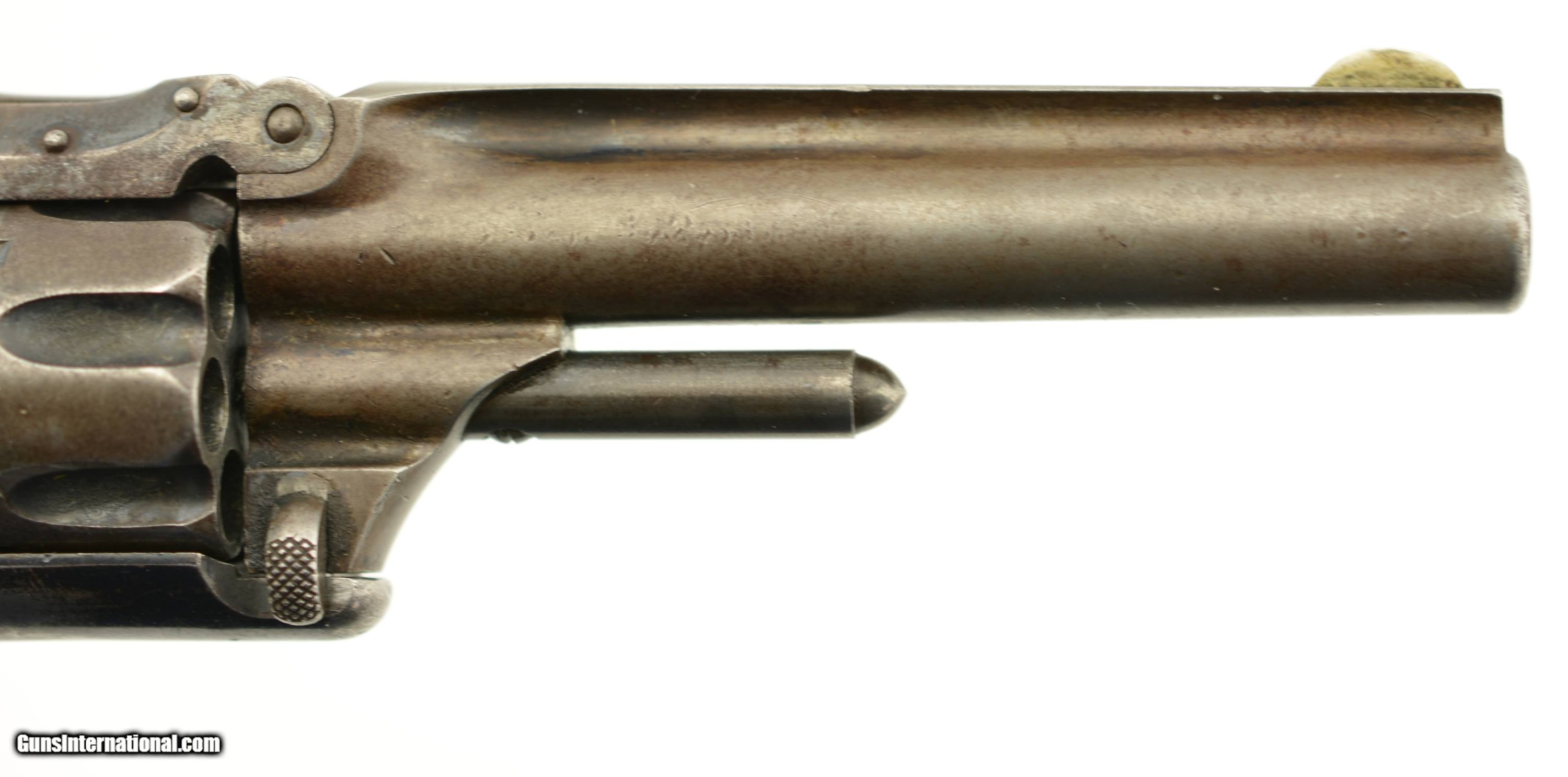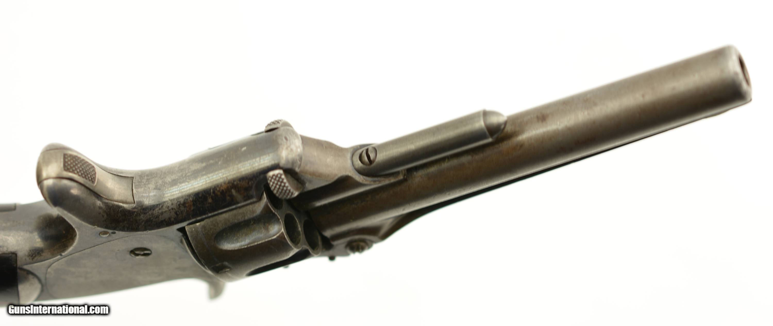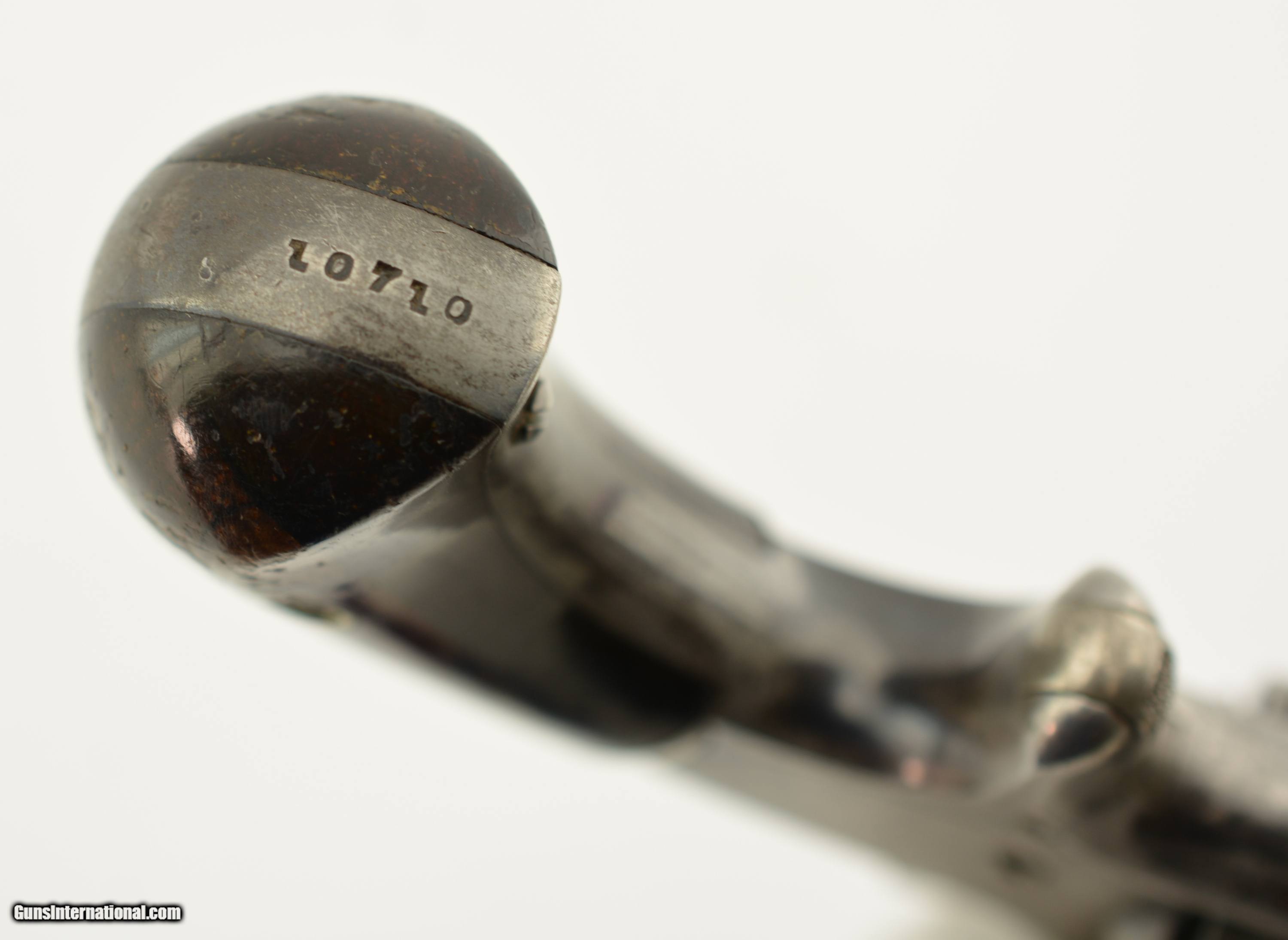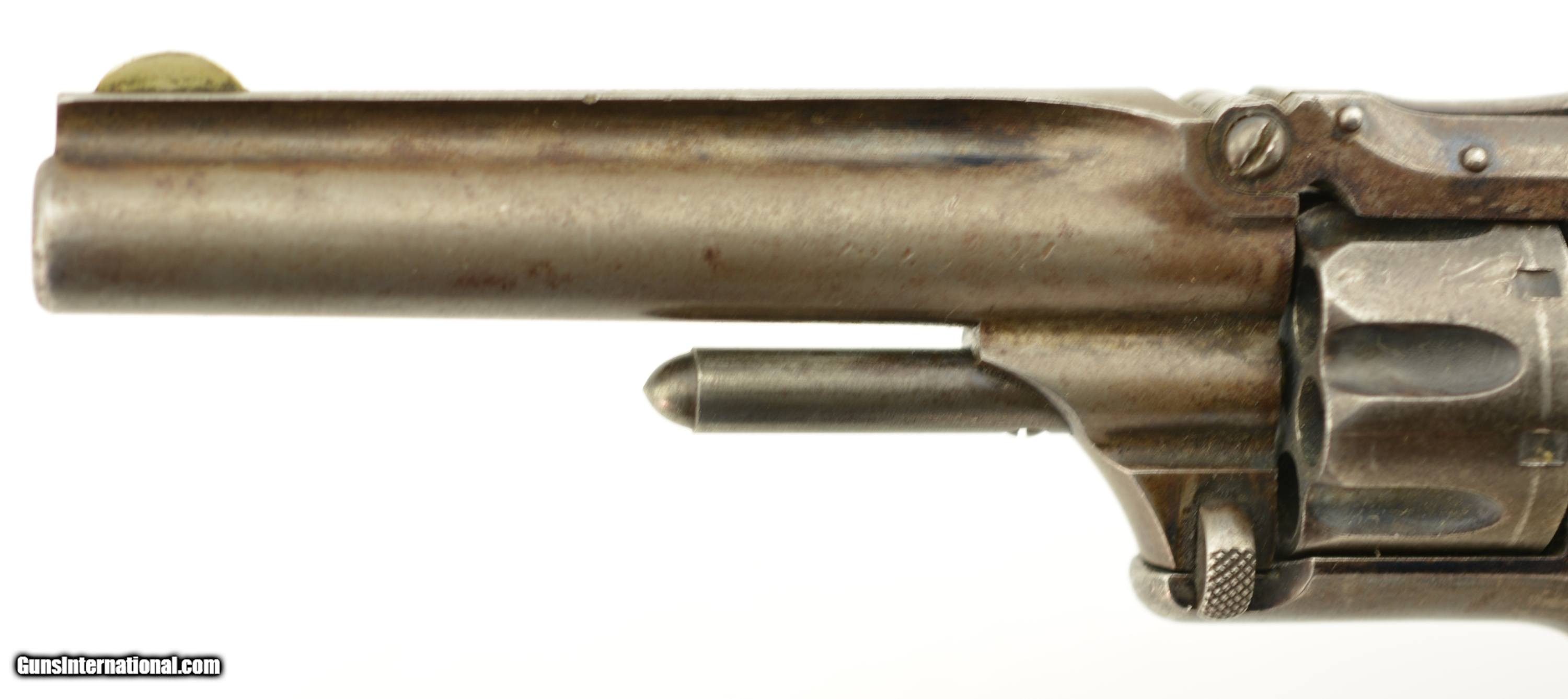 Description: Serial #10710, .22 RF, 3 3/16" barrel with a fine, bright bore that has some mild freckling towards the breech. This is a nice little revolver that has retained 30-40% of the original bright blue, mainly on the right side of the frame, and the balance turned to a smooth, mottled gray patina with mottled surface freckling in spots. The cylinder has a moderate turn-ring, with original blue turning plum-brown remaining. Matching assembly numbers are present on the frame, barrel , and cylinder ("G6"). The rosewood grips, numbered to the gun on the interior, are in good-very good shape, with minor surface marks and small bruises on both panels. The barrel lock-up is still tight with some barely noticeable lateral play in the barrel, and the action functions flawlessly. This is a very good plus example of a 3rd Issue No. 1 S&W, and would make a nice addition to any collection. Antique SOLD Antique: Yes Manufacturer: S&W Model: No. 1 Serial Number: 10710 Caliber Info: .22 Gauge Info: .22 |