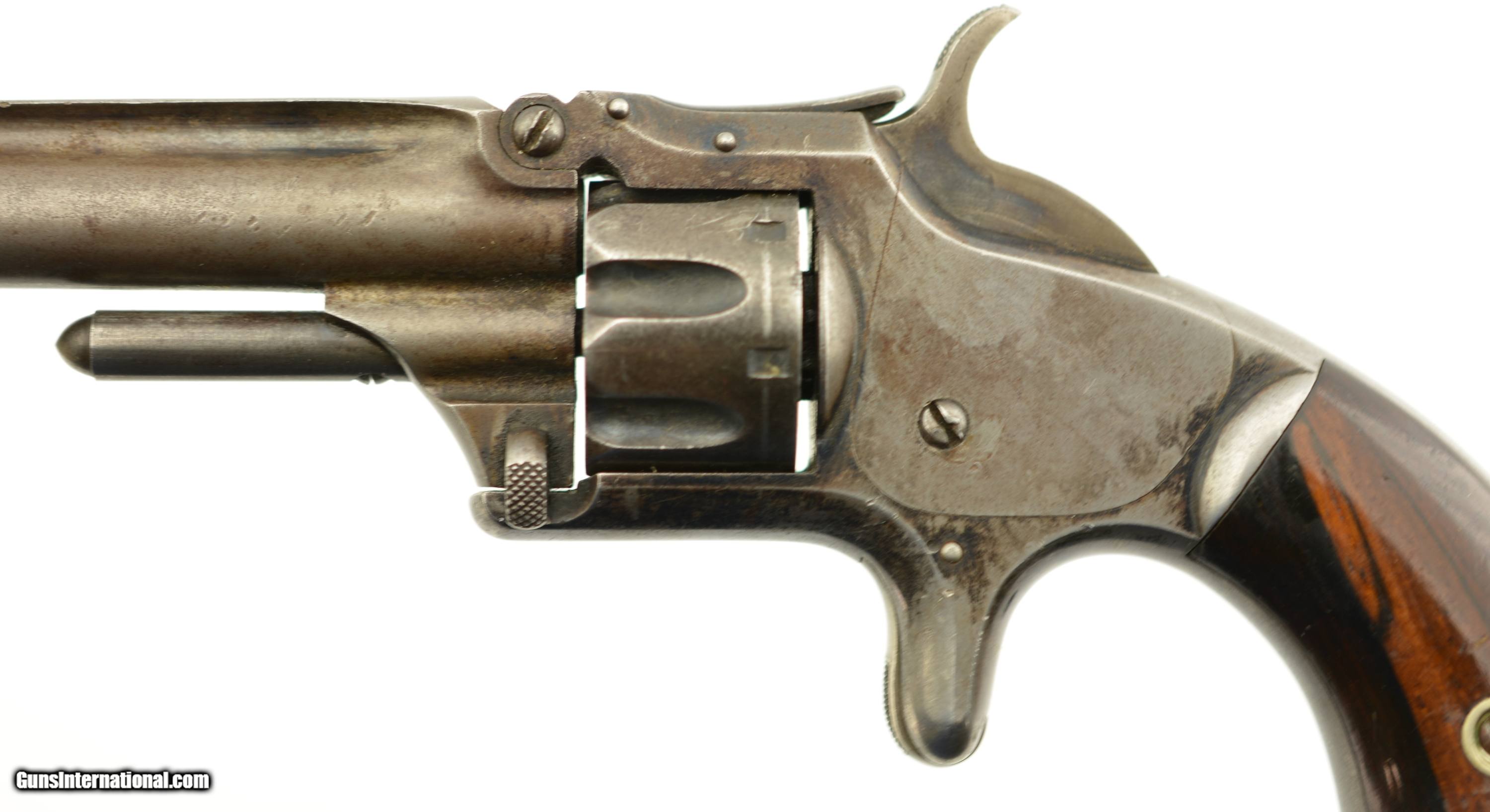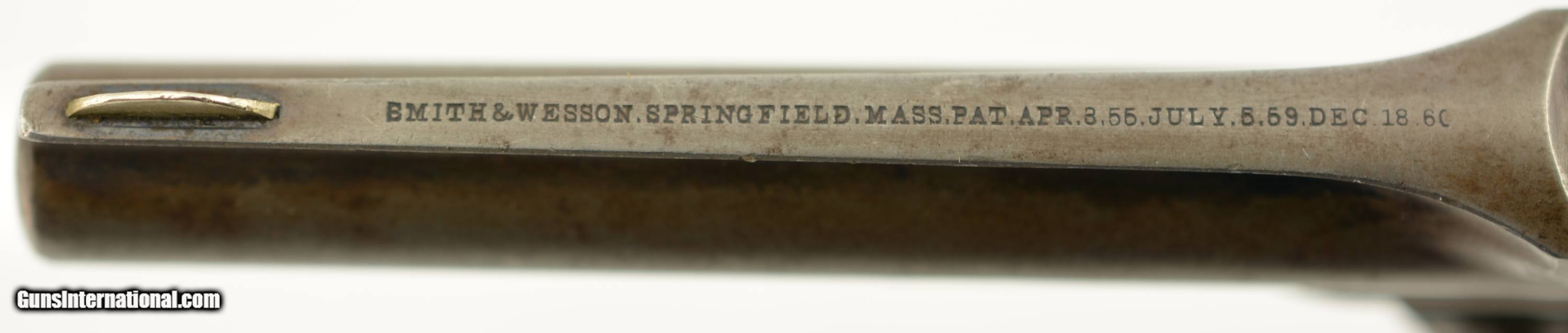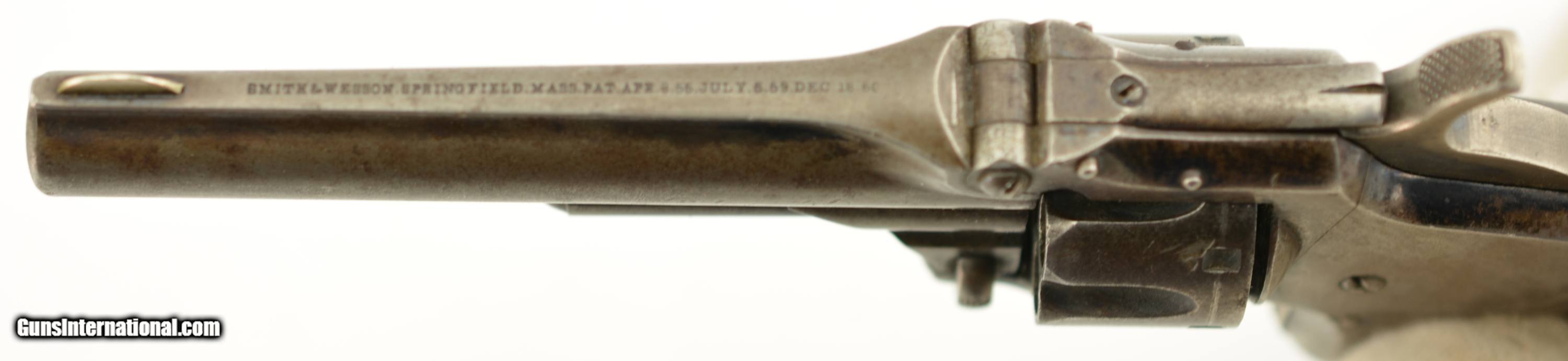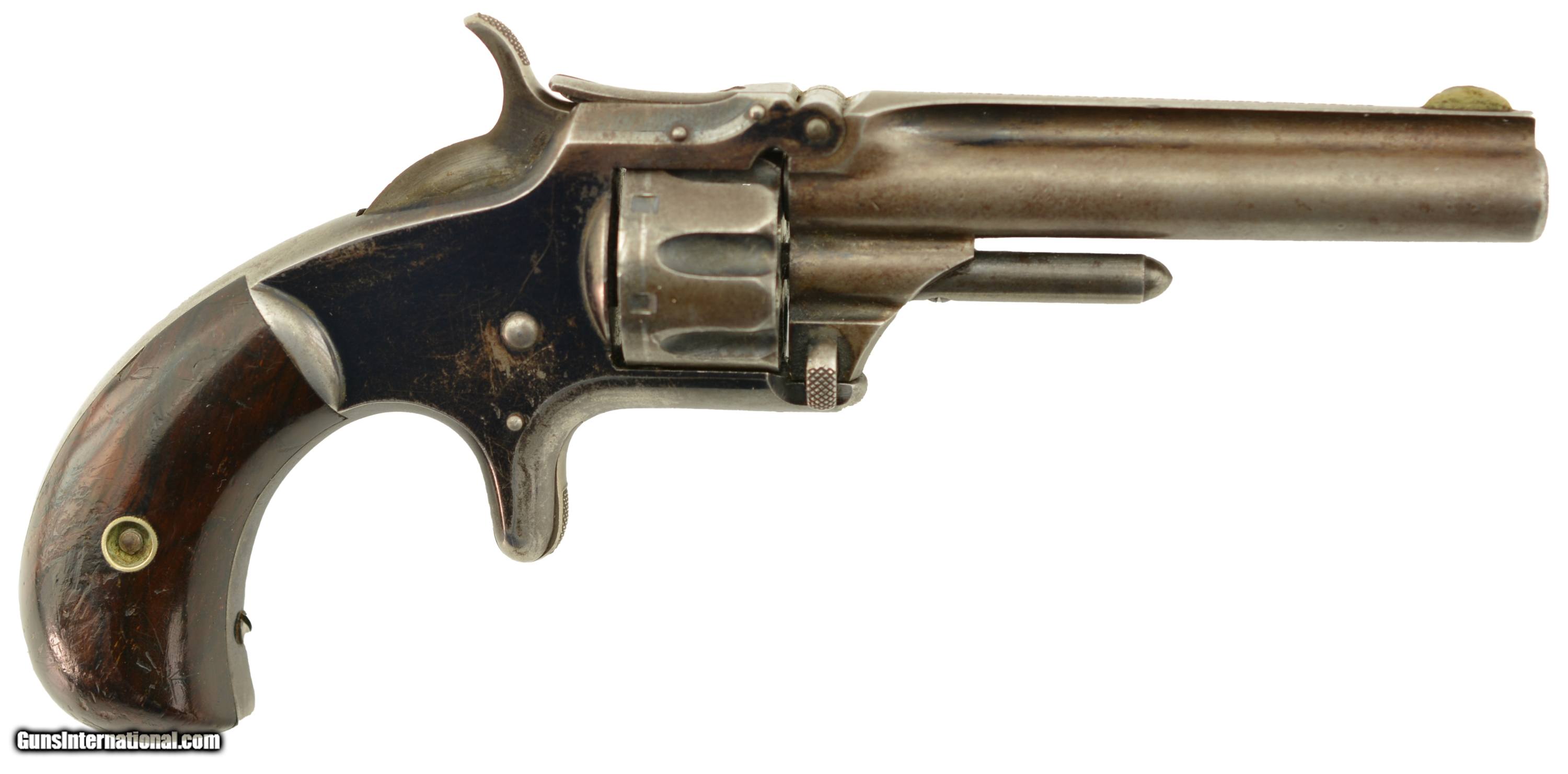 Description: Serial #10710, .22 RF, 3 3/16" barrel with a fine, bright bore that has some mild freckling towards the breech. This is a nice little revolver that has retained 30-40% of the original bright blue, mainly on the right side of the frame, and the balance turned to a smooth, mottled gray patina with mottled surface freckling in spots. The cylinder has a moderate turn-ring, with original blue turning plum-brown remaining. Matching assembly numbers are present on the frame, barrel , and cylinder ("G6"). The rosewood grips, numbered to the gun on the interior, are in good-very good shape, with minor surface marks and small bruises on both panels. The barrel lock-up is still tight with some barely noticeable lateral play in the barrel, and the action functions flawlessly. This is a very good plus example of a 3rd Issue No. 1 S&W, and would make a nice addition to any collection. Antique SOLD Antique: Yes Manufacturer: S&W Model: No. 1 Serial Number: 10710 Caliber Info: .22 Gauge Info: .22 |