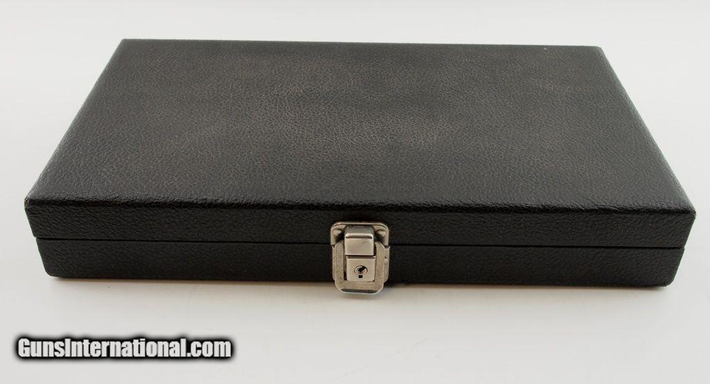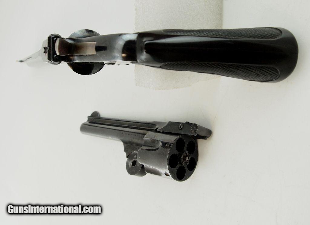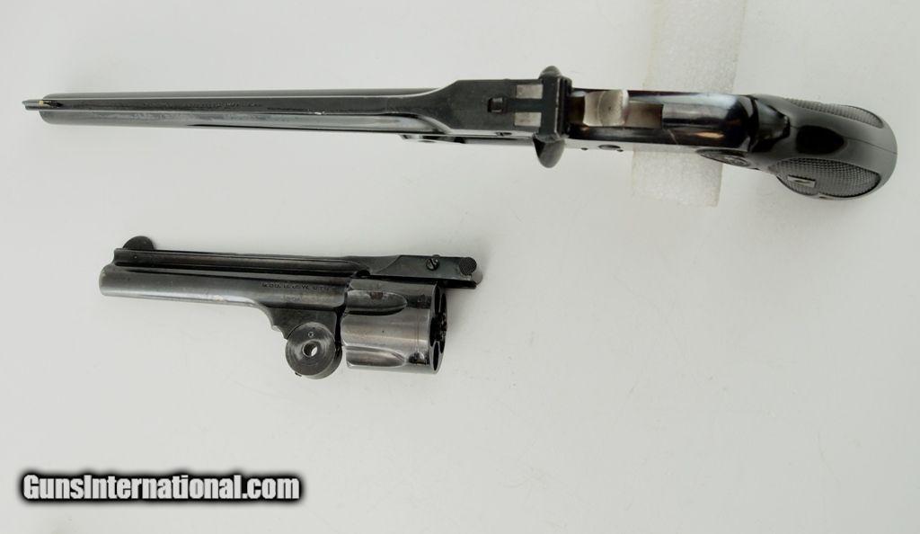 Description: S&W Single Shot of 1891 Combo .22 LR - .38 S&W Revolver with nice red velvet lined presentation case. This combo is comprised of the 1891 top break frame, an 8" single shot barrel in .22 LR, and a 4" barrel with cylinder in .38 S&W. Numbers do not match. Very nice S&W black hard rubber target stocks. Includes .22 LR and .38 S&W cartridge boxes with some cartridges. What a conversation piece! Add 3% for Credit Card Shipping $25.00 SOLD Curio/Relic: Yes |