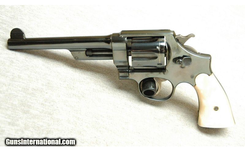 Description: Excellent, light wear, few small scratches. Triple lock, pearl like grips, manufactured 1907 to 1915. A good choice for S&W collectors. .455 Eley SOLD Curio/Relic: Yes Chambers: Revolver Metal Condition: Excellent Wood Condition: Grips are excellent Bore Condition: Bright Barrels: 6 1/2 Triggers: Double and single action Butt Pad: Pear like grips Sights: Fixed sights Item Location: La Vista, NE |