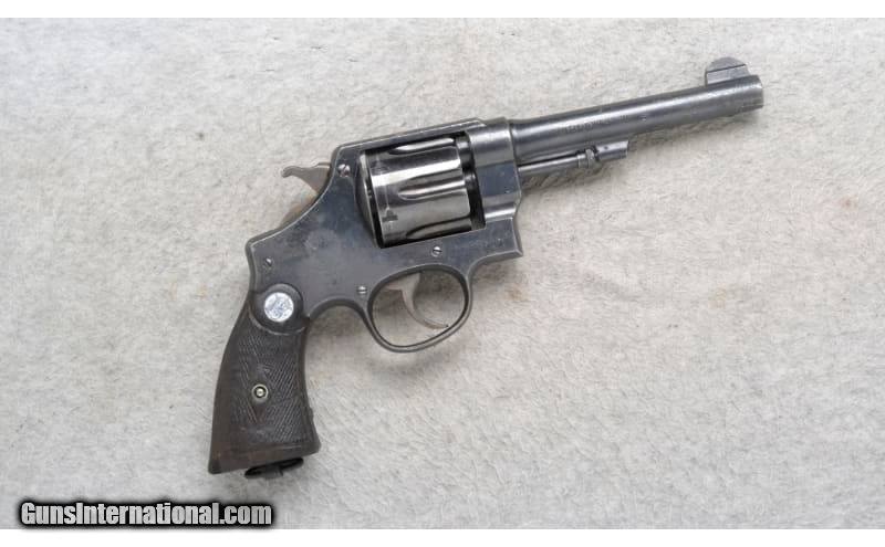 Description: This Smith & Wesson Model D.A.45 is a 6 shot DA/SA revolver in .45 ACP Cal. It has a 5.5 inch barrel. A blade front sight and an integral notch rear sight. The grip is a diamond checkered hardwood with silver S&W medallions. The right side of the frame is stamped with a star and has Brazil 1937. Serial Number 197035. .45 ACP SOLD Chambers: 6 shot. Metal Condition: "Fair. Shows age, use, wear and freckling. Wood Condition: Poor. Has wear and handling/use marks. Bore Condition: Fair. Looks worn. Barrels: 5.5 inch. Triggers: DA/SA Weight: 36 oz. Sights: Blade front. Integral notch rear. Item Location: Richfield, WI |
