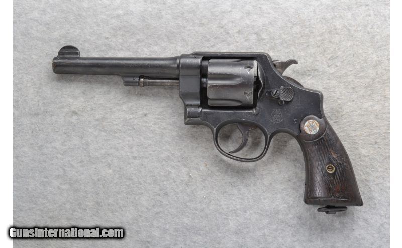 Description: This Smith & Wesson Model D.A. 45 double action revolver comes in a 6 round .45 A.C.P. Cal. It does show some age and wear but has very good barrel rifling. The right side frame has a worn stamp that has a large star with the word Brazil - 15 JAN 1889 and 1937 underneath it. SOLD Caliber Info: .45 A.C.P. Chambers: 6 shot. Metal Condition: Fair. Shows age, use and wear. Wood Condition: Fair. Shows age, use and wear. Bore Condition: Very good. Barrels: 5.5 inches. Triggers: Single Action / Double Action Stock: Diamond checkered hardwood grip with silver S&W medallions. Lanyard swivel. Weight: 36 oz. Sights: Blade front. Integral notch rear. Item Location: Richfield, WI |
