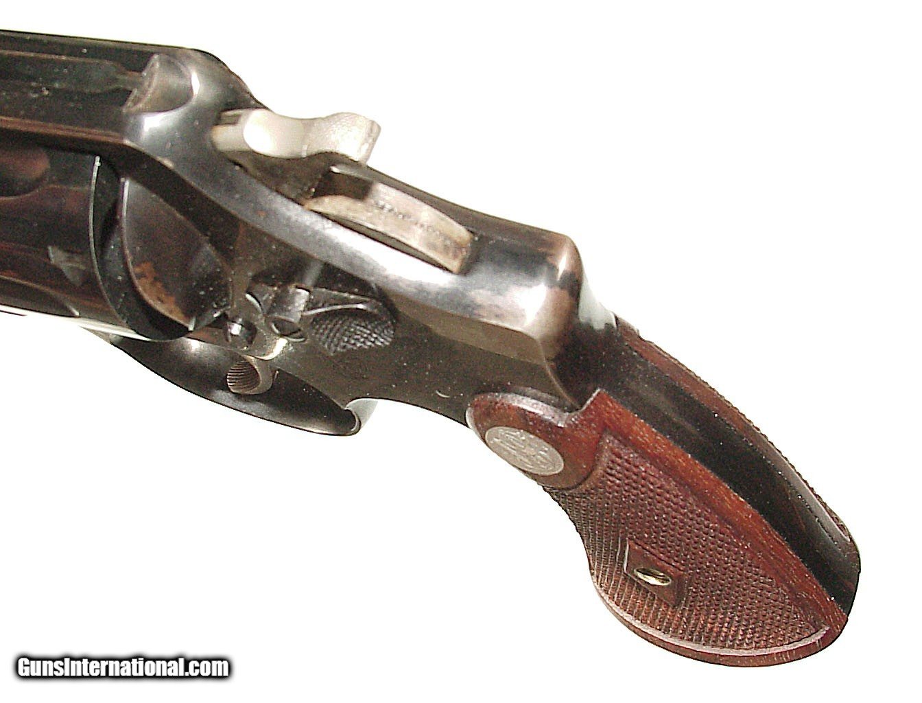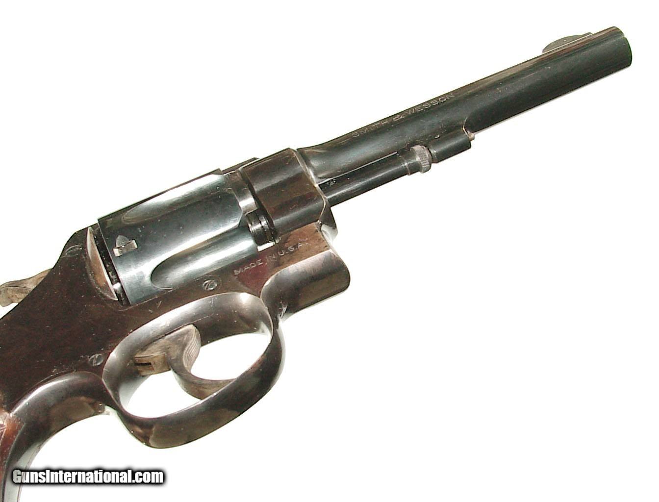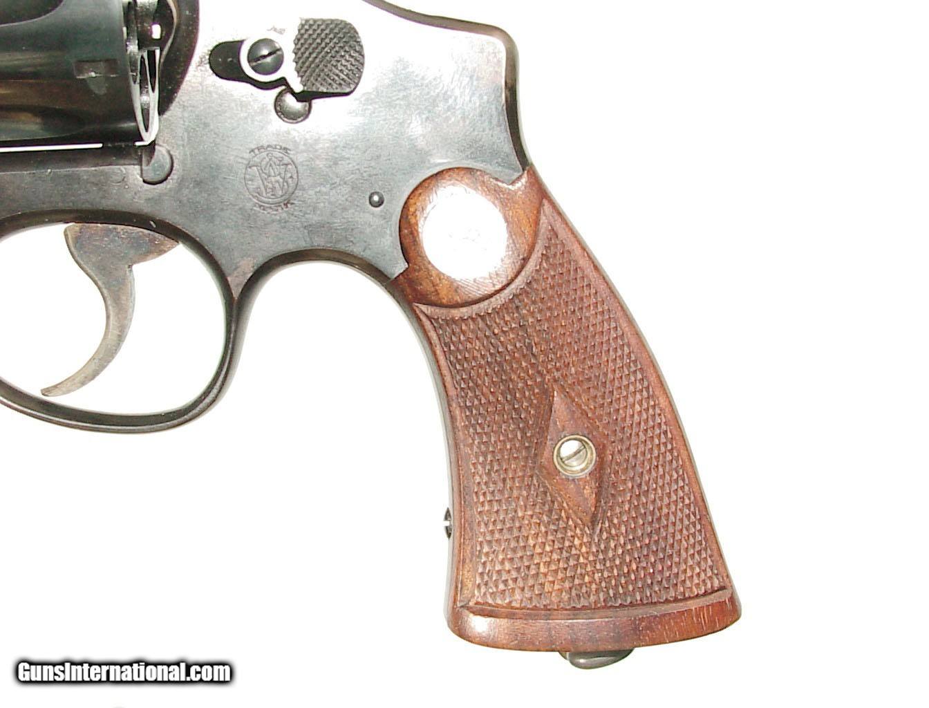 Description: .45 a.c.p. caliber, 5 1/2" barrel with fixed sights and large rounded front blade. Finished blue with casehardened hammer & trigger. Medallion checkered walnut grips numbered to the gun. The barrel is marked (S&W D.A. 45) on the left side. Retaining nearly all of the factory blue finish with a spot of discoloration on the left side of the frame above the grip. Excellent grips. Mint bore and cylinder with only a very slight drag line. Appears to have been little used. SOLD Curio/Relic: Yes |