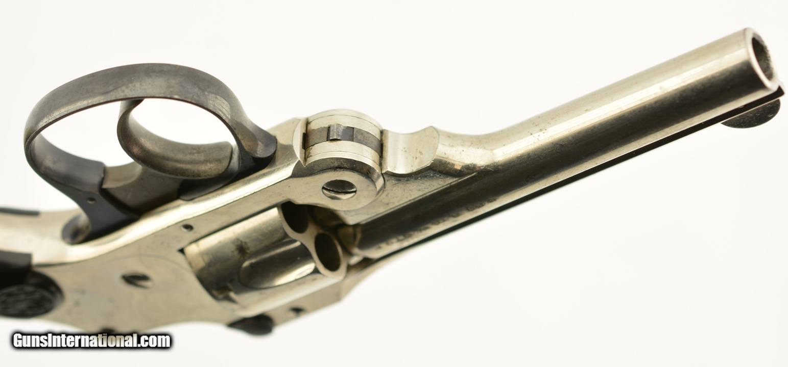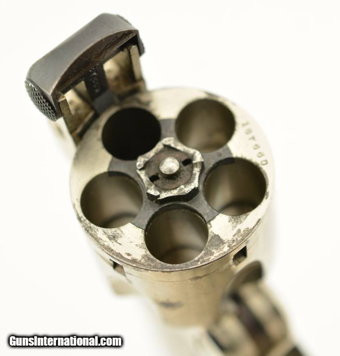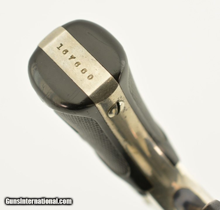 Description: Serial #167660, .32 S&W, 3 1/2" ribbed round barrel with a very good bore showing patches of light pitting and light oxidation with otherwise strong rifling. This is the Second Model 32 Safety Hammerless "Lemon Squeezer" revolver manufactured from 1902-09. The metal surfaces of this Second Model revolver retain about 93-95% original nickel finish showing areas of light cloudiness, light flaking and bubbling, and a few spots of pinprick pitting and wear toning to brown. The trigger guard and barrel latch retain a similar amount of original blue with some fine speckles of light oxidation and a touch of light wear to gray. The trigger retains most of its original smoky case-hardened finish with some speckles of light oxidation on the face. All the numbered parts are serialized to the frame and the right grip panel is stamp-numbered to the gun. The checkered hard rubber grips rate about very good plus to near excellent with some minor handling marks and spots of softened checkering. Barrel-to-frame fit, timing, and lock-up are all excellent and the action appears to function well mechanically. FFL or C&R SOLD Curio/Relic: Yes |
