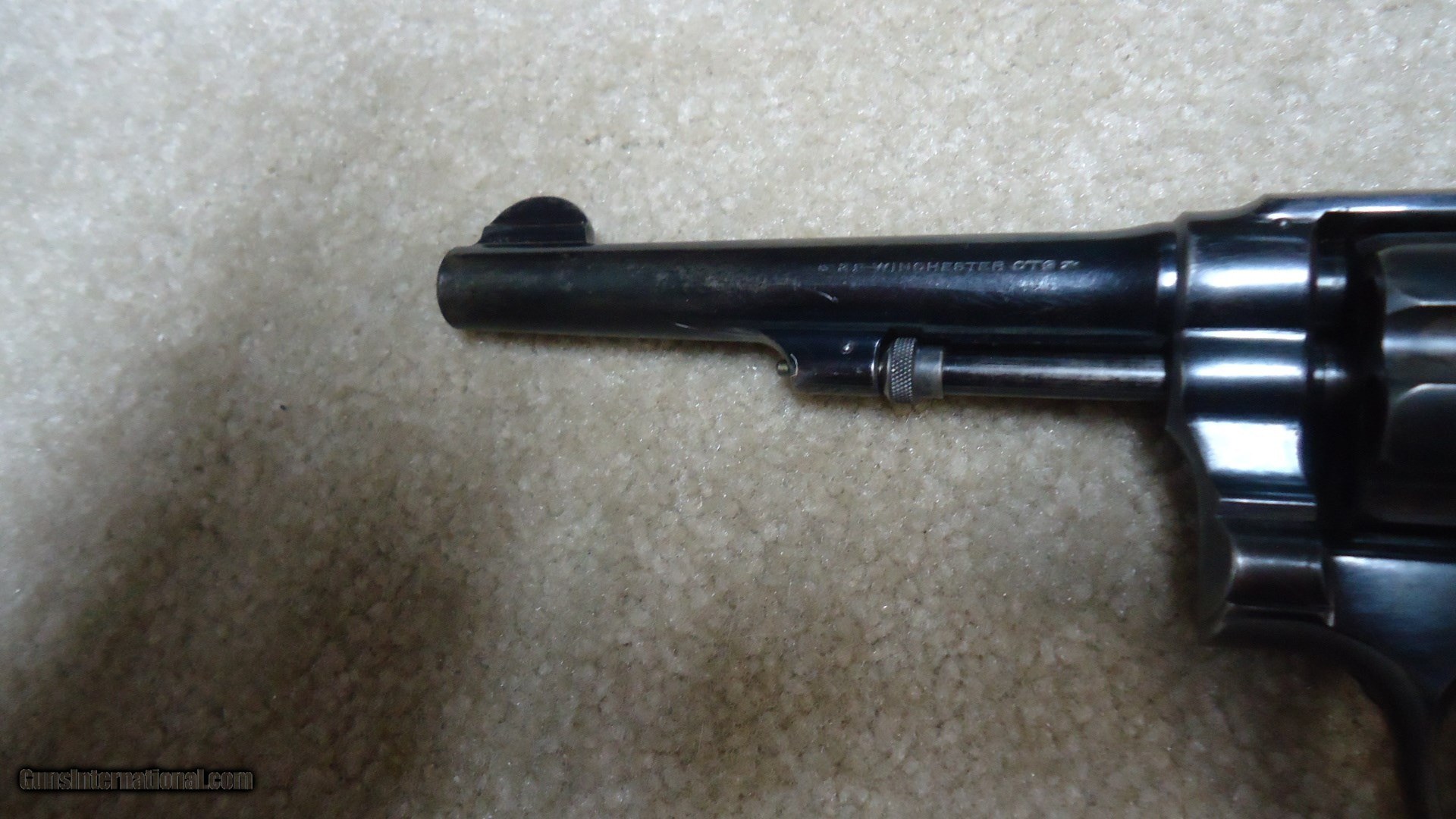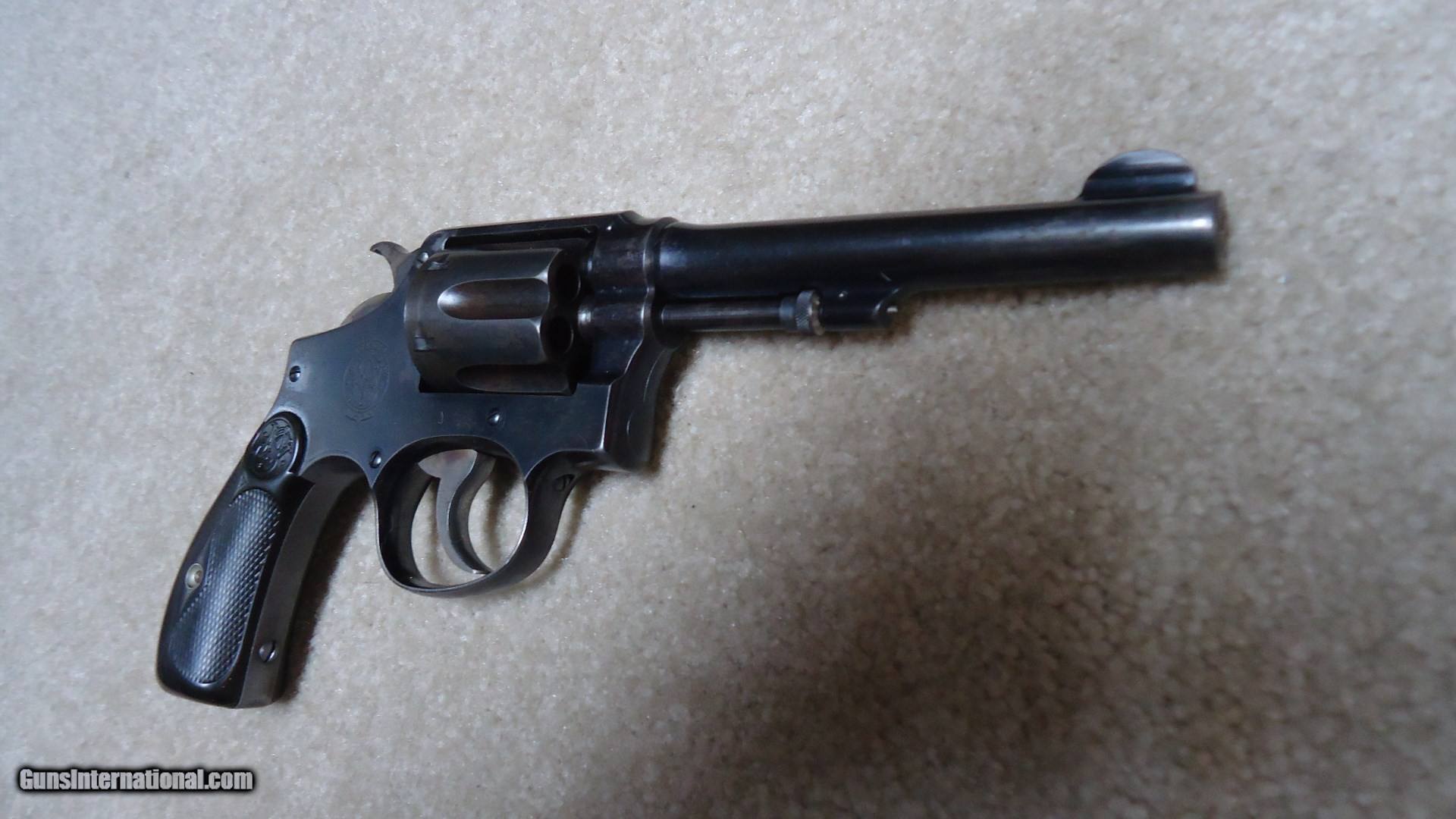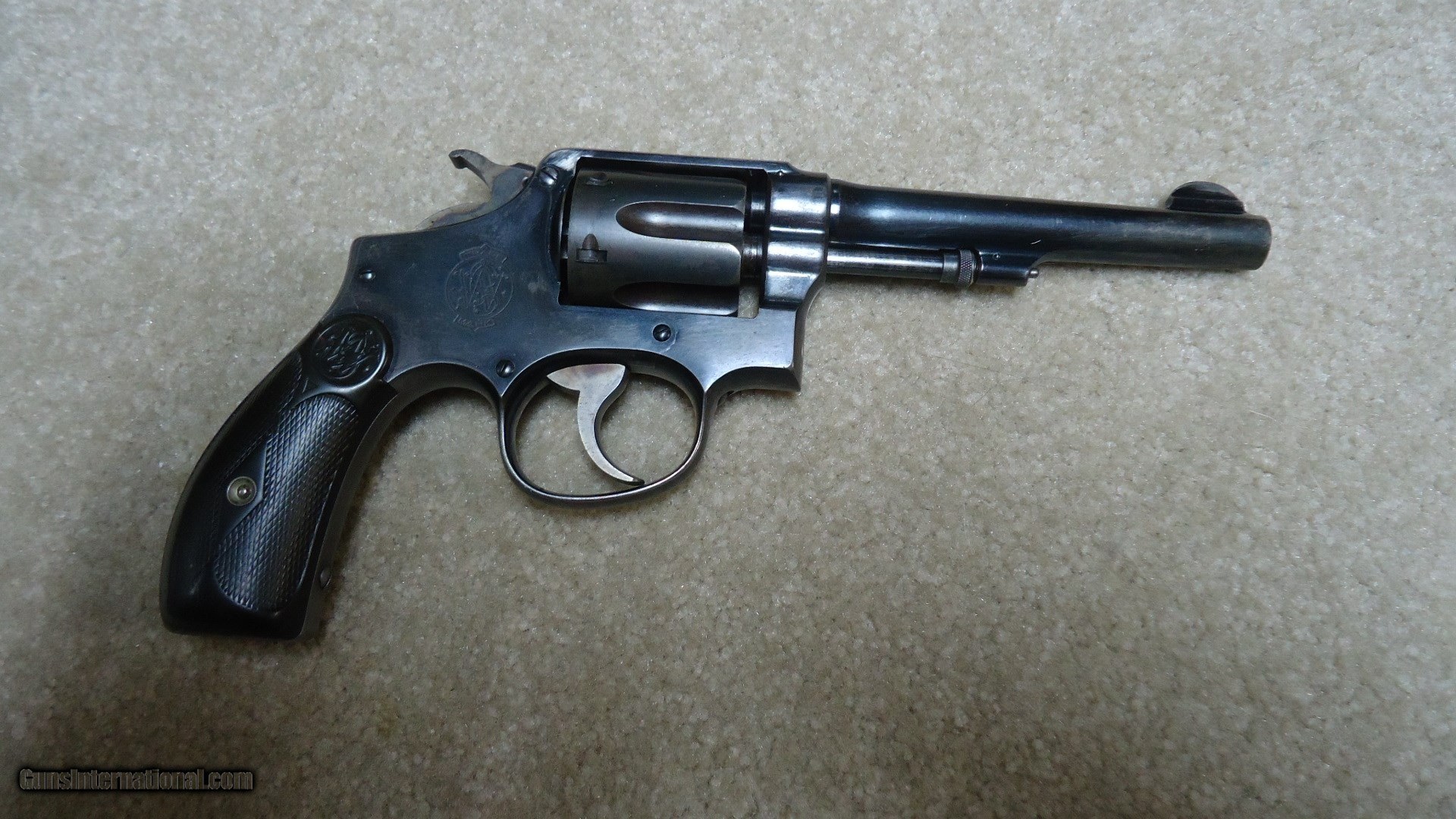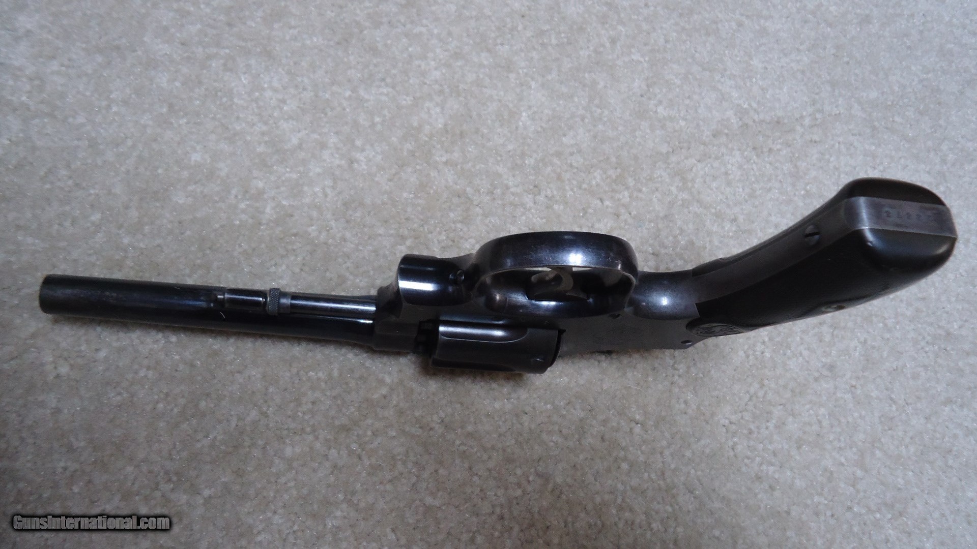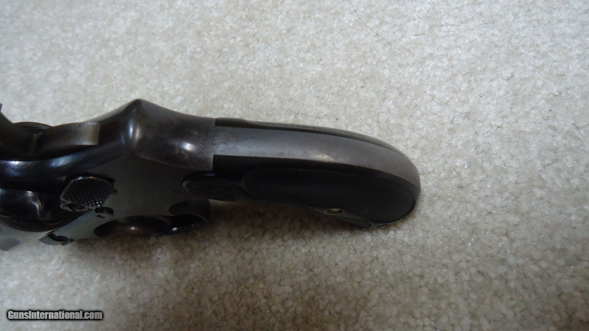 Description: VERY LIMITED PRODUCTION 32-20 MODEL 1905 1ST CHANGE, #23XXX, ONLY 11,073 MADE FROM 1906-1909. This is a blued example with correct scarce round butt (made with square butt also) and 5” barrel. Serial range for this model ran from 22427 to about 33500. No doubt this is an early first year production example from 1906. Matching serial numbers on the barrel, cylinder, frame and inside the grips. It is especially hard to find one of these early .32-20 Hand Ejectors in decent condition as they were typically “outdoorsman’s” sidearms that were paired with a Winchester, Marlin or Colt Lightning rifle in the same caliber and carried afield where they saw hard outdoor use. Many of the same model in .38 Special caliber ended up in bedside tables and are found in excellent condition now…not so the .32-20s! This 113 year old S&W still retains some fine deep blue on the barrel, frame and protected areas. It looks like some cold blue has been added which is really no big deal. Excellent case color on the hammer and trigger sides, exc. screws, tight action, exc. bore, front sight has not been altered or filed (!), grips fit perfectly and show only normal wear- interestingly, the right grip or “outside facing” grip in a typical right-handed holster is more worn than the left or “inside” grip which would naturally be more protected from rubbing and wear. All excellent and sharp markings including the barrel address and patent dates ending in 1903. There’s nothing like the hand fitted quality and workmanship in these early Pre-War Hand Ejectors! This is a scarce one. SOLD Curio/Relic: Yes Manufacturer: SMITH & WESSON Model: 1905 .32-20 HAND EJECTOR 1ST CHANGE Serial Number: 23XXX Caliber Info: 32-20 Condition: FINE Barrels: 5 |