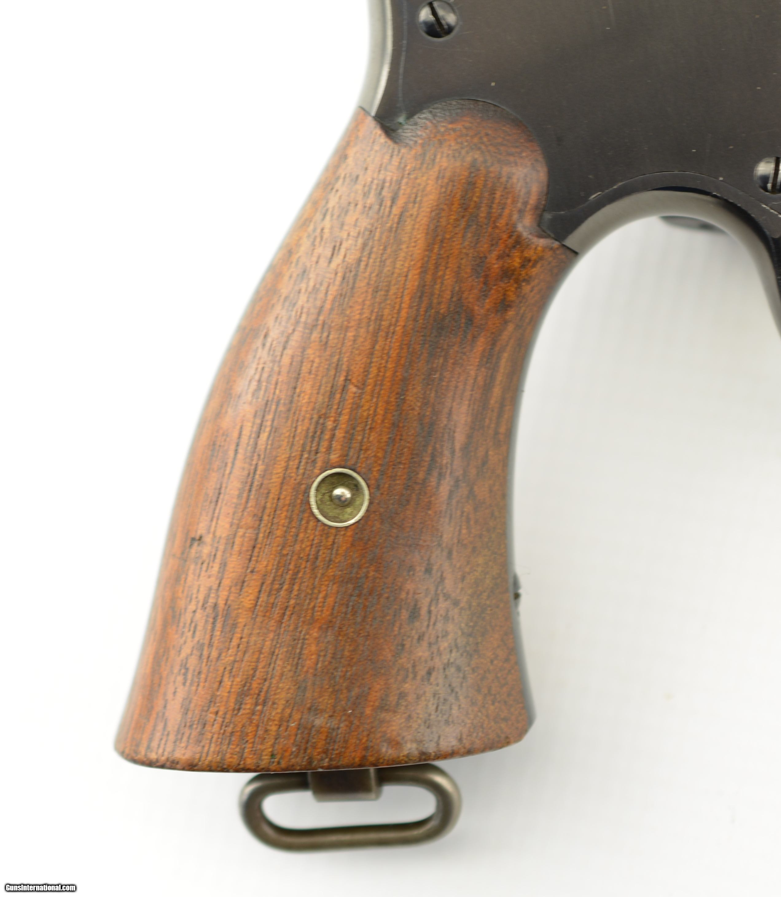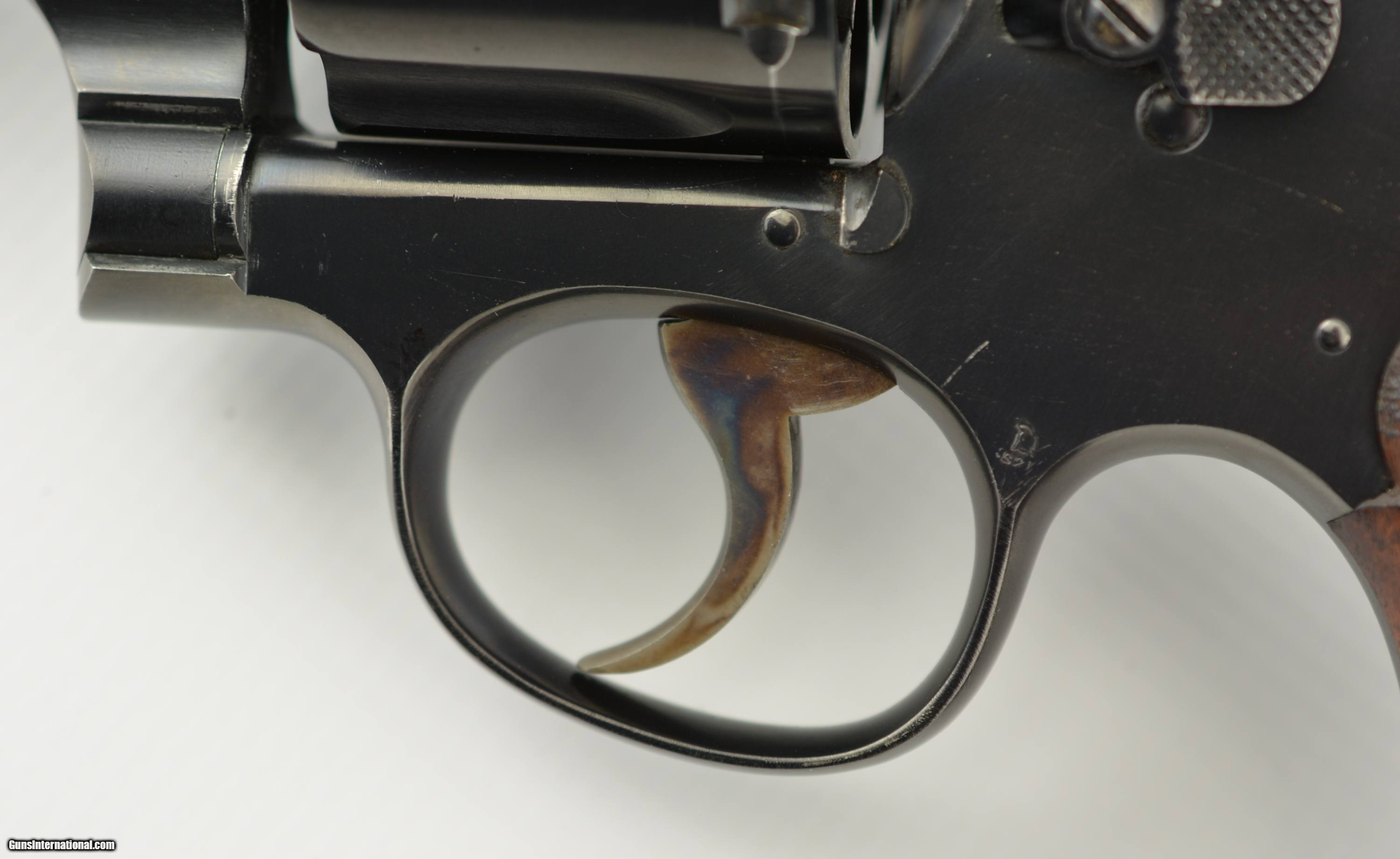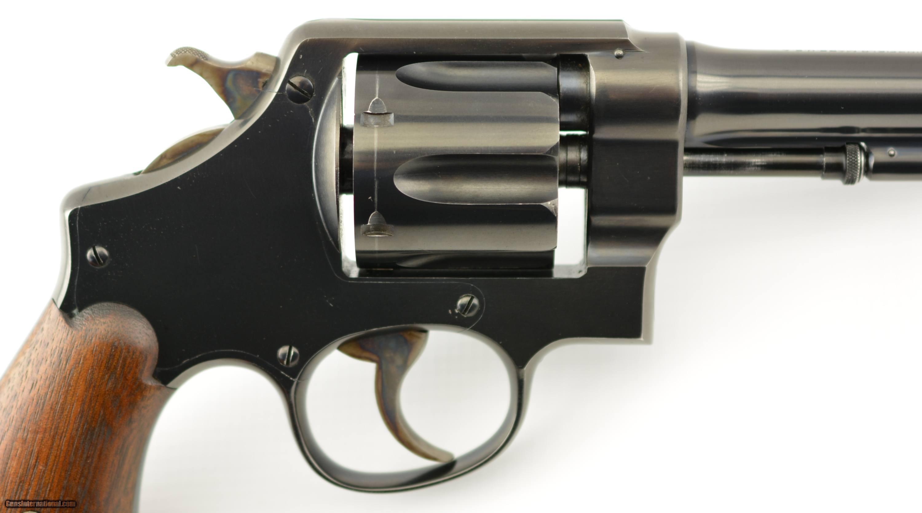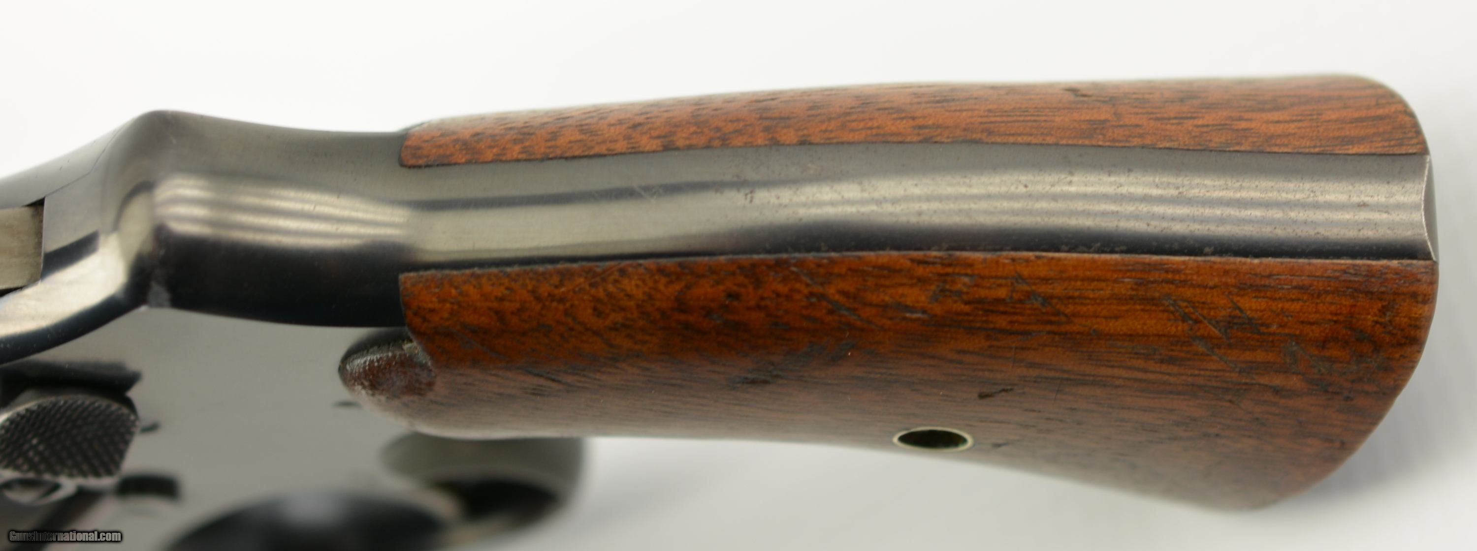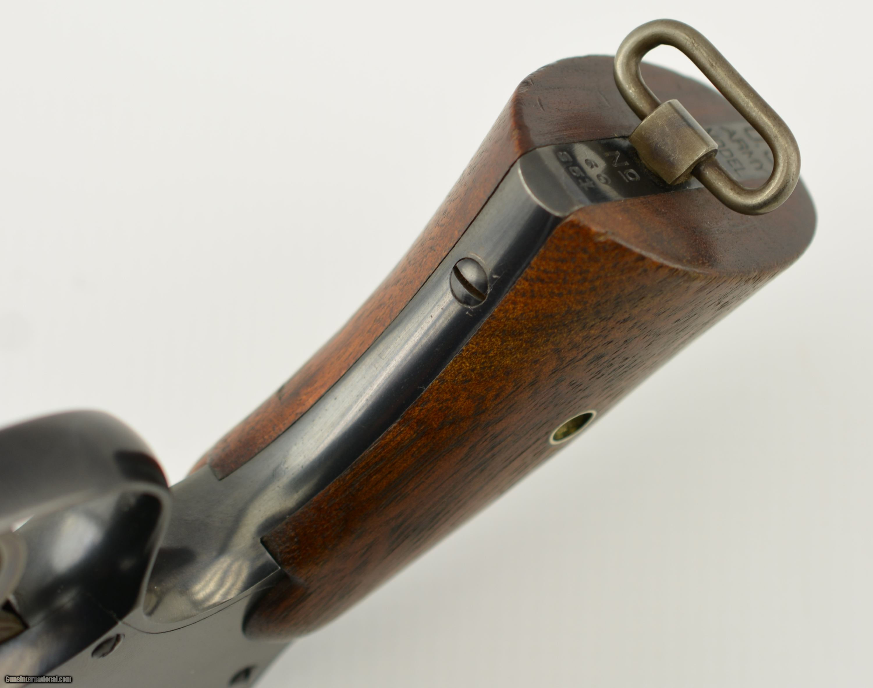 Description: Serial #60851, .45 ACP/Auto Rim, 5 1/2" barrel with an excellent, bright bore. This revolver has matching numbers on the frame, barrel, cylinder, yoke, and ejector, with the metal retaining 98-99% of the original blue finish. There is a mild turn-ring on the cylinder and very minor imperfections, but these are negligible. The hammer, trigger, and lanyard swivel likewise retain nearly all of their original color case-hardening. The smooth walnut grips are numbered to the gun, and have scattered small handling marks and minor surface blemishes in the original oil finish on both sides. The lock-up rock-solid, and the action functions flawlessly. The revolver is accompanied by a 2017 dated S&W factory letter that lists a shipping date of June 12th, 1918 to Springfield Armory. This is an exceptional, almost unused example of a Smith & Wesson Model 1917, and would be very difficult to upgrade from. FFL or C&R SOLD Curio/Relic: Yes Manufacturer: S&W Model: 1917 Serial Number: 60851 Caliber Info: .45ACP Gauge Info: .45ACP |