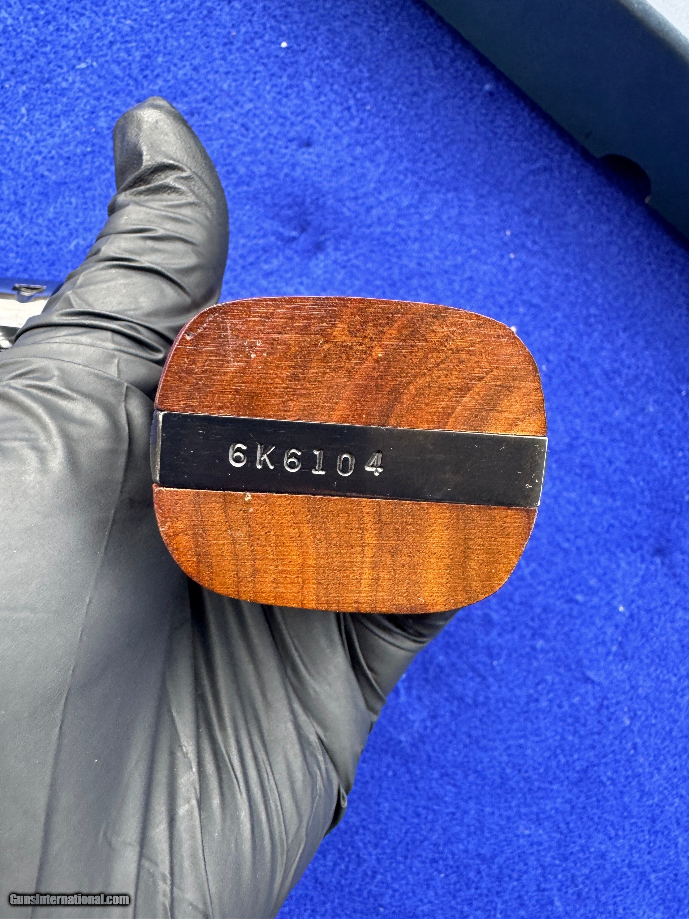 Description: 1974 Smith & Wesson model 48-2 (K-22 MRF masterpiece). Chambered in .22 WMR (magnum) and features a rare 8 3/8" barrel. The front sight is a Patridge and the rear is a micrometer adjustable. Hi Polish Blue Finish is exceptional. Smith Logo Checkered Walnut Stocks are excellent condition and numbered to the gun. The barrel is pinned and the cylinders are recessed. A trait long since forgone by S&W. Color cased target trigger and target hammer. Comes as shown with the factory matching two-piece Blue Box, new old stock tools and paperwork. Including the original purchase hang tag and box sticker from the old "Montgomery Ward" Dept Store. It cost $158.00 back in 1974. Bluing rates at 98% with just a touch of muzzle wear from being in a holster at some point I imagine? A really excellent package for the Smith Collector and shooting enthusiast! I accept Post Office Money Orders, Personal Check, Zelle and credit card as payment. All Credit Cards incur a 2.99% fee which is in addition to the final price as shown in the Order. Please allow me to give you a complete total. All Credit Cards will need to be done over the phone. Thank You. Insurance is not included in shipping. Please allow me to add that to the total at your request at a rate of 2% per every $100. Thank you for looking. Please let me know any questions. Many more pictures available. Curio/Relic: Yes Handgun Caliber: .22 WMR (.22 Magnum) Manufacturer: Smith & Wesson, S&W Model: 48-2, K-22 MRF MasterPiece Serial Number: 6K6104 Barrel Length: 8 3/8 Condition: Excellent Metal Condition: 98% Wood Condition: 99% Bore Condition: 9 out of 10 Action: Double Triggers: Target Stock: Target Finish: Hi Polish Blue Sights: Rear Adj. Manufacture Date: 1974 Extras: Original hang tag Case: Original Factory Box with Matching Label Price: $1,395.00 Shipping: $45.00 Buy Now Contact Seller |