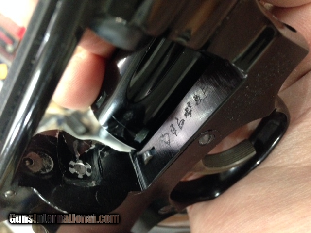 Description: REDUCED - An excellent condition Lightweight S&W Kit Gun, Model 43 in .22lr caliber. Revolver shows some use but has no appreciable blue wear. Timing is great. Someone added an electropenciled number (see photos) that is not visible in normal circumstances, so we have greatly reduced the price. Revolver is complete with the original box, label, and S&W cleaning kit. SOLD |