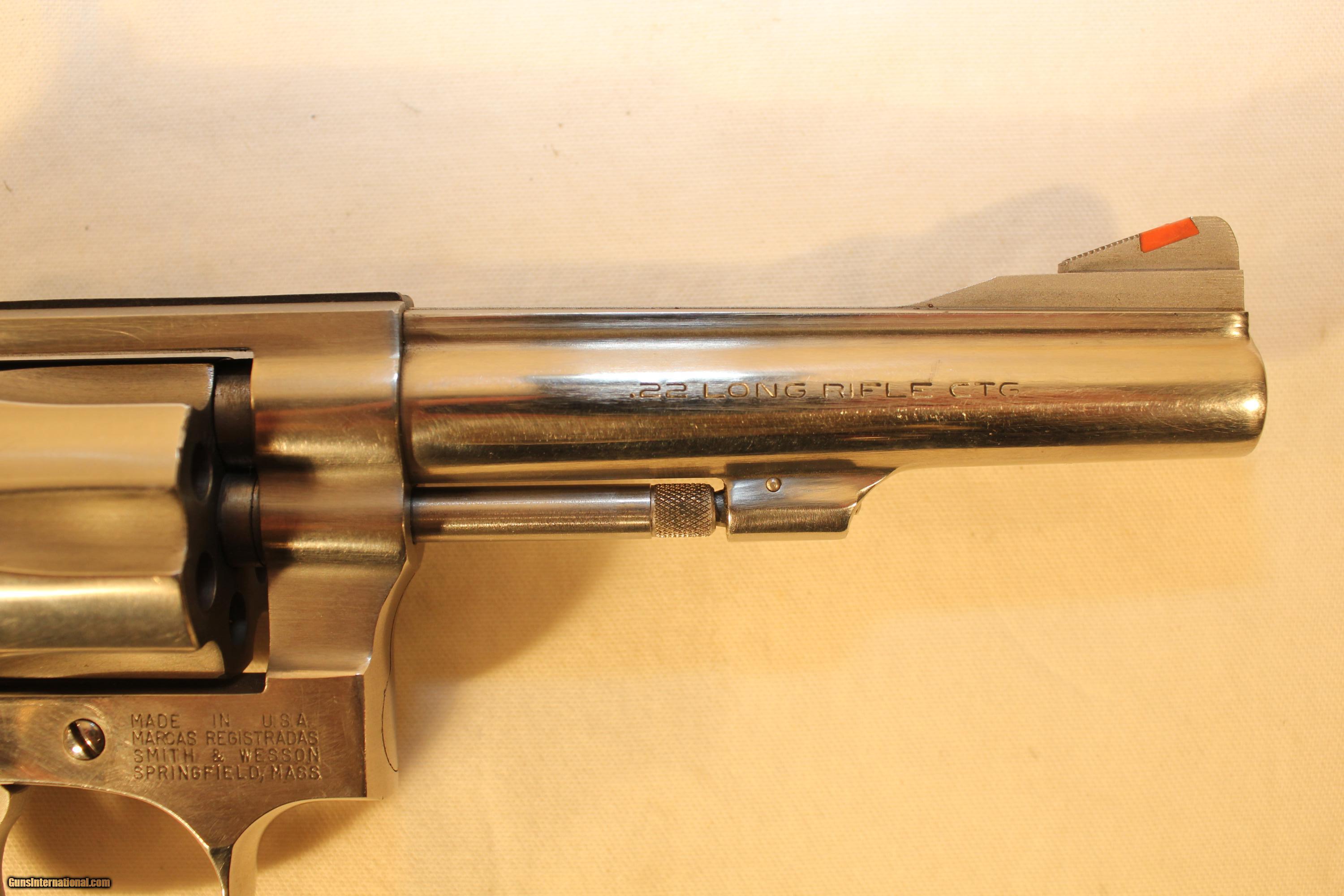 Description: S&W Model 63 no dash 22 rf revolver with 4 inch barrel. This is the old 22/32 Kit Gun. Made on a J frame. Stainless steel, red inset front sight. SOLD |
