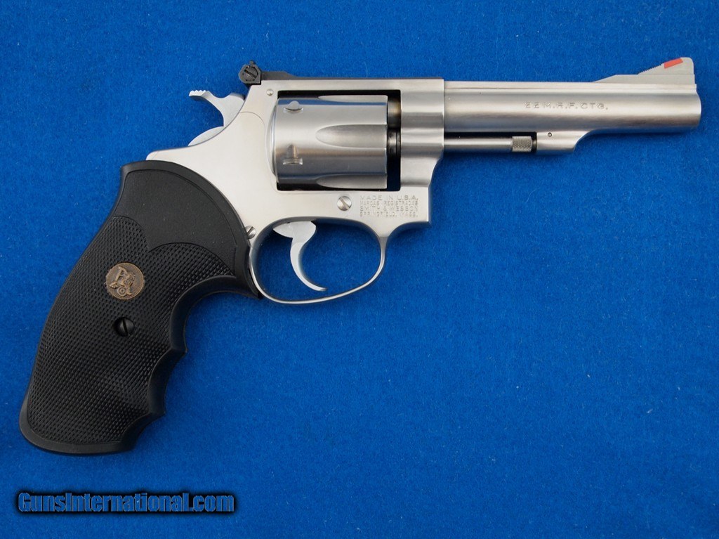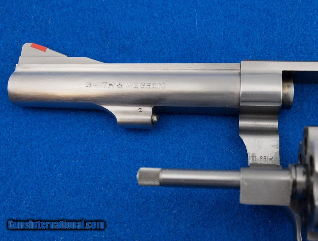 Description: S&W 651-1 .22 MRF WBox, 4 " bbl, bright shiny bore, good rifling, Stainless Steel finish, adjustable notch rear sight, ramp front sight, and very nice Pachmayr Gripper grips.. Add 3% for Credit Card Shipping $25.00 SOLD |