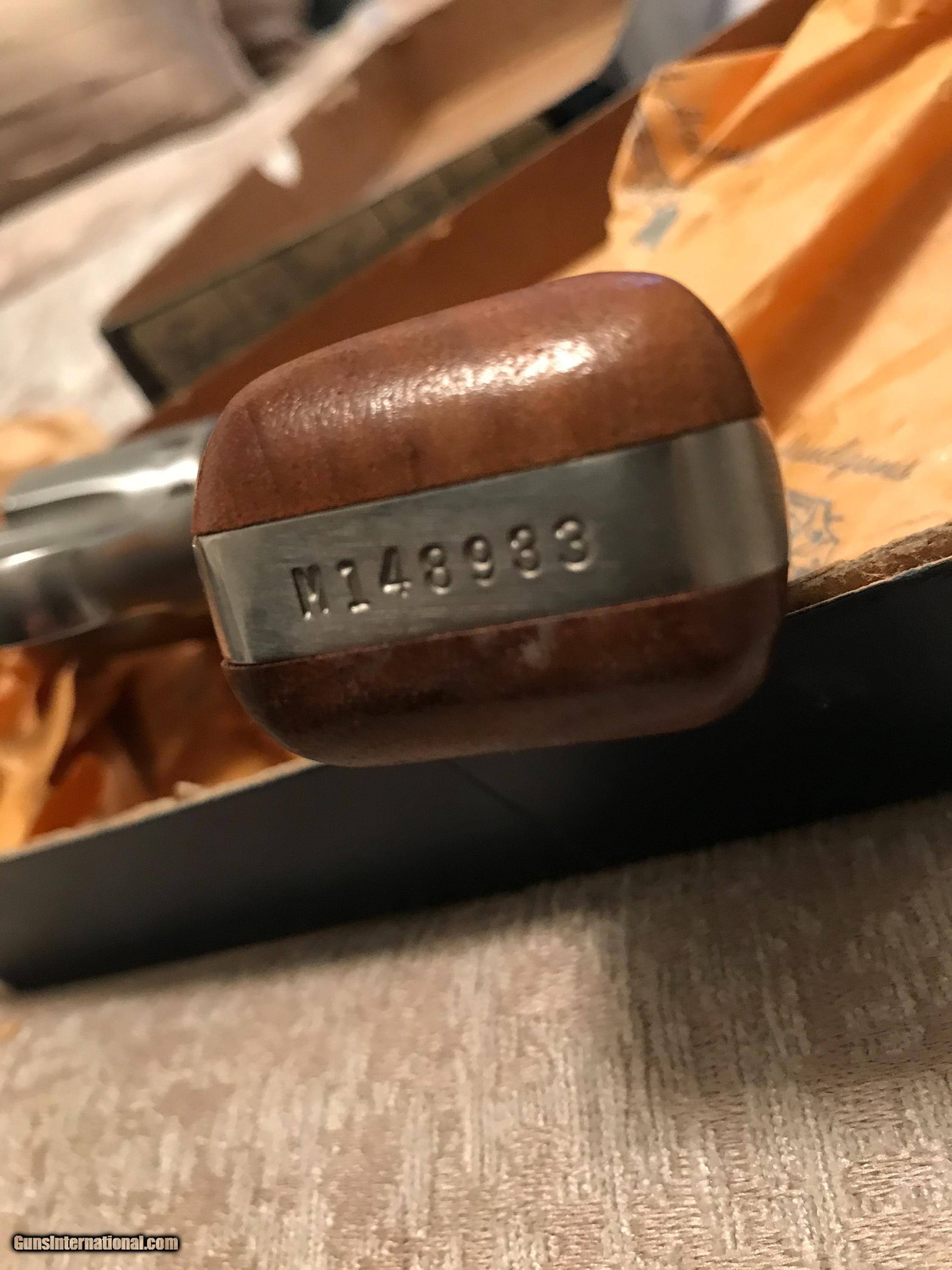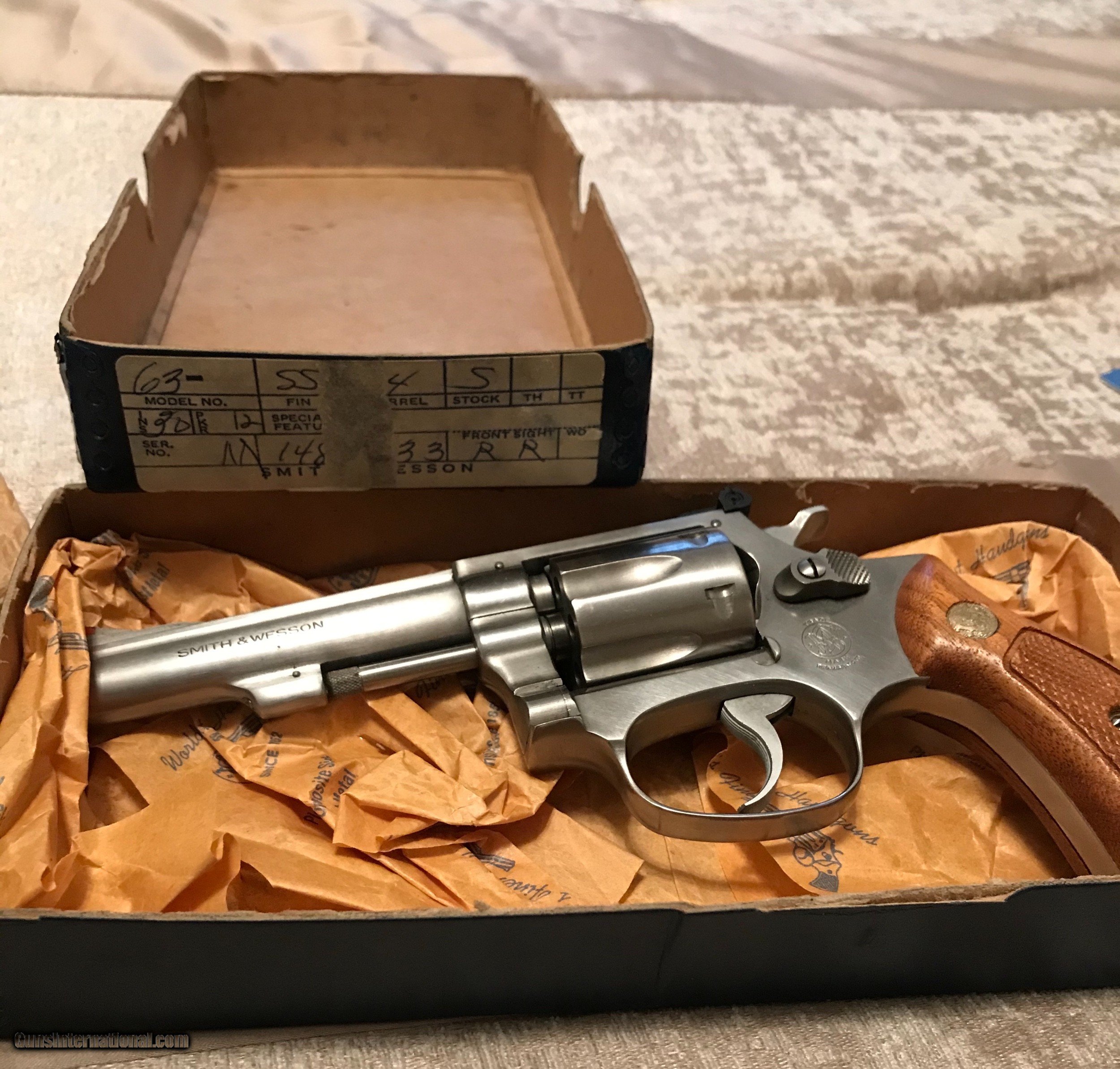Description: I love this little kit guns. This 63 is a no dash. 4 inch barrel. Stainless. Target sights. Original wood handles, tools, box, and papers. Just a gorgeous piece with a nearly invisible turn line. Please email with questions. Shipping included. Cards add 3% SOLD Manufacturer: Smith and Wesson Model: 63 Barrel Length: 4 Caliber Info: 22 LR Condition: excellent Metal Condition: excellent Wood Condition: excellent Bore Condition: excellent Action: double Finish: stainless Sights: target Manufacture Date: 1980 |
