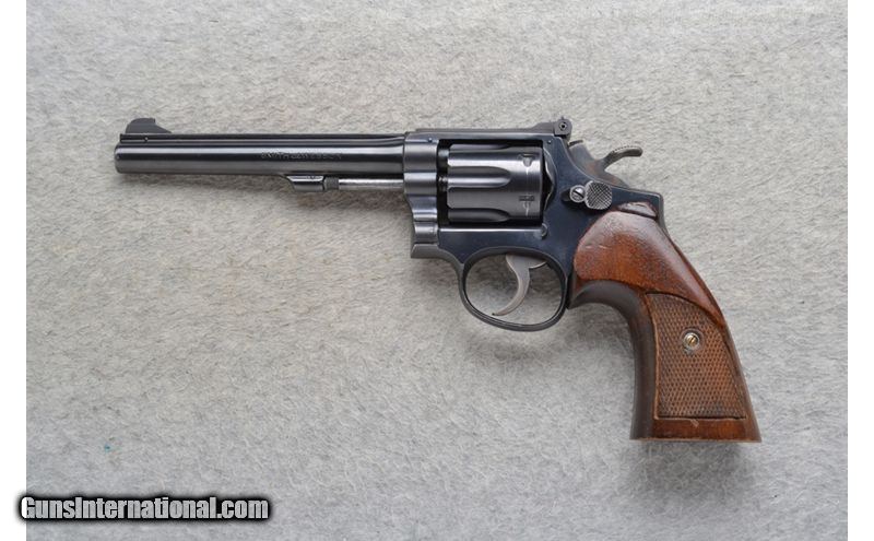 Description: This Smith & Wesson Double Action model is a 6 shot revolver in .22 Long Rifle Cal. It has a 6 inch barrel. A raised blade front and adjustable notch rear sight. The grip is a diamond checkered walnut. The back strap is serrated. It has a grooved trigger and a checkered target hammer spur. .22 Long Rifle SOLD Chambers: 6 shot fluted cylinder. Metal Condition: Very good. A little blue wear at the bore. Wood Condition: Good. light handling marks. Bore Condition: Excellent. Barrels: 6 inch top rib barrel. Triggers: Single Action / Double Action. Grooved. Weight: 38 oz. Sights: Raised blade front. Adjustable notch rear. Item Location: Richfield, WI |