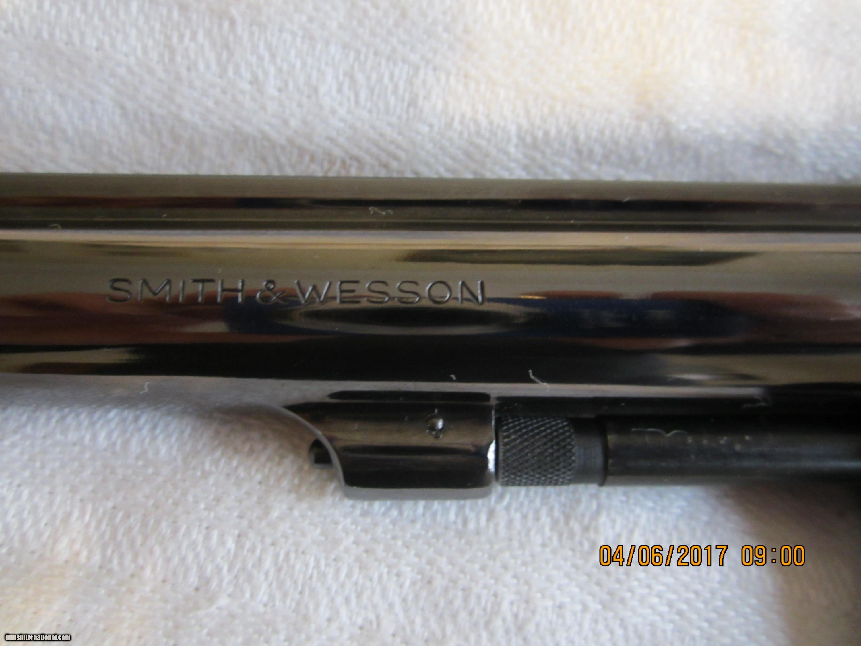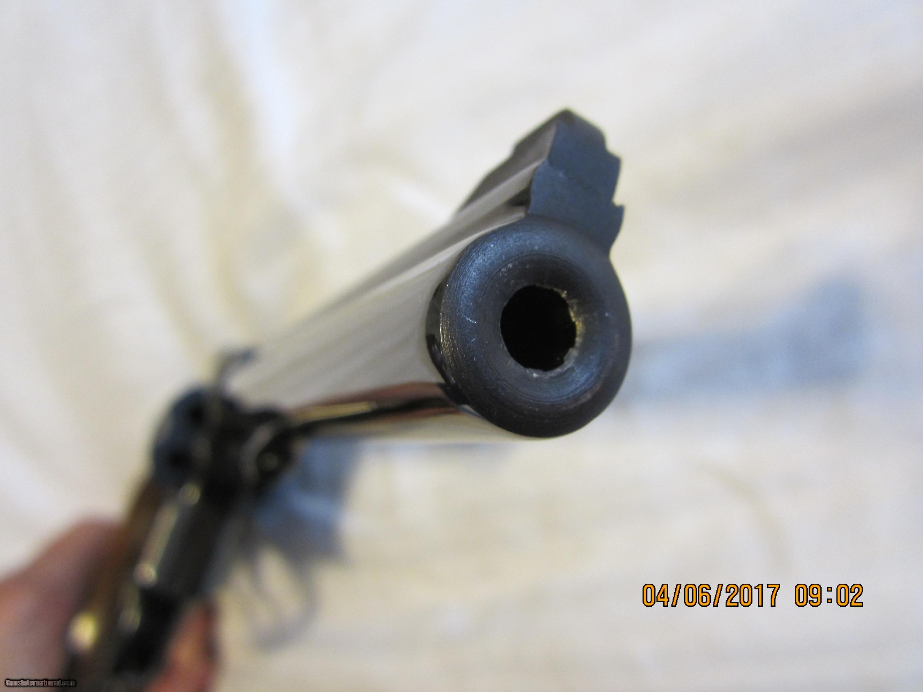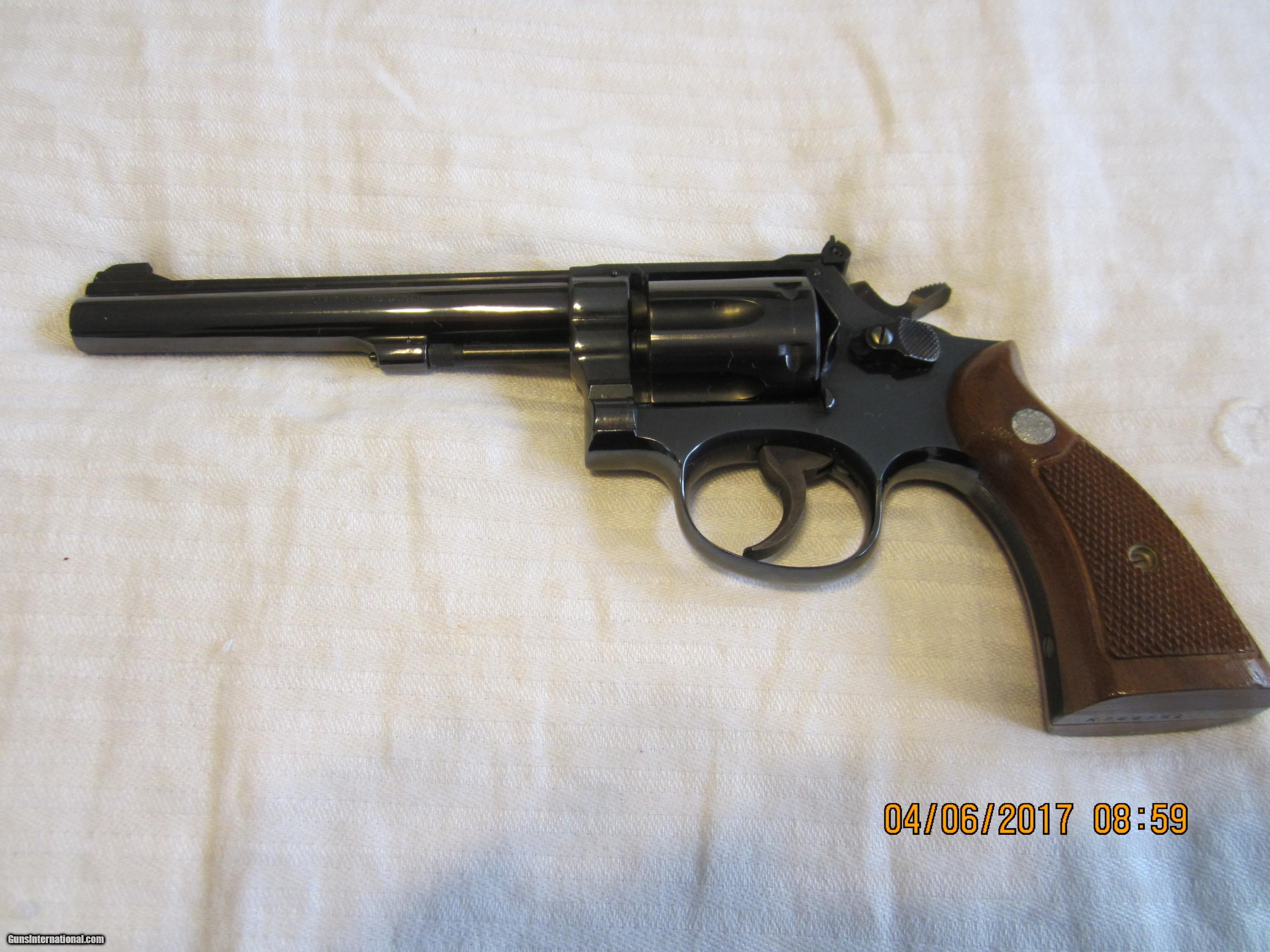 Description: This is indeed a beauty. Condition is pretty much as it was when it left the factory many years ago. Unfired with a very, very faint drag line on the cylinder.Case colors on the target double action trigger and hammer. The bore is of course bright and the rifling sharp. I have the original box, numbered to the pistol and the factory instruction sheet. They, like the weapon are in 99%+ condition. There is a partridge front sight and an adjustable rear sight. The barrel top is ribbed for a nice sight line.. It has a high polish blued finish and the checkered walnut grips both have the S & W medallions inserted It holds 6 rounds.. There can't be a better one for sale, and I doubt there is a comporable one available. Price includes a factory instruction sheet and the original numbered BOX. PRICE REDUCED ! Transfers must go through an FFL holder. SOLD Manufacturer: Smith & Wesson Springfield, Mass. USA Model: Model 17-2 K 22 Masterpiece Serial Number: K788551 Caliber Info: .22 cal. Bore: bright Condition: MINT 99+% Metal Condition: Mint 99+% Wood Condition: Mint 99+% Bore Condition: Bright & sharp Barrels: one Barrel Type: round Rifled Action: Revolver Triggers: one-target type Stock: Checkered Walnut grips Finish: Blued Sights: front & rear Manufacture Date: 1946-1957 Engraving: none Extras: Box & Instruction sheet Item Location: California |