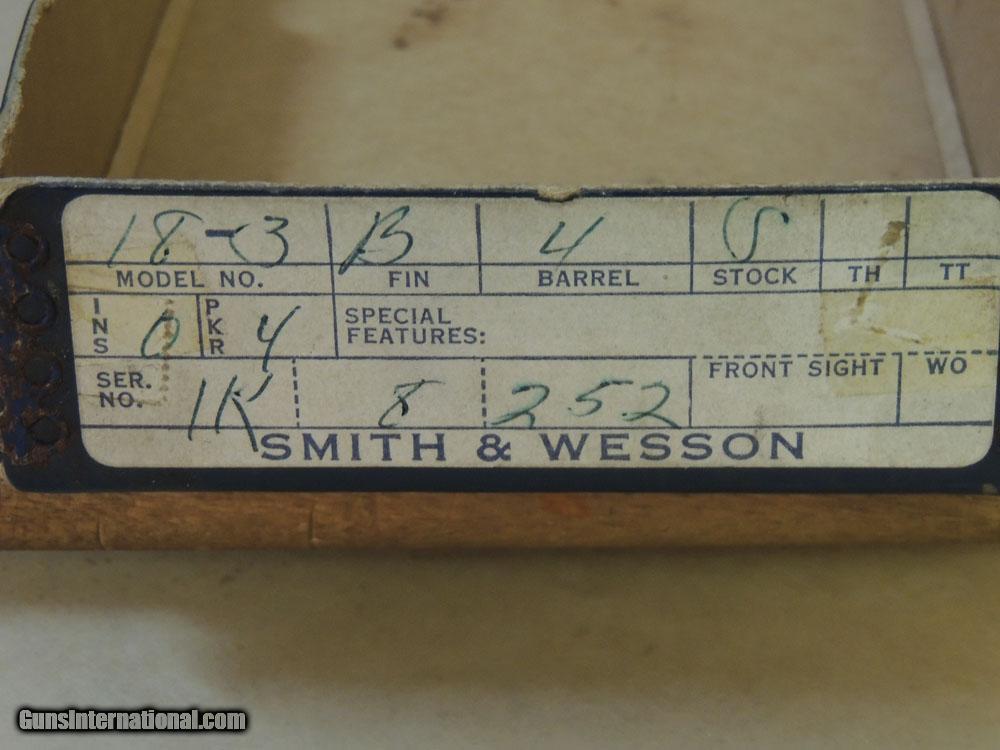 Description: SMITH & WESSON MODEL 18-3 .22LR REVOLVER IN BOX, 4" BARREL, MINT BORE, TIMING AND LOCK UP CORRECT, 99% BLUE, WALNUT SERVICE GRIPS EXCELLENT, IN THE BOX WITH EXTRAS AS SHOWN $1000 ******* (PLEASE REFERENCE OUR INVENTORY NUMBER) (PAYMENT OPTIONS) (Postal Money Order) (Cashiers Checks) (Personal Checks (Item held until Check Cleared) (Layaway 120 days same as cash - Deposit required- Our Terms and Conditions Apply) (Credit Cards Visa or Master Card 4% fee added to total sale) (GA residents 7% sales Tax Applies) (FAX 888-597-1394) (BEST PHONE/TEXT 229-424-8450) (Shipping $35.00) SOLD |