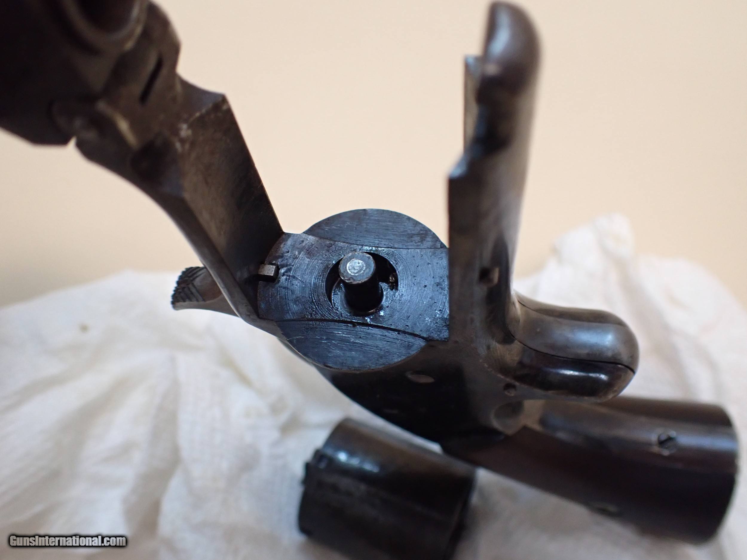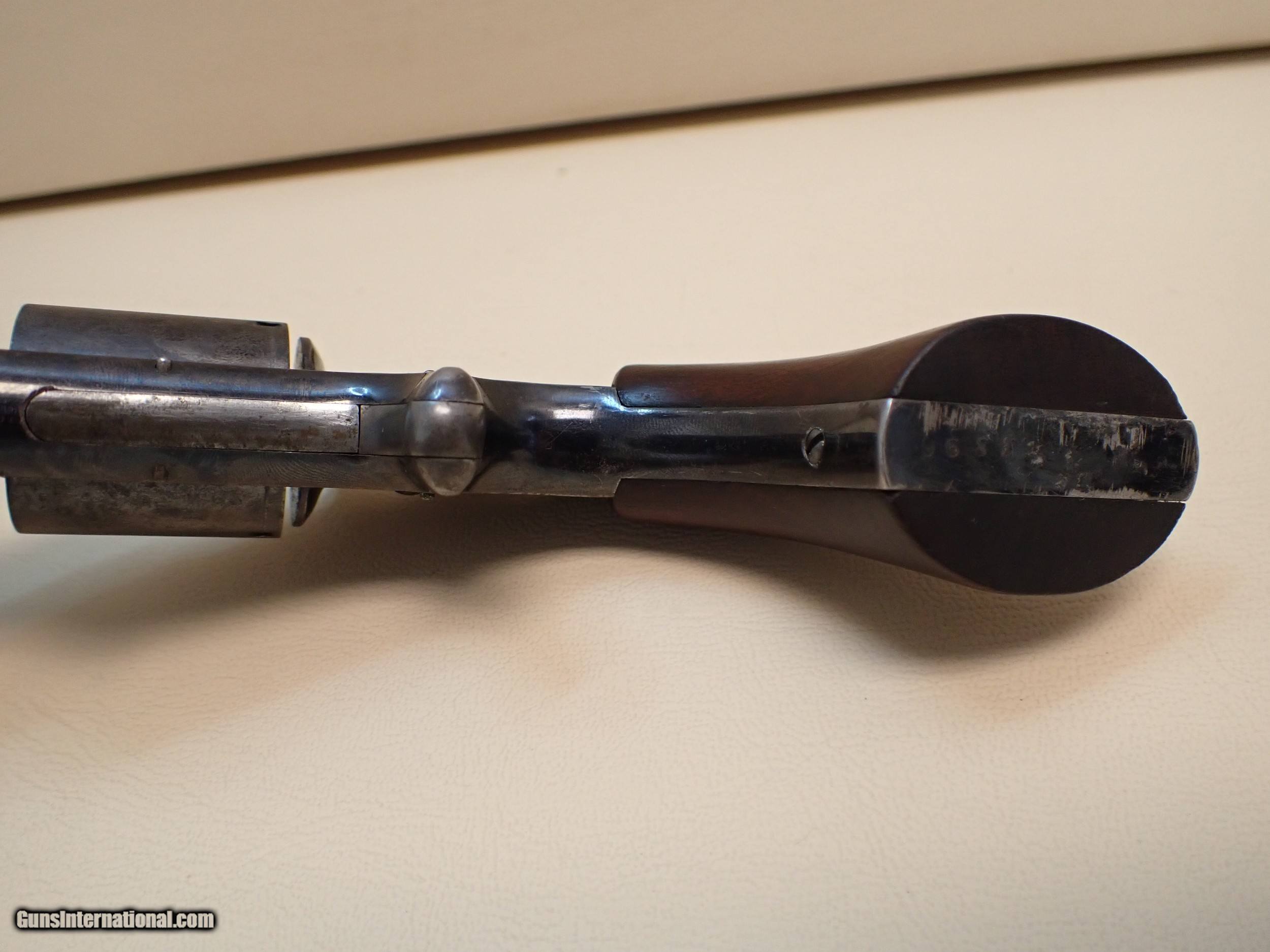 Description: ***SOLD*** Smith & Wesson Model One-And-A-Half .32 Rimfire revolver, First Issue, dated to 1865-68. This pistol features a 5 shot non-fluted cylinder, ribbed octagonal barrel, and a rich blued steel frame with rosewood grips. The finish appears genuine and original, as do the grips. The pistol is in great working order, with solid timing and good lockup, and a solid, fully operable trigger. The pistol has some wear in the corner of the blued finish, with other small blemishes in areas shown in the photos. The bore has some minor wear and small pits, however the chambers are in great shape. The barrel hinge is just a bit loose, which is comon with these old revolvers. This is a stunning example of a rare S&W Model 1 1/2 first issue, in spectacular condition for it's age. Please refer to the photos to further assess the condition of the pistol. This pistol is an antique, no FFL required. Shipping $25.00 / USPS SOLD Antique: Yes Rifle Caliber: .32 Remington Manufacturer: S&W Model: Model 1 1/2 Serial Number: 5396 |