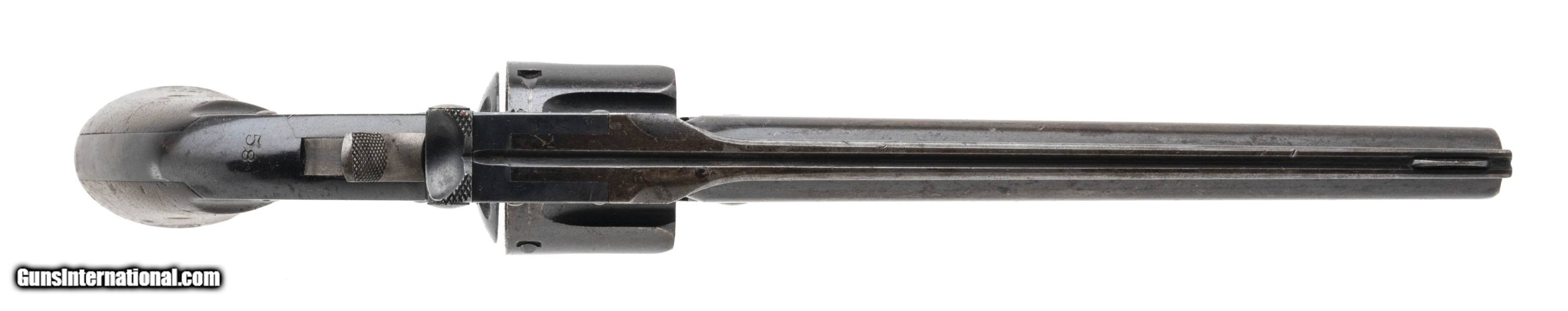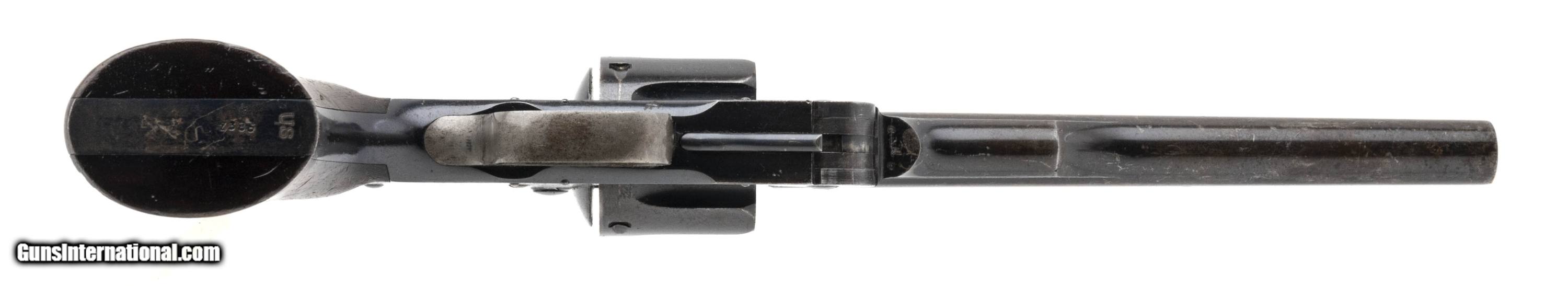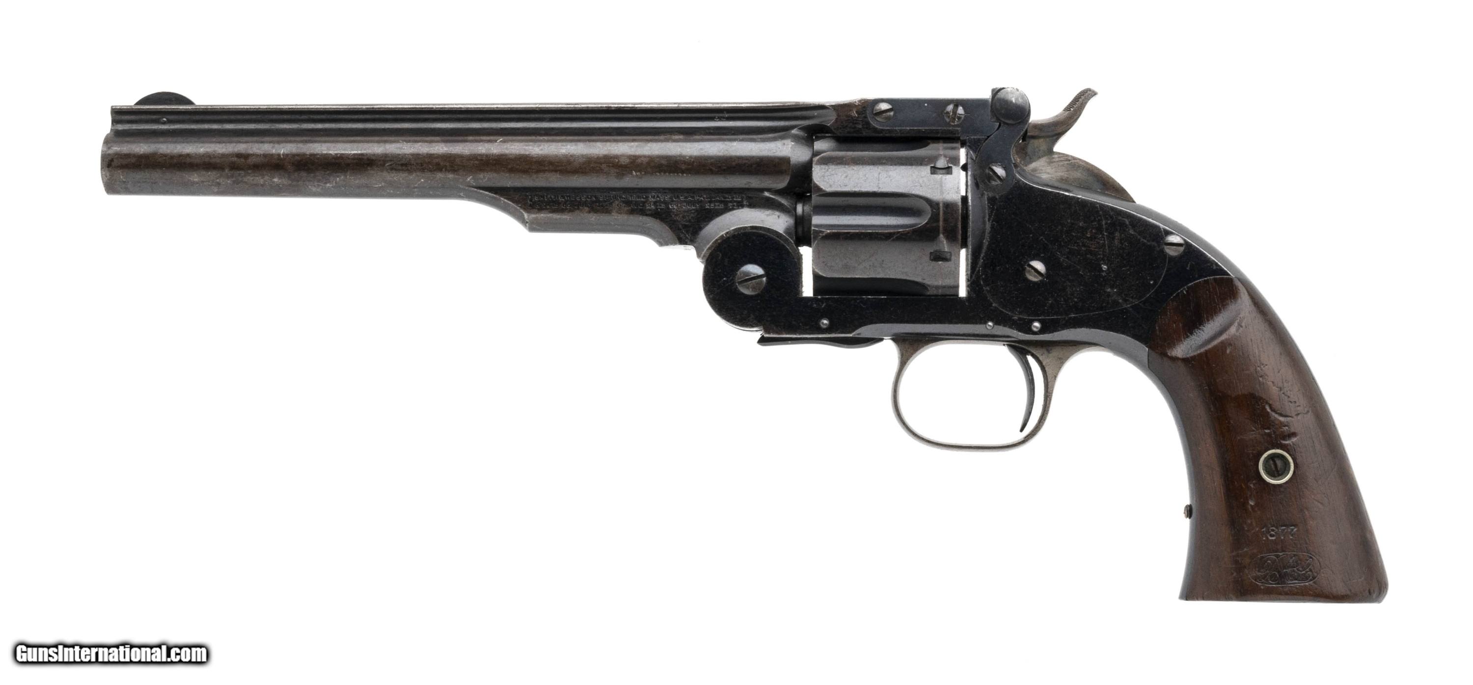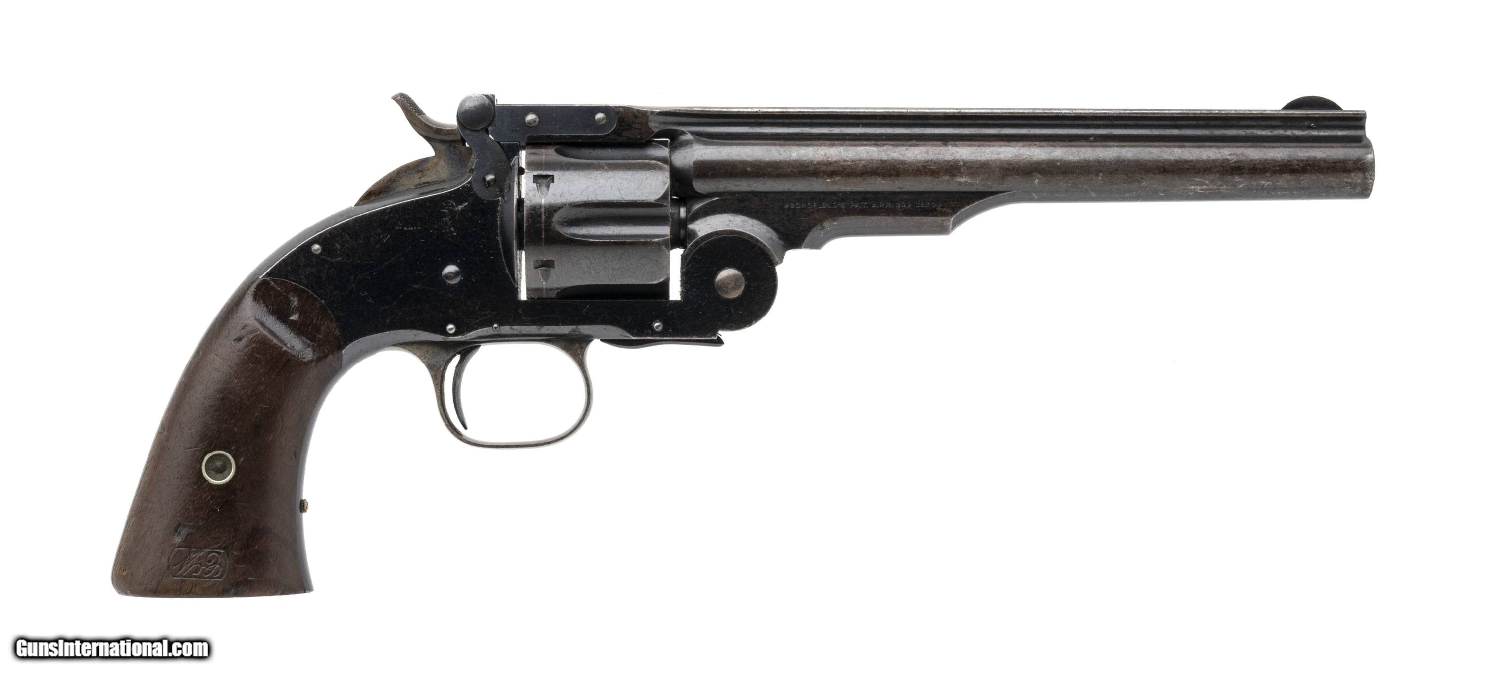 Description: "Serial number 7385. Made in 1877. 45 Schofield caliber with a 7" barrel. This gun is in fine condition with approximately 60% of the original blue. Most of the bluing loss is on the barrel. The frame has closer to 90% of the original blue. The grips are very fine with nice sharp cartouches. The left hand side cartouche is dated 1877, Barrel is non matching. Hammer has very fine case colors. SOLD Antique: Yes |