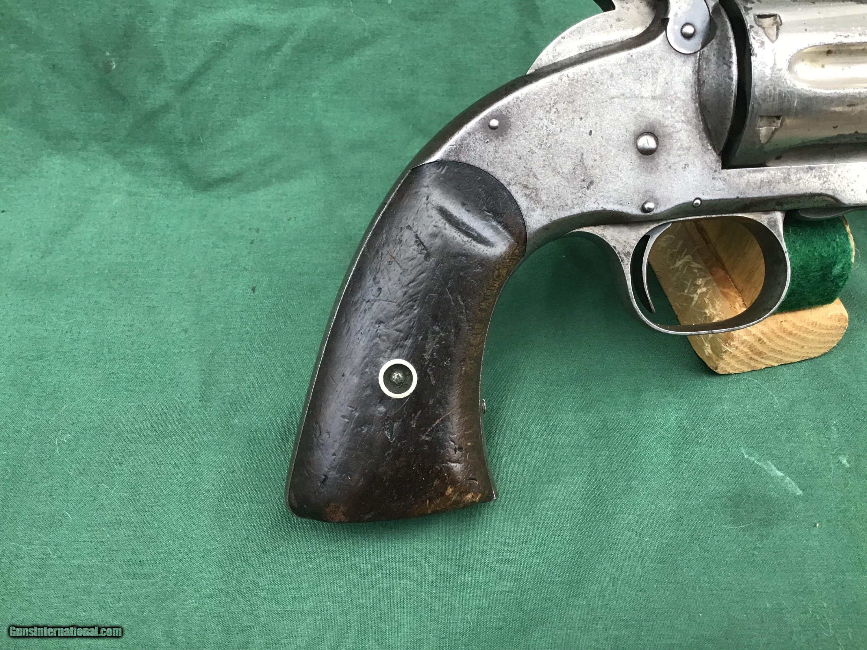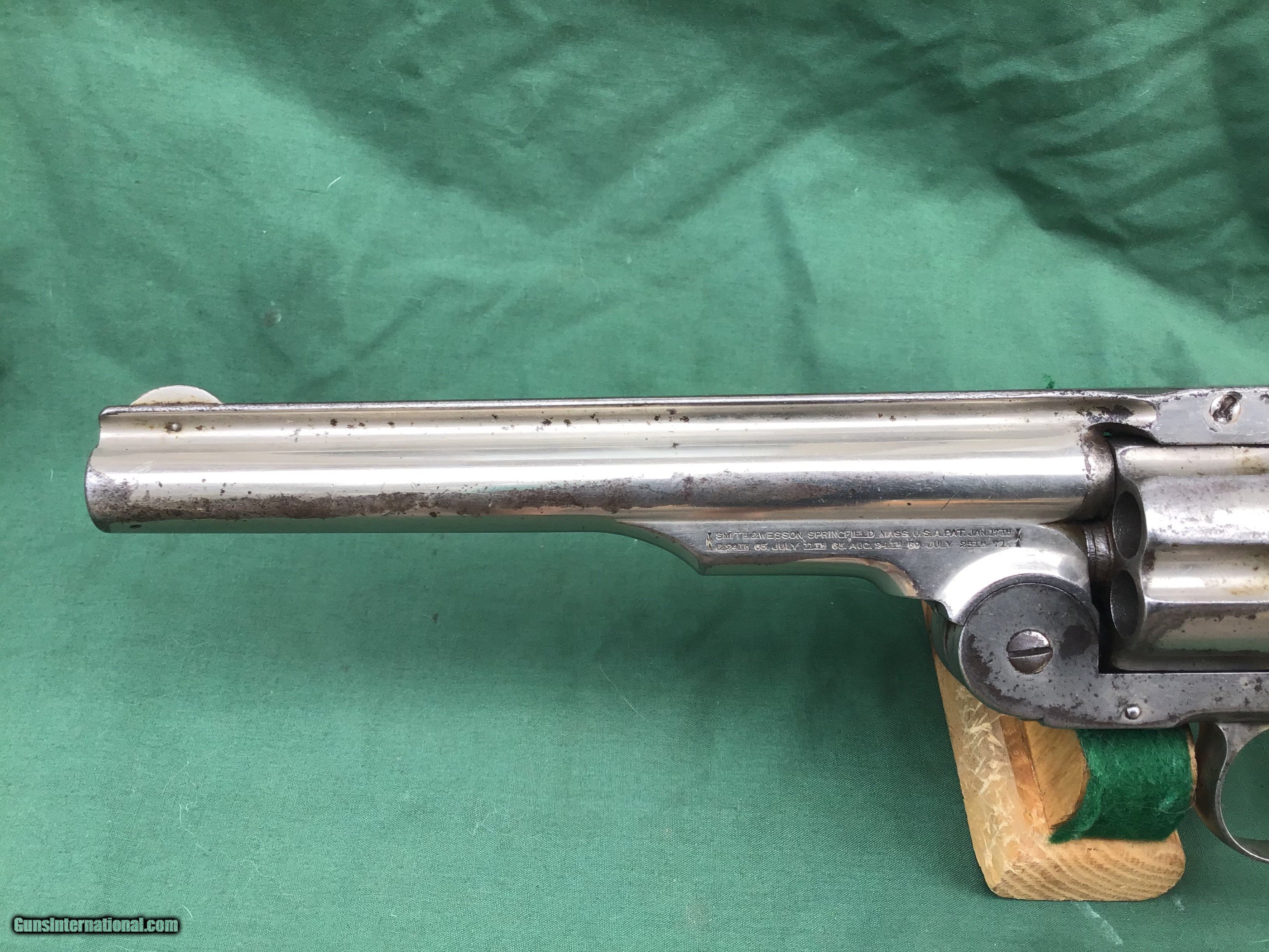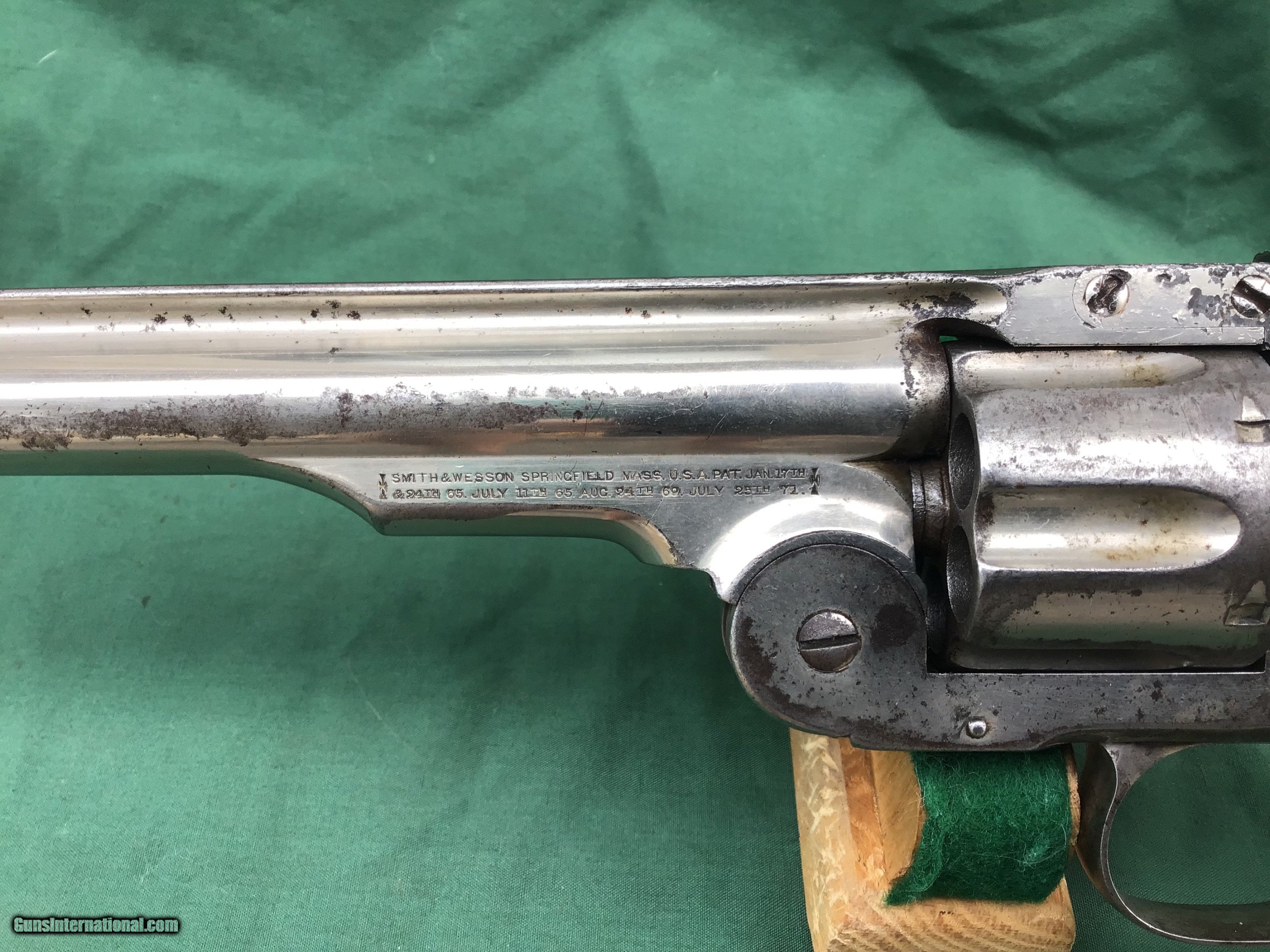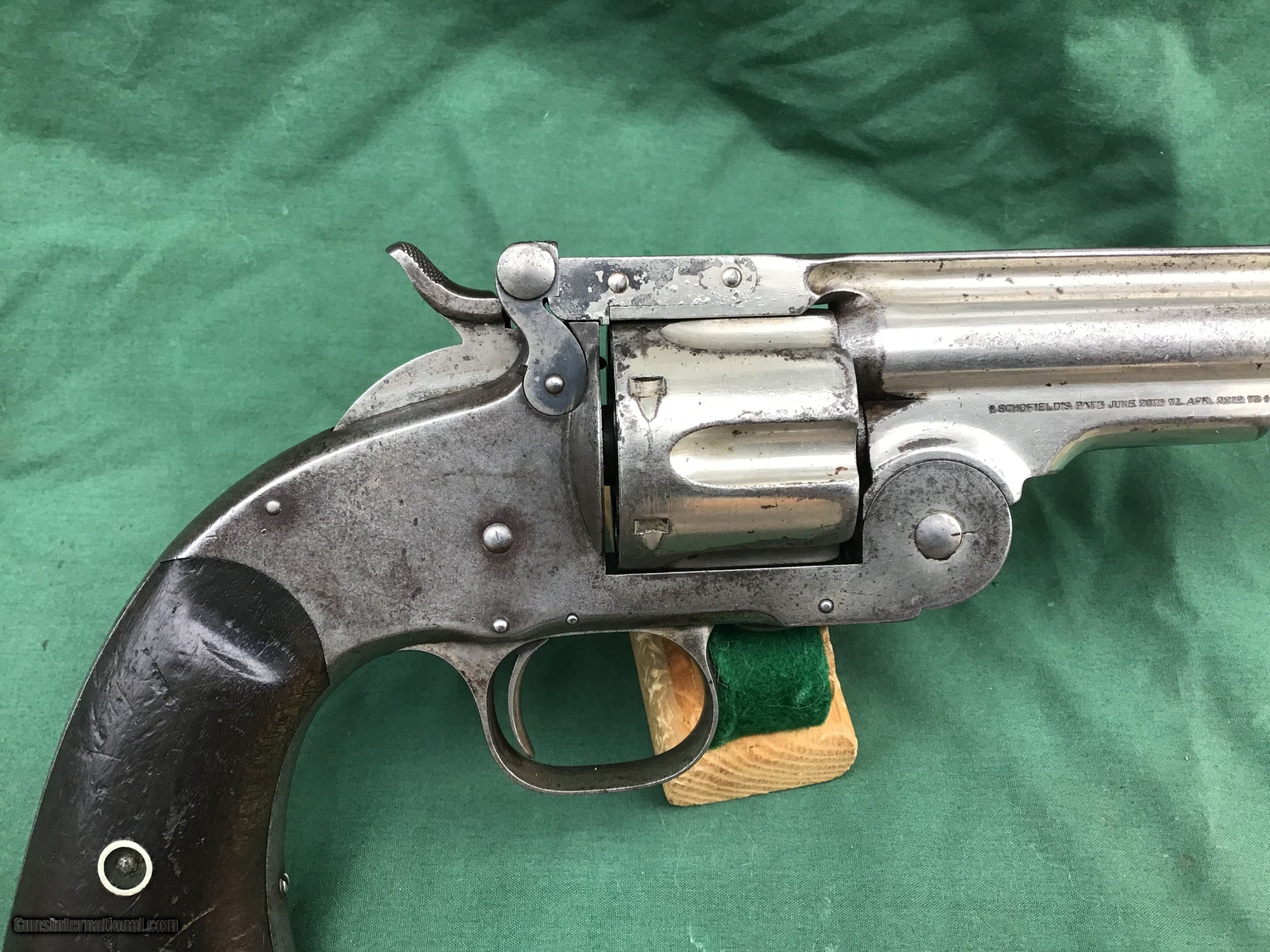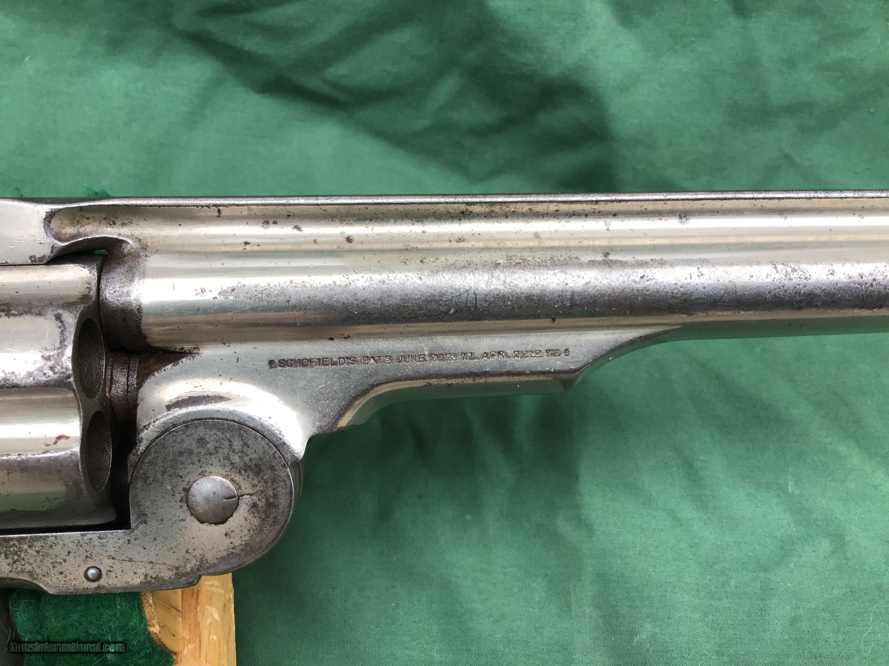 Description: Smith &Wesson 2nd Model Schofield Revolver. Very rare Civilian purchased Smith & Wesson. Serial number 7275 and is all matching. Revolver functions as it should with good lock up. Indexes nicely. Grips show usage. Left grip is cracked in 3 places (see pics), right grip has matching serial number as well. 7" inch barrel with great markings. About 45% of the nickel plating remains. Bore is good. Civilian Schofield's don't come up for sale often, so don't miss an opportunity to get yours. Please feel free to ask questions. SOLD Antique: Yes |