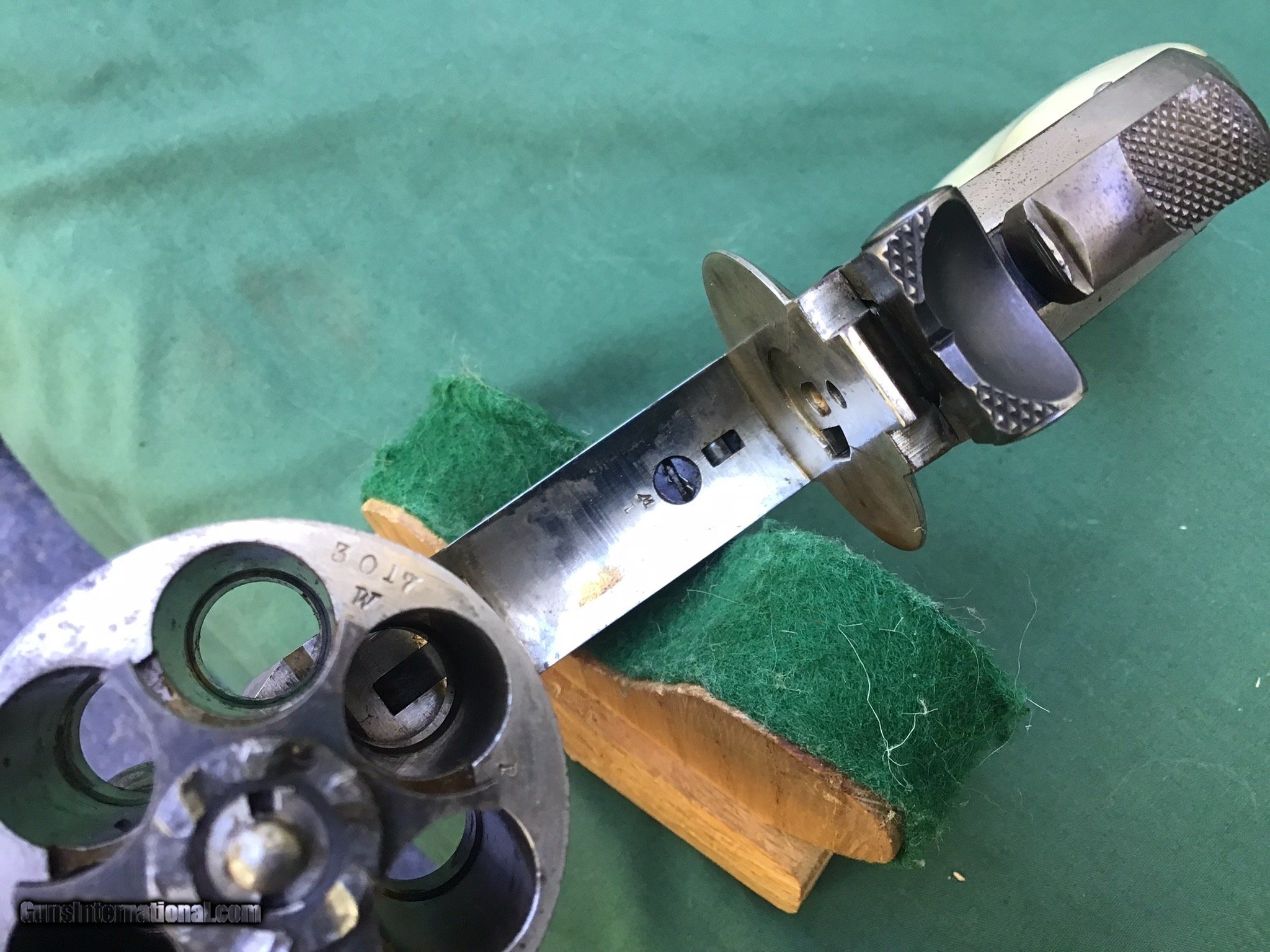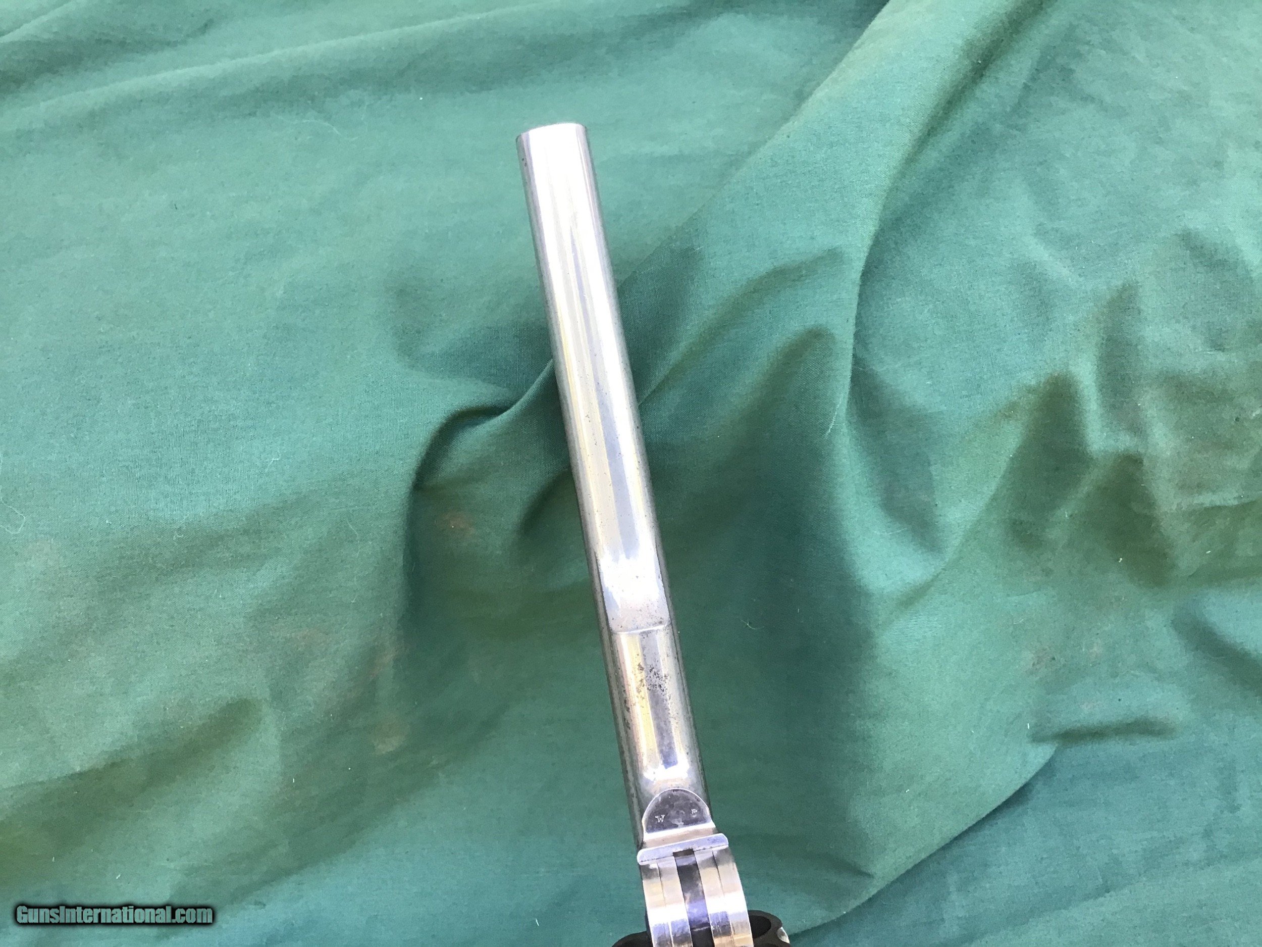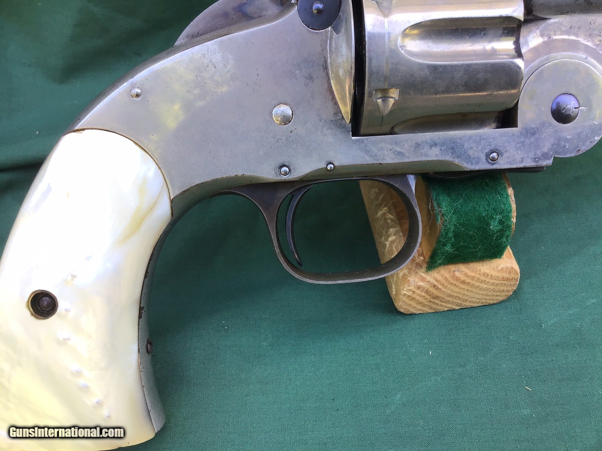 Description: Sold Smith & Wesson 2nd Model Schofield serial number 3017 all matching, .45 S&W, 7 inch barrel with a very nice bore. This is a very handsome revolver that retains 70-75% of it's nickel finish, with the majority of the loss occurring along the sides of the barrel and around the front of the cylinder. Some small spots of freckling are mingling with the pewter gray / brown patina, and the hammer and trigger guard have retained a good majority of the original color case-hardening. The original walnut grips are long gone but a nice set of Pearl are present. The US stamp / serial number on the butt is crisp and clear. The lock-up is rock-solid, and the action functions flawlessly. There is still evidence of fire blued screws and external parts. This is a very good example of a truly desirable S&W that was upgraded after the war by either Bannermans or Hartley and Graham. Antique and can ship directly to your doorsteps. Please feel free to ask questions. SOLD Antique: Yes |