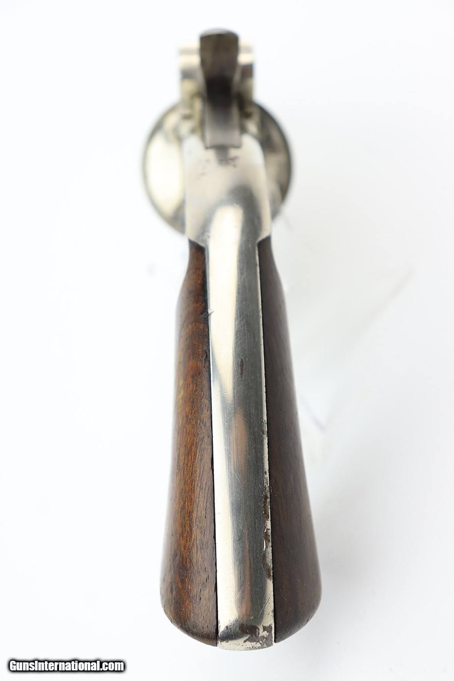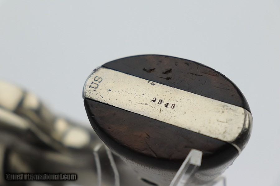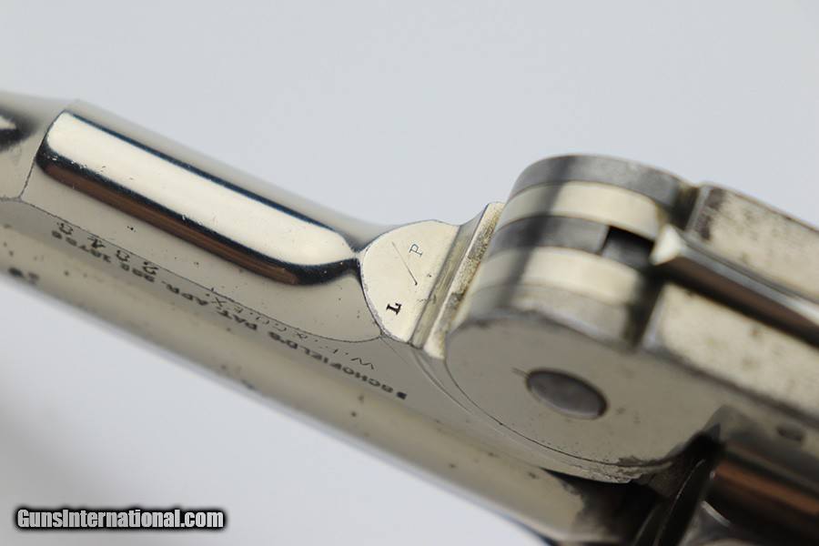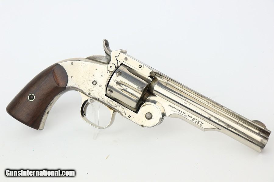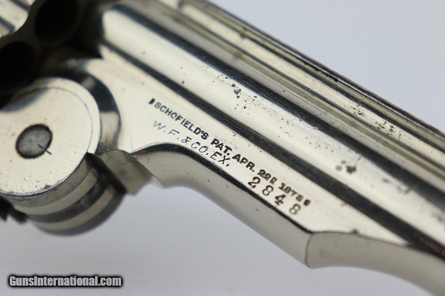 Description: This is a very rare and very desirable early Smith and Wesson - Schofield Model Revolver. These were made for the US Army - mostly for cavalry soldiers in the Western Frontier and California. During the 1880s, the US military began divesting themselves of both 1st & 2nd Model Schofield revolvers. The guns were primarily sold to retailers in N.Y. Many of these guns were subsequently altered by having their 7” barrels cut down to 5”, and often the guns were nickel-plated. The single largest customer for these altered Schofield revolvers was the Wells Fargo Express Company, who marked the guns W.F. & CO. EX. when they purchased them. This gun is one of those reworked and nickeled guns. It is US marked on the bottom of the frame, and you can see a little bit of the military cartouche on the left grip. The grips are original to the gun as the right panel is numbered to the gun. There is an L/P inspector proof under the barrel and on the cylinder. It is also then marked W.F. & Co. Ex. on the right side of the frame. It comes in 45 caliber and is considered an antique so no FFL is required. The action and timing seem to work well. The nickel finish is mostly intact, but you will see a few areas where the nickel has worn or flaked away. Many of the screws still have the fire blue finish. For an antique gun, this one has a remarkable bore; still shiny with just a hint of corrosion. Overall, it would be hard to find a better example. SOLD Antique: Yes Handgun Caliber: .45 Schofield (.45 S&W Schofield, .45 S&W) |