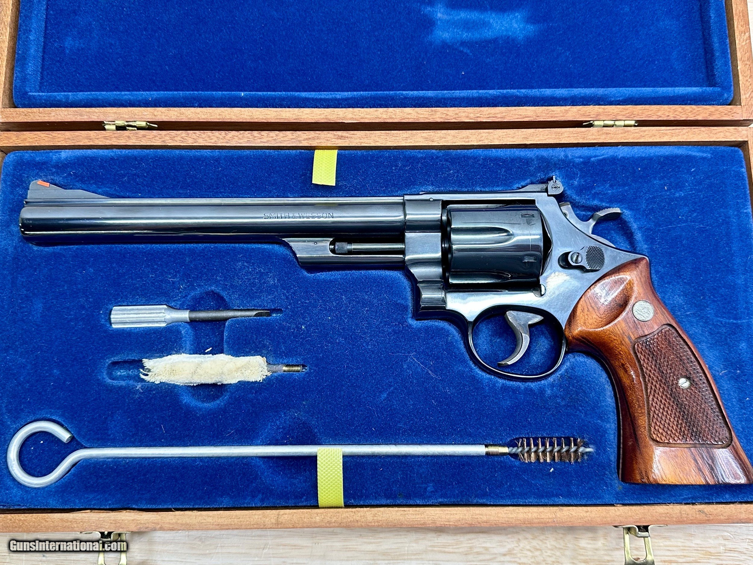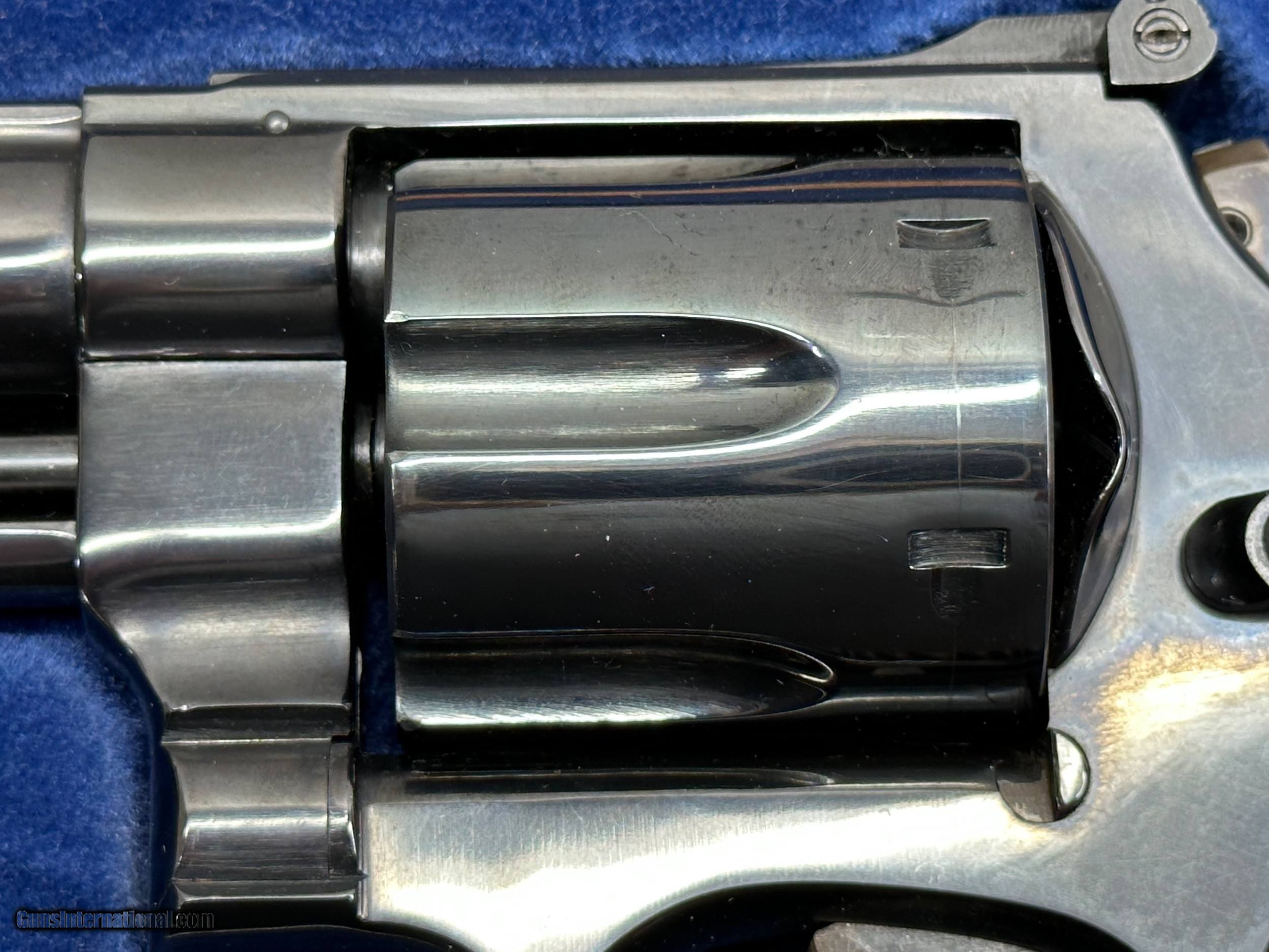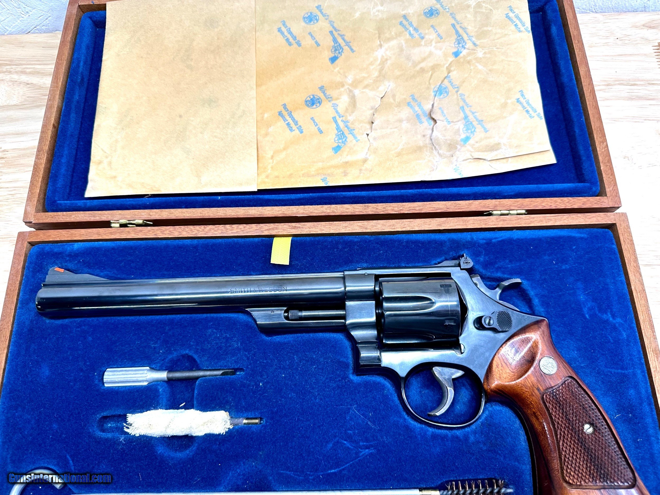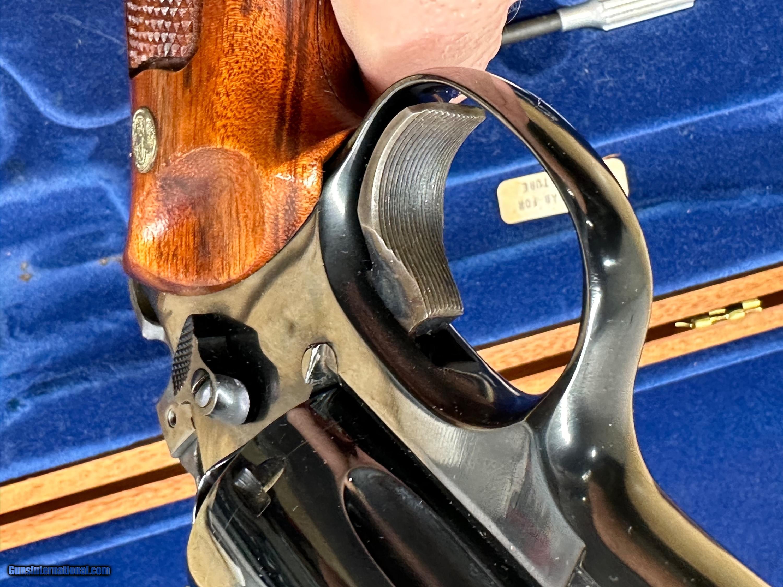 Description: This is a Mint condition Looks like new, Looks potentially unfired. This is a beauty. Features a .500 wide Target Hammer and a .493 wide target trigger and large target grips. THere is no silvering at the end of the barrel like is commonly seen. This comes in the presentation case with original papers and tools. The case shows some wear on the inside and the left hinge needs repair. Has a light score mark on the cylinder from being rotated. Stocks are in excellent condition with no chips or digs or wear. All around gorgeous P&R Revolver Flat 45.00 shipping Price reflects a cash discount of 3.5% Maine Residents add 5.5% sales tax SOLD Manufacturer: Smith and wesson Model: 29-2 Serial Number: N319121 Barrel Length: 8-3/8 Condition: Like New Metal Condition: Like New Wood Condition: Like New Bore Condition: Like New Action: Double action revolver Finish: Blued Manufacture Date: 1975-1976 Extras: Target Model, Papers Tools Presentation case |