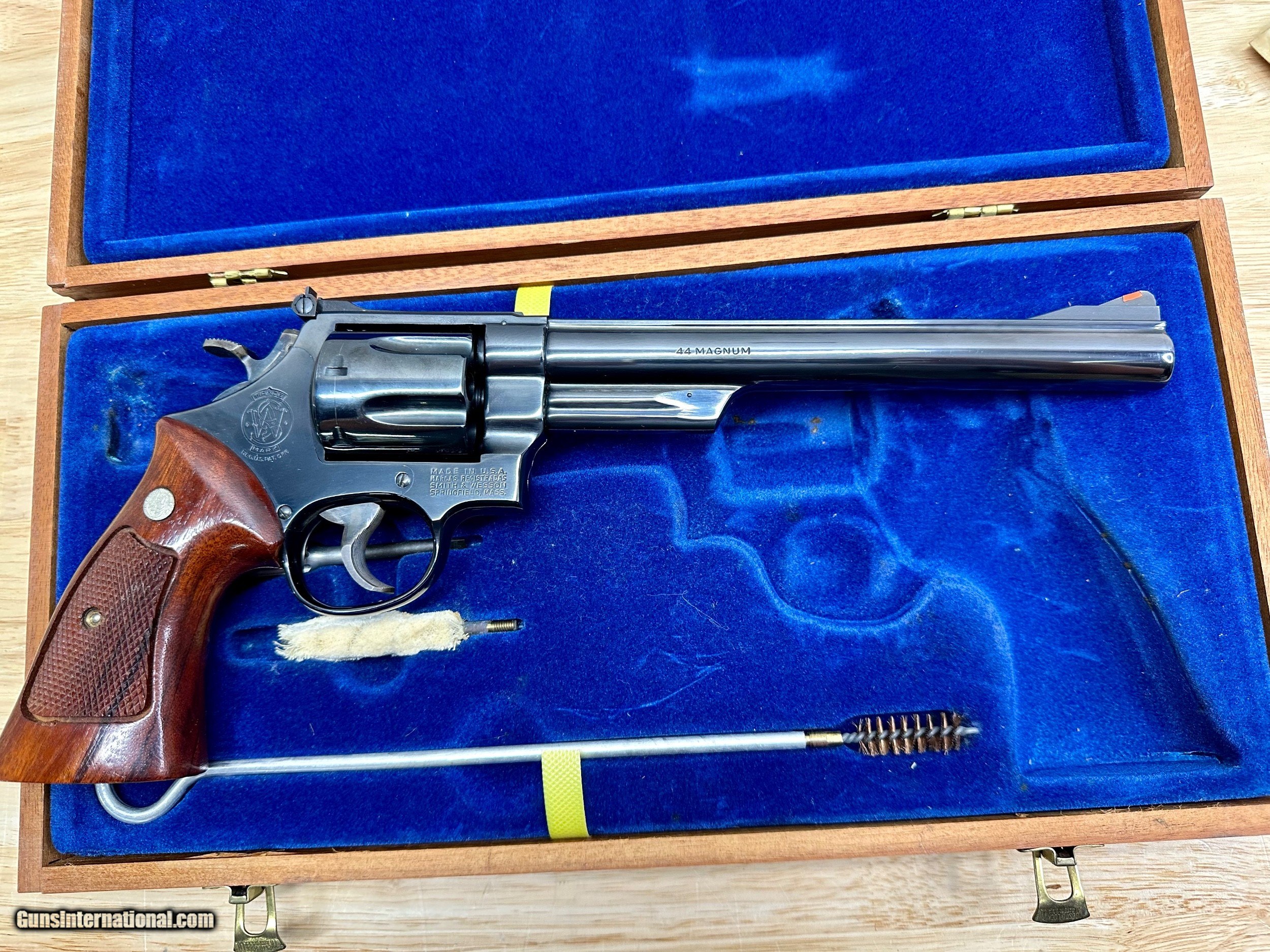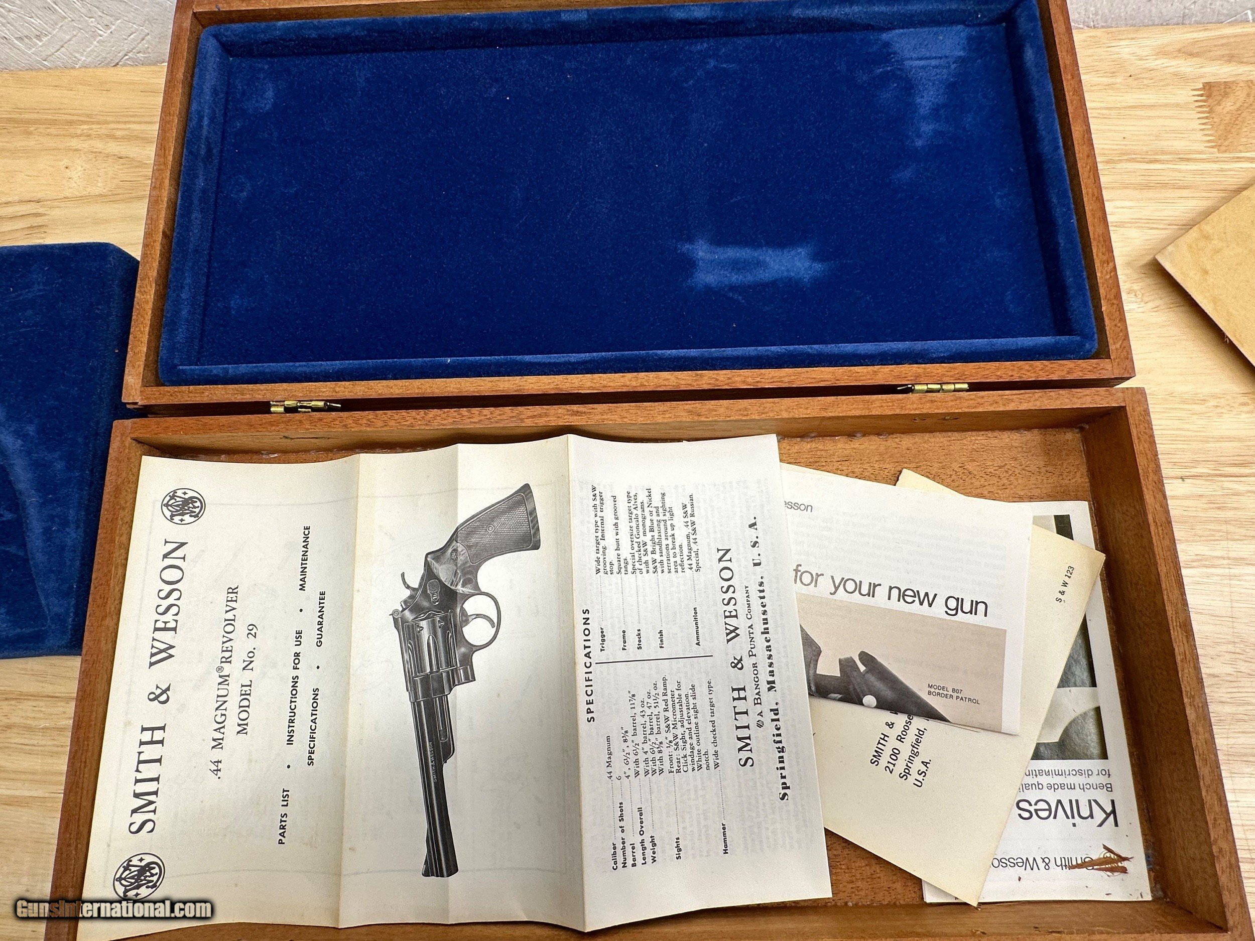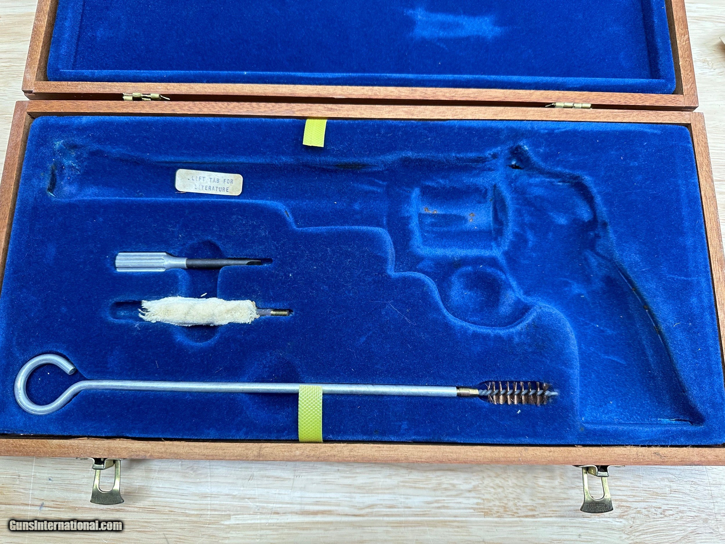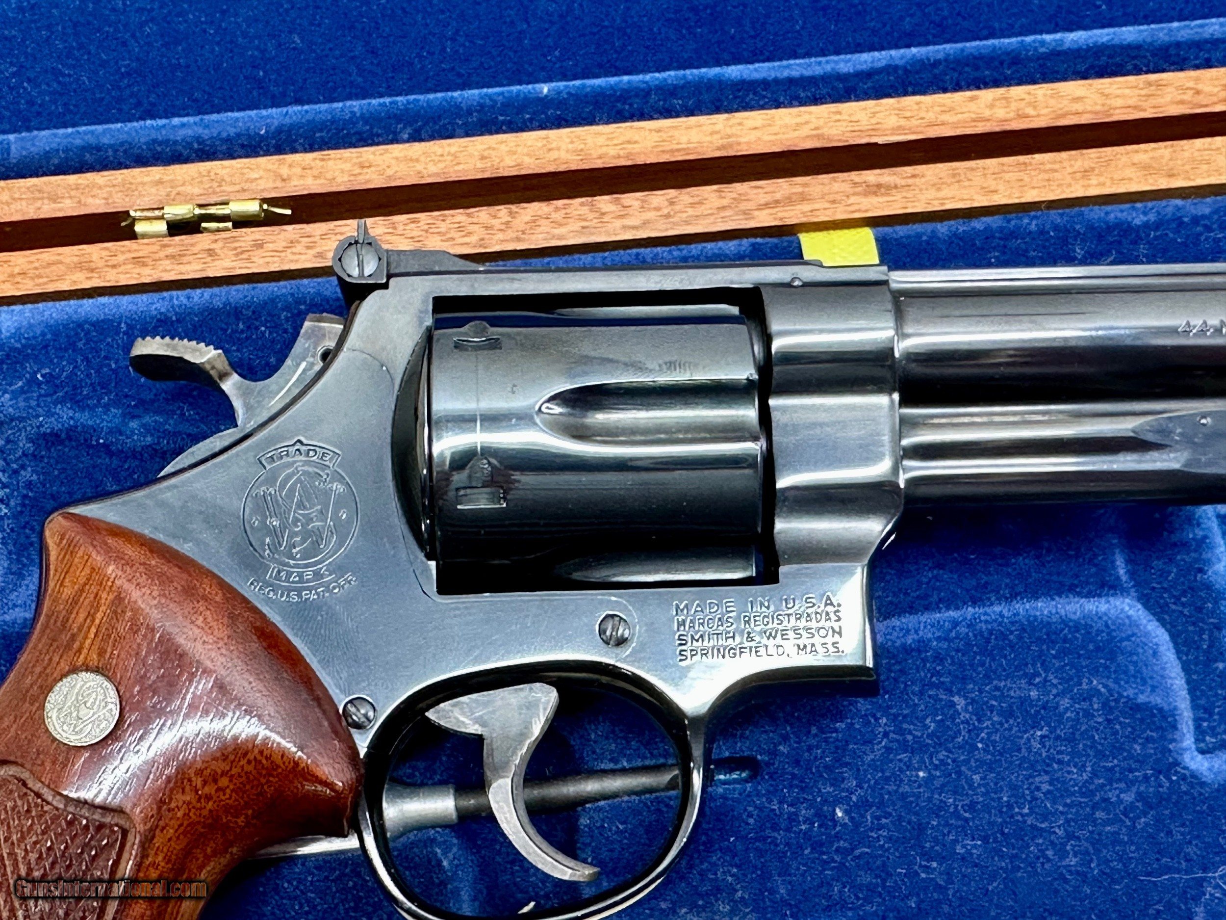 Description: This is a Mint condition Looks like new, Looks potentially unfired. This is a beauty. Features a .500 wide Target Hammer and a .493 wide target trigger and large target grips. THere is no silvering at the end of the barrel like is commonly seen. This comes in the presentation case with original papers and tools. The case shows some wear on the inside and the left hinge needs repair. Has a light score mark on the cylinder from being rotated. Stocks are in excellent condition with no chips or digs or wear. All around gorgeous P&R Revolver Flat 45.00 shipping Price reflects a cash discount of 3.5% Maine Residents add 5.5% sales tax SOLD Manufacturer: Smith and wesson Model: 29-2 Serial Number: N319121 Barrel Length: 8-3/8 Condition: Like New Metal Condition: Like New Wood Condition: Like New Bore Condition: Like New Action: Double action revolver Finish: Blued Manufacture Date: 1975-1976 Extras: Target Model, Papers Tools Presentation case |