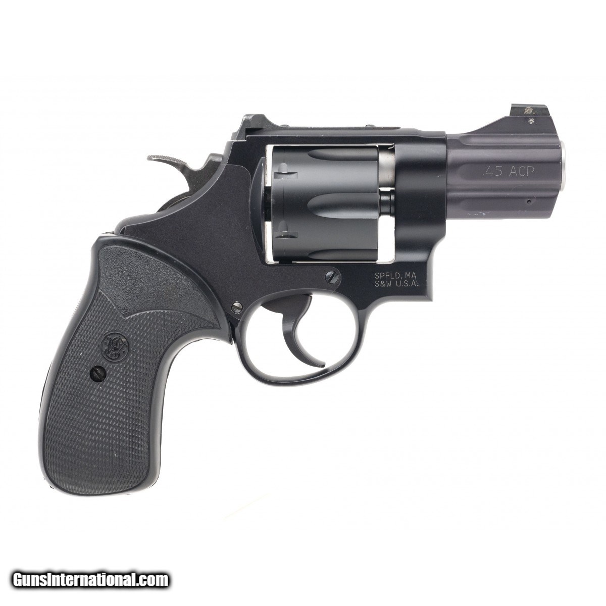 SN: DCL7651. Modern production. Double-action revolver made by Smith and Wesson. 2.75"" barrel with .45 ACP cylinder. Great condition with some small handling marks in the blue and grey two-tone finish. Action functions correctly. Comes with original box.
