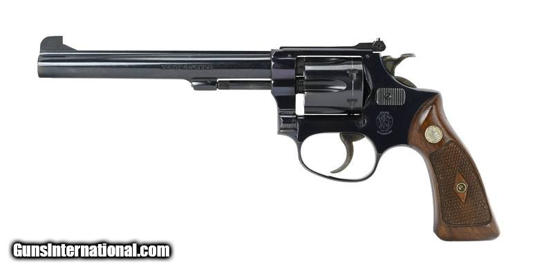 Smith & Wesson 35 .22 LR caliber revolver. Desirable target kit gun with 6" barrel. 1960’s production. Correct diamond grips and flat latch. Very good overall condition.