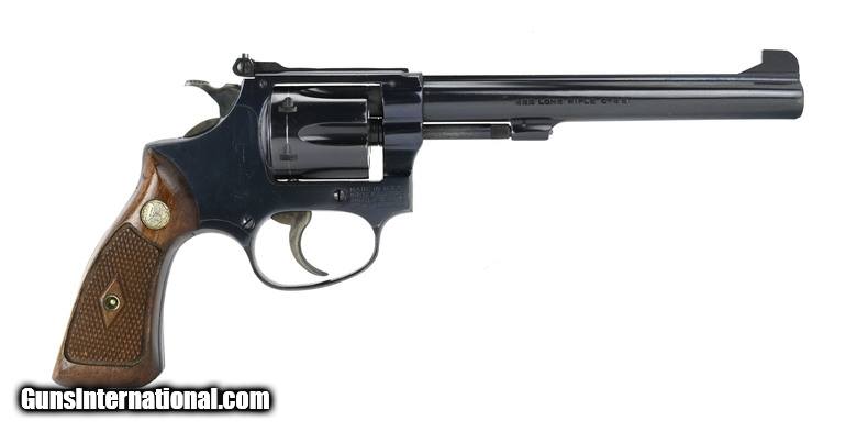 Description: " Smith & Wesson 35 .22 LR caliber revolver. Desirable target kit gun with 6" barrel. 1960’s production. Correct diamond grips and flat latch. Very good overall condition. SOLD |
