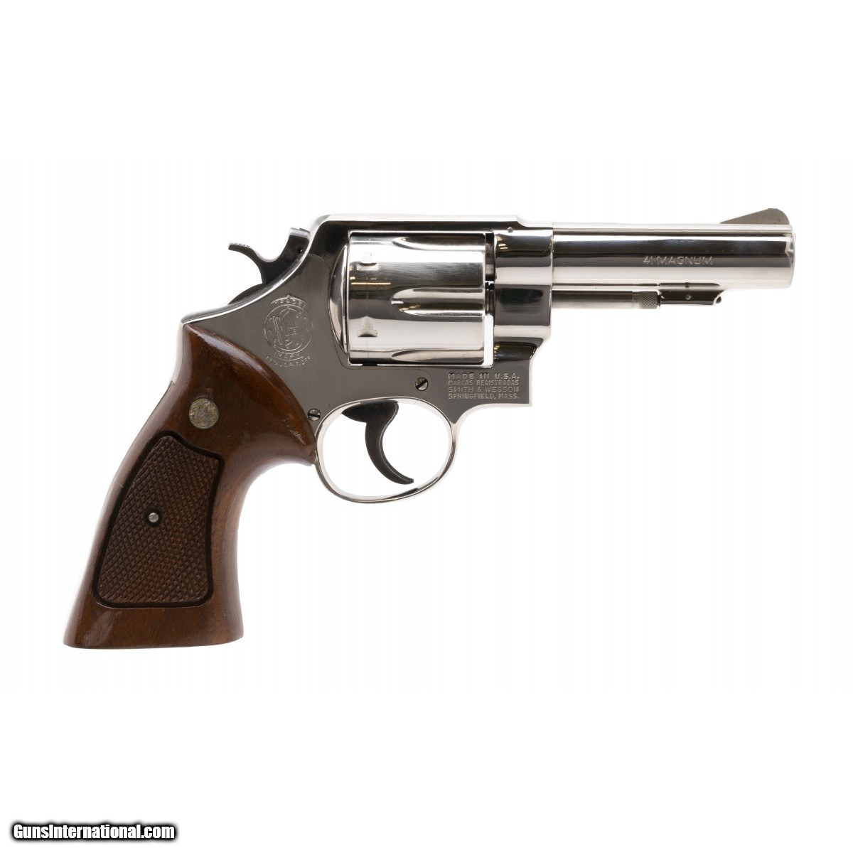 Scarce 4"" nickel plated N-frame service revolver. 1970's vintage with pinned barrel and recessed cylinder. Has a few light scuff marks in the finish, probably from a holster. Overall very good condition.