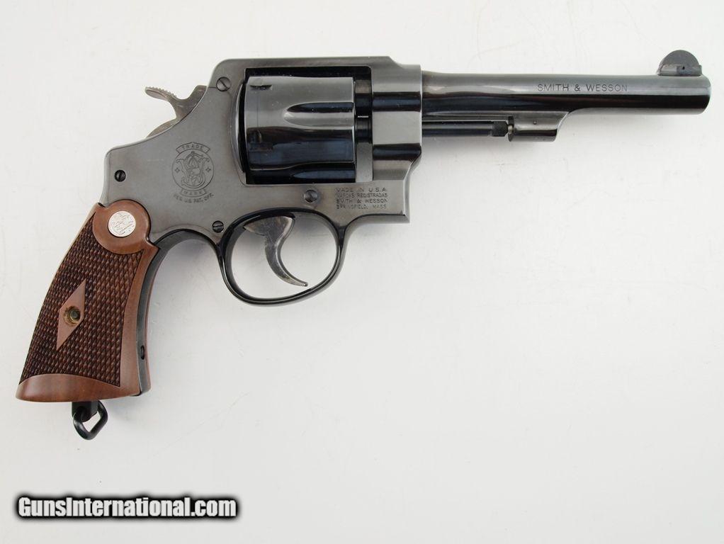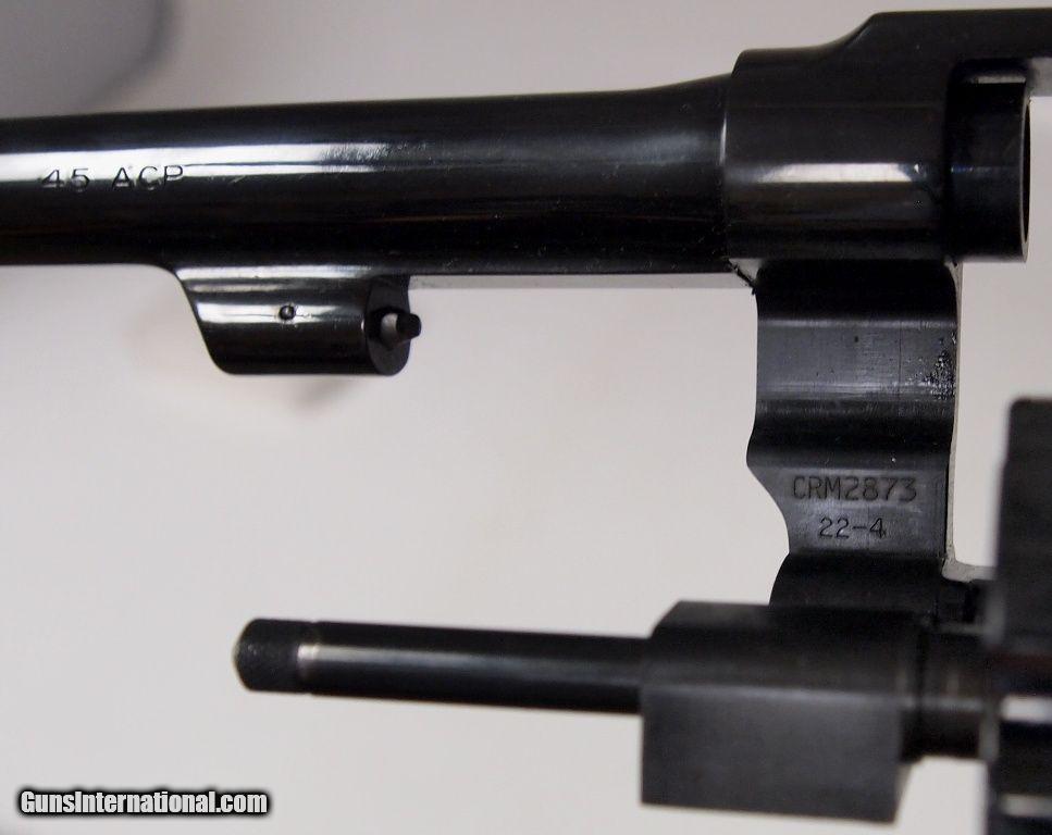 Description: S&W 22-4 WBox .45 ACP, 5" bbl, shiny bore, good rifling, blade front sight, notched rear sight, blued finish, 25 moon clips included, color case hardened smooth trigger - knurled hammer, lanyard loop, and very nice S&W K Frame Hand Ejector Stocks. Excellent revolver for your collection. Add 3% for Credit Card Shipping $25.00 SOLD |