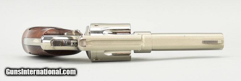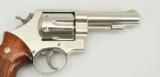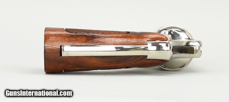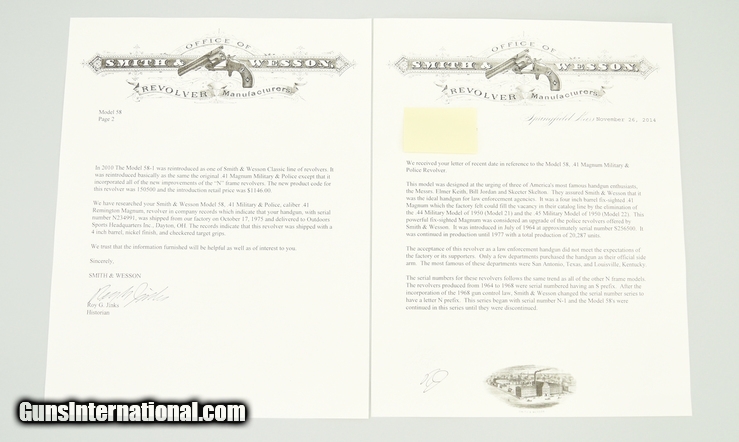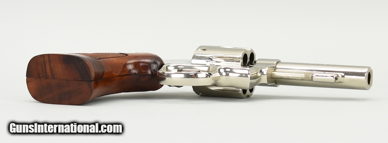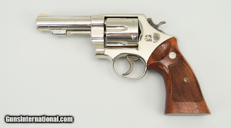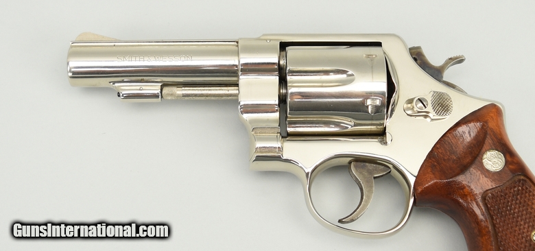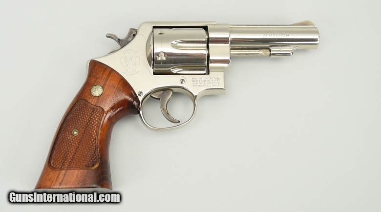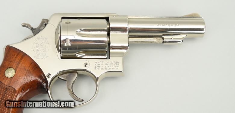 Smith & Wesson 58 .41 Magnum caliber revolver. Rare 4” nickel service revolver made in 1975. Excellent overall condition with excellent bore and tight action. Comes with factory letter confirming the finish and target grips.