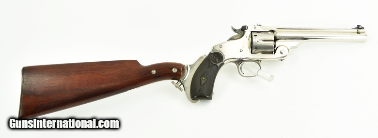 South Australian Smith & Wesson No. 3 Russian. Barrel: 6.5” long, Caliber: 44R. Fitted with contemporary target sights. Both gun and shoulder stock are marked 12661 and a broad arrow.